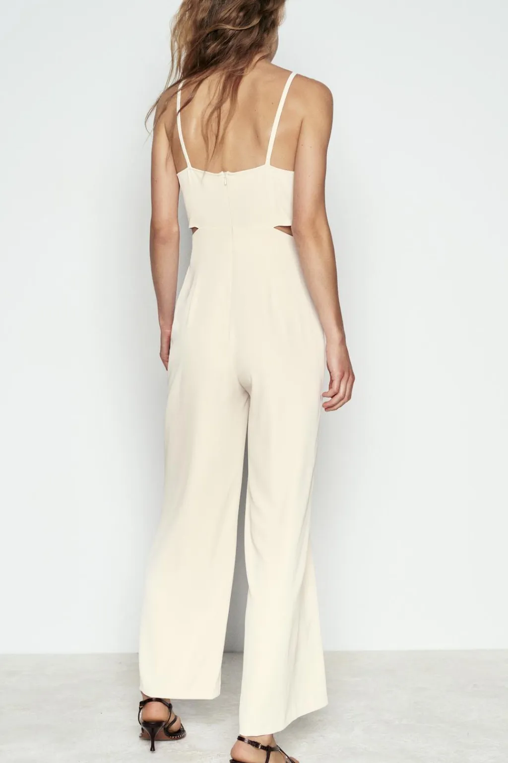 Mono de escote pico y tirantes finos con apliques dorados. Cintura con frunces delanteros y aberturas laterales. Pernera ancha. Cierre en espalda con cremallera oculta en costura.