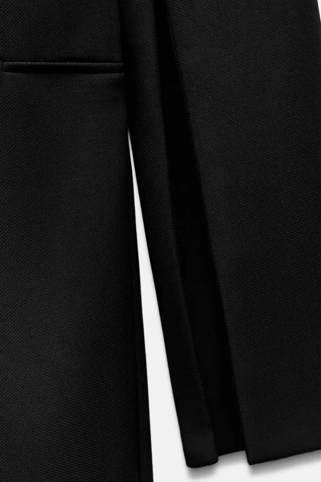 Mono largo de cuello redondo y manga larga acabada en aberturas. Pierna ancha. Cierre en espalda con cremallera oculta en costura.