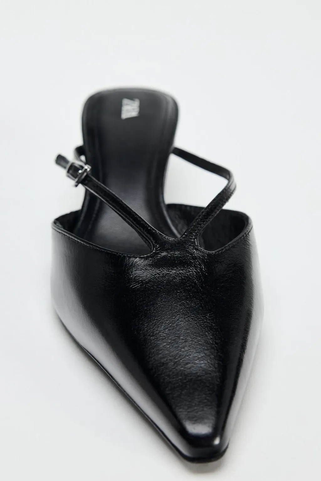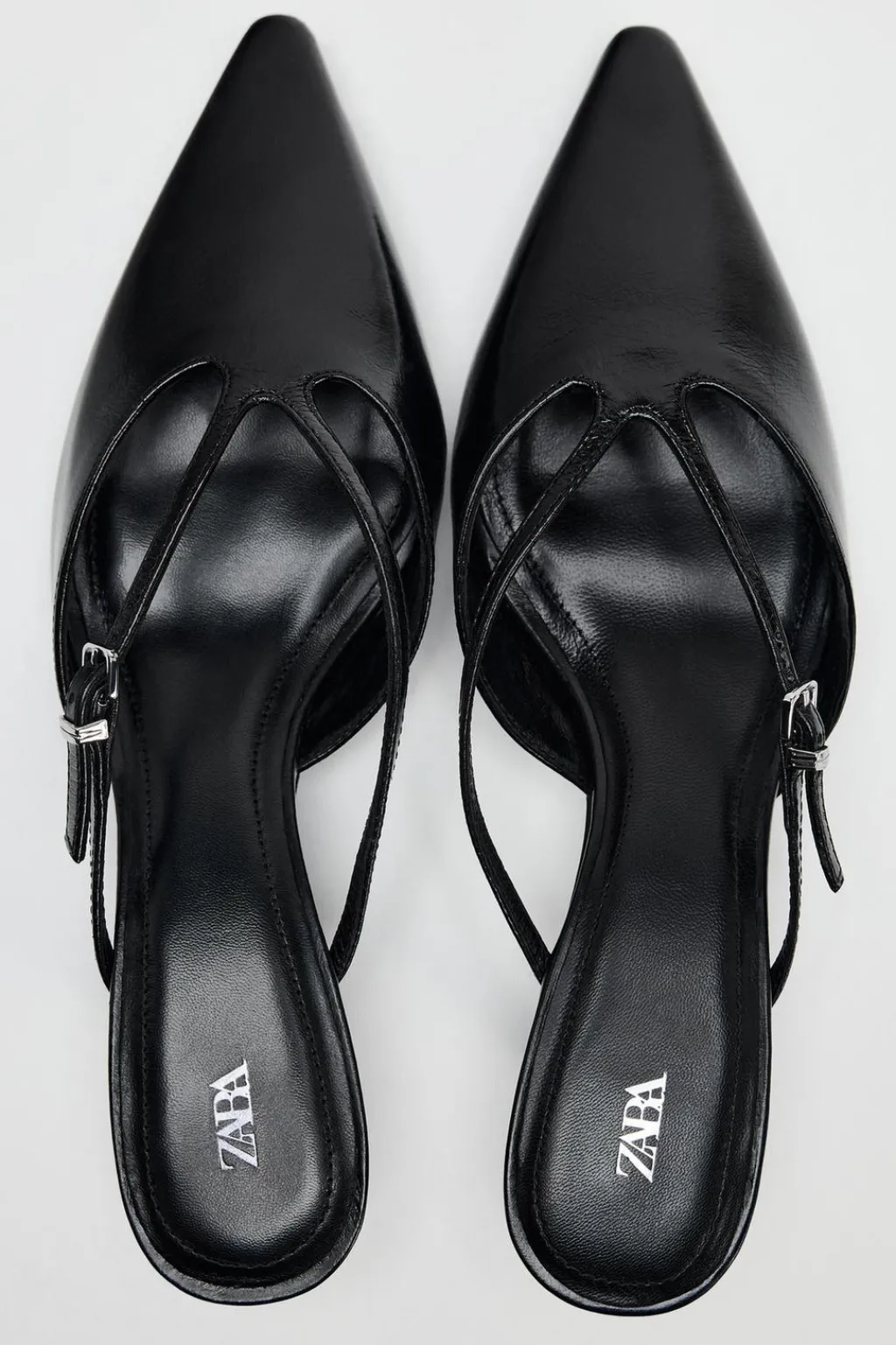 Zapato tacón tipo mule destalonado en piel. Detalle tiras con hebilla en la parte delantera. Tacón kitten. Acabado en punta.