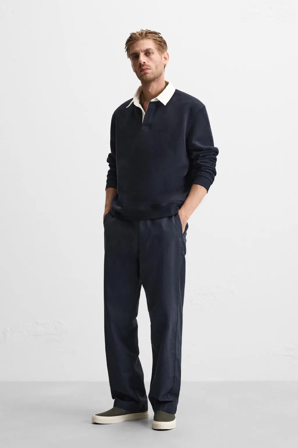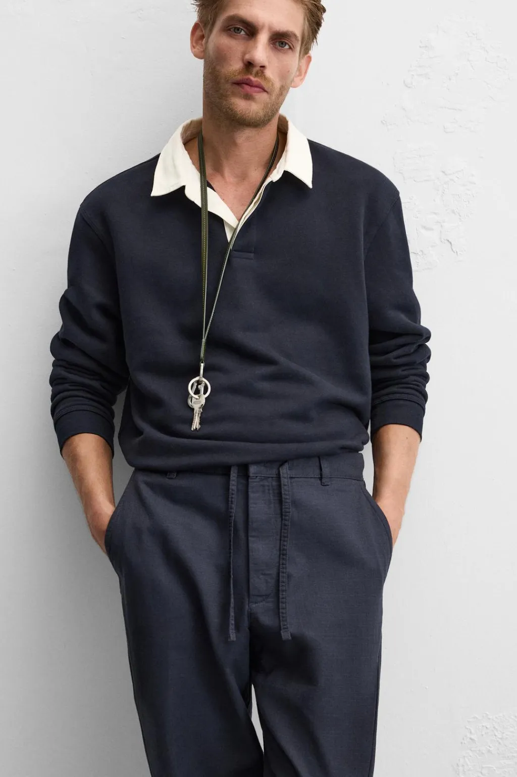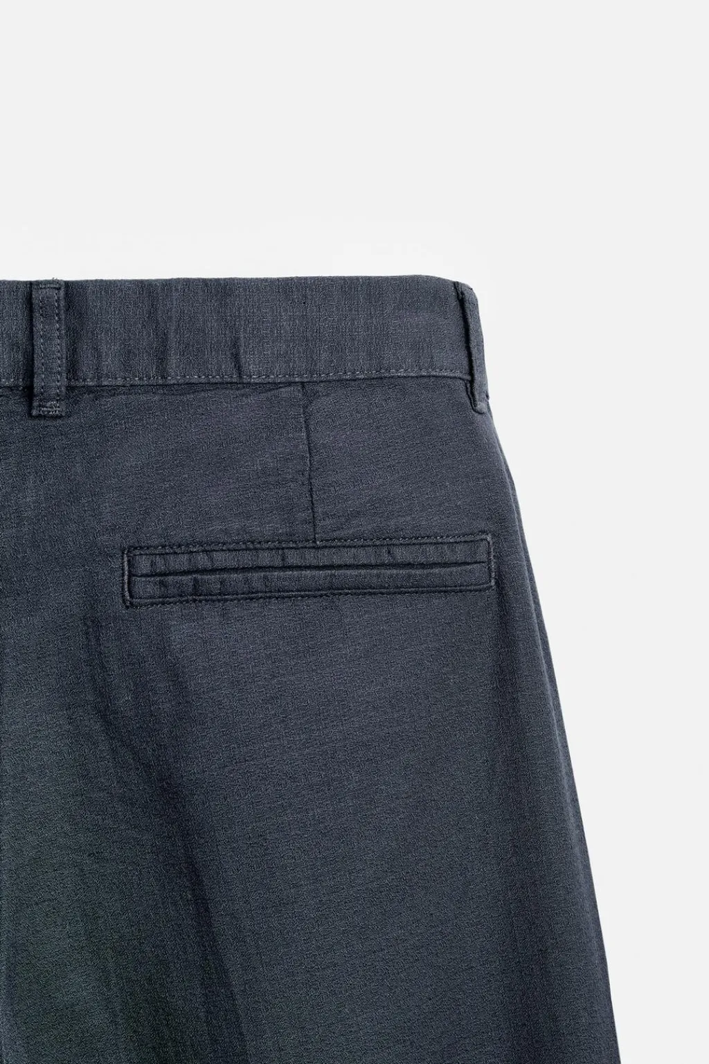 Pantalón straight fit confeccionado en tejido con mezcla de algodón y lino. Cintura ajustable con cordón. Bolsillos laterales y detalle de bolsillos traseros de doble vivo. Efecto lavado. Cierre frontal con cremallera y gancho metálico oculto.