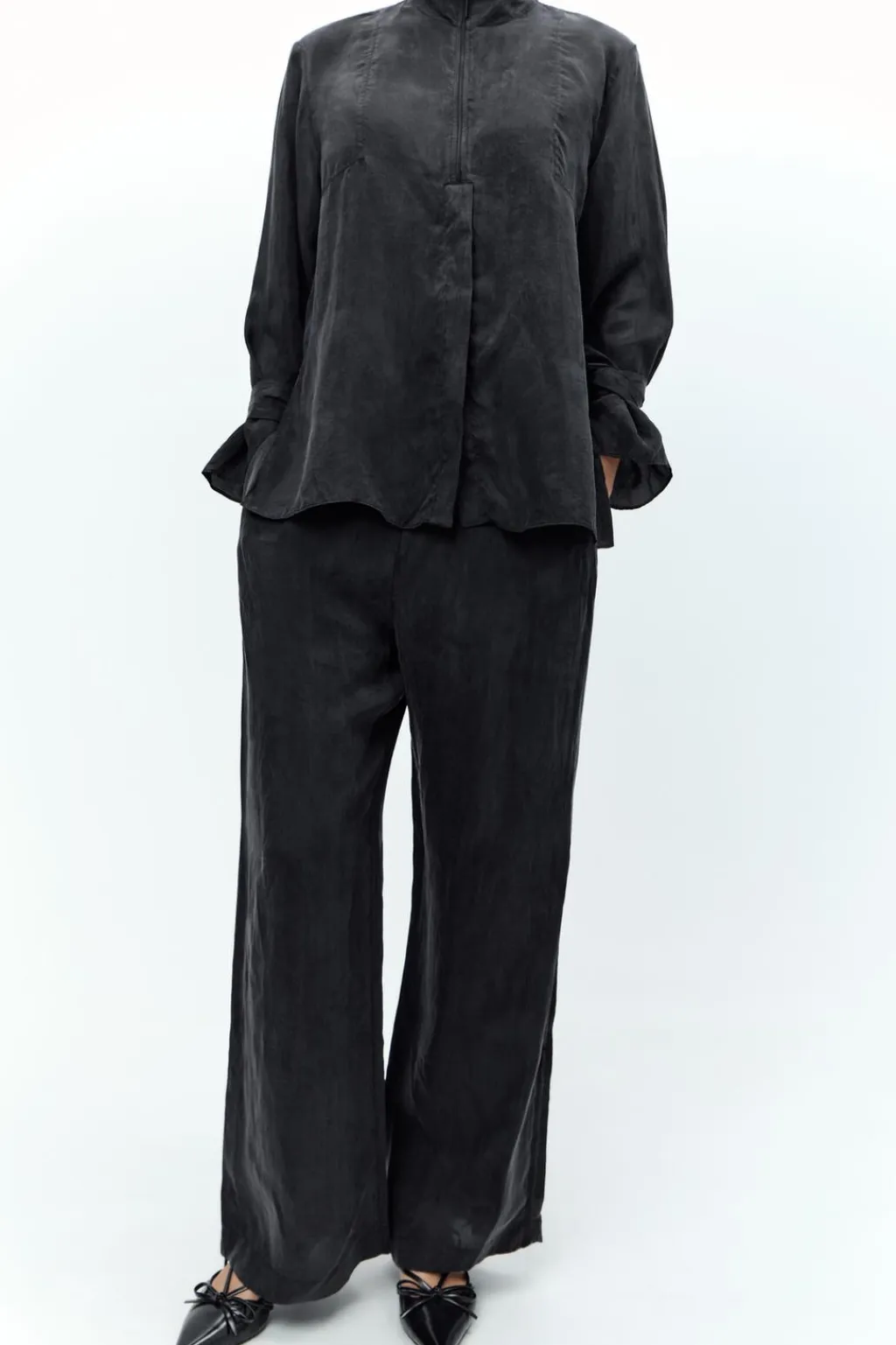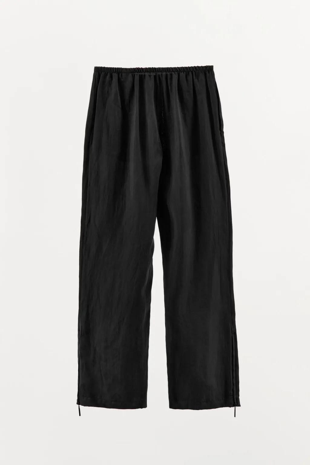 Pantalón confeccionado en hilatura de lyocell 100%. Tiro medio con pinzas delanteras y elástico en espalda. Bolsillos laterales. Pierna ancha acabada en cremallera metálica.