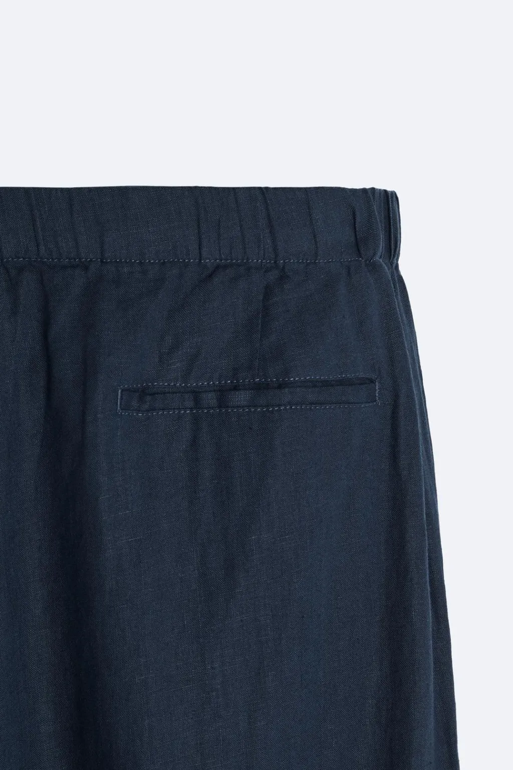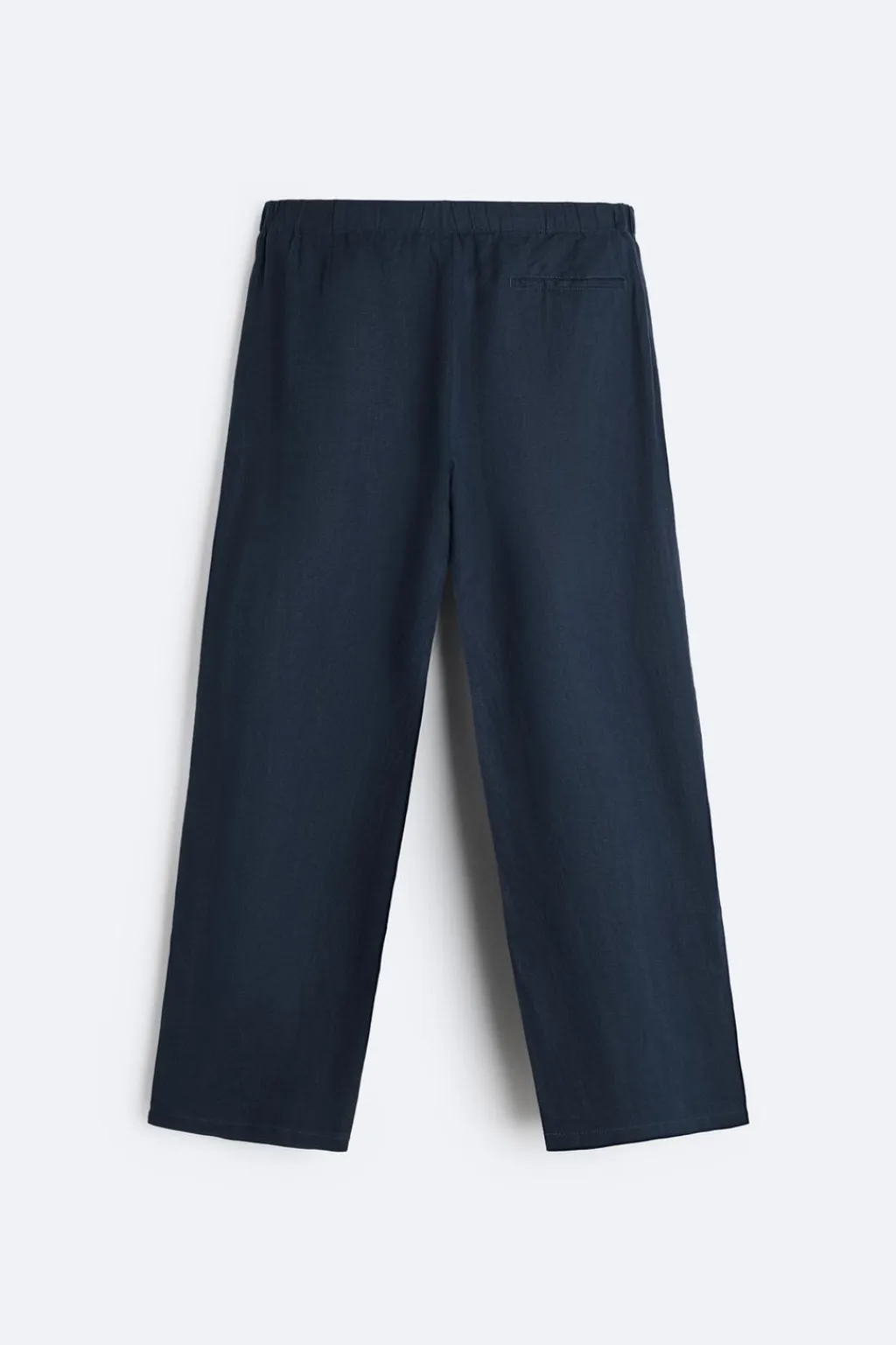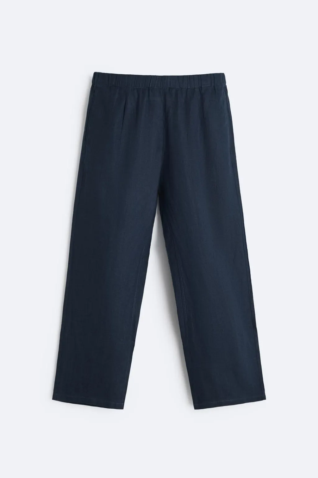Pantalón relaxed fit confeccionado en tejido de lino. Cintura elástica ajustable con cordón interior y detalle de pliegues frontales. Bolsillos laterales en cadera y detalle de bolsillo trasero de vivo.