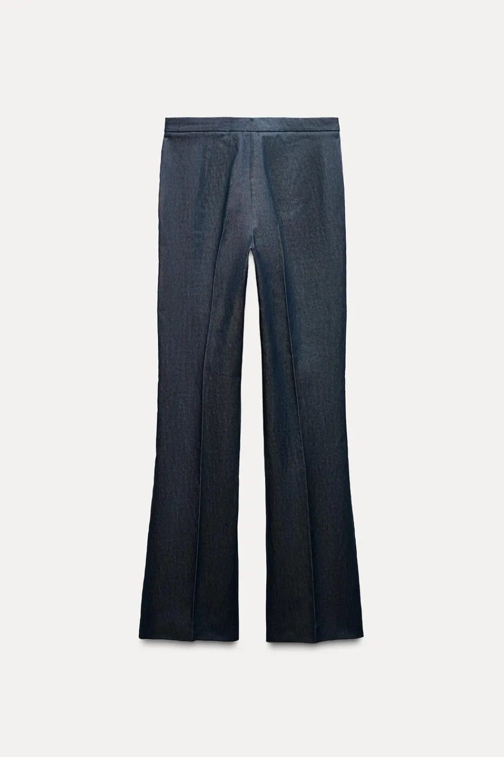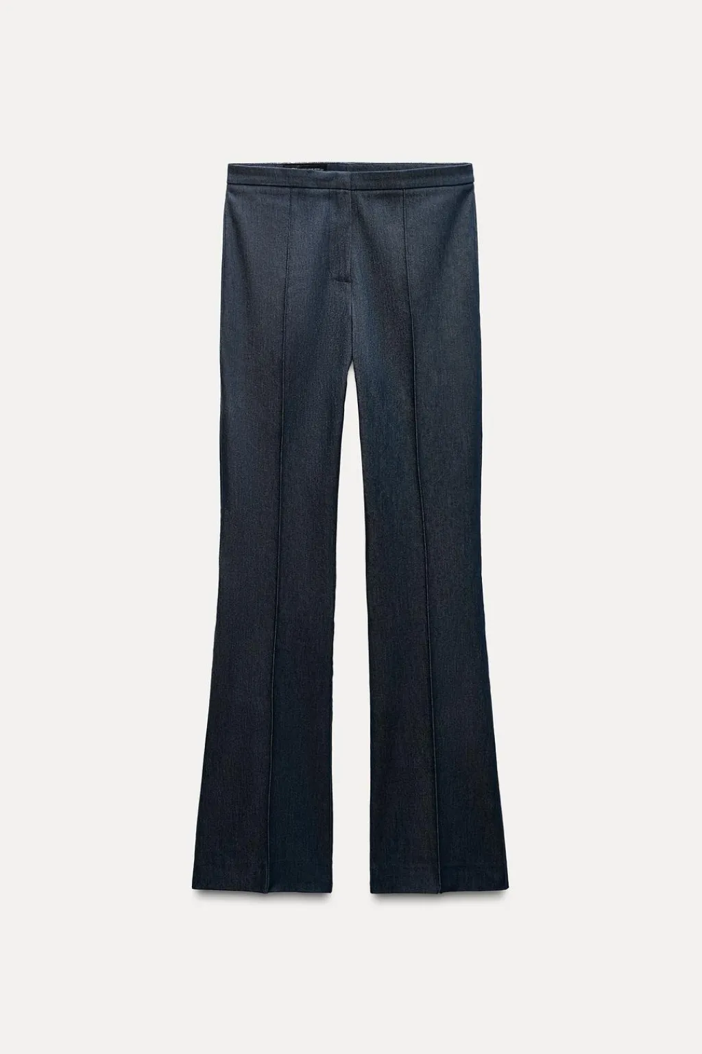 Pantalón de tiro alto. Bajo en evasé. Detalle de costura marcada. Cierre frontal con cremallera, botón interior y gancho.