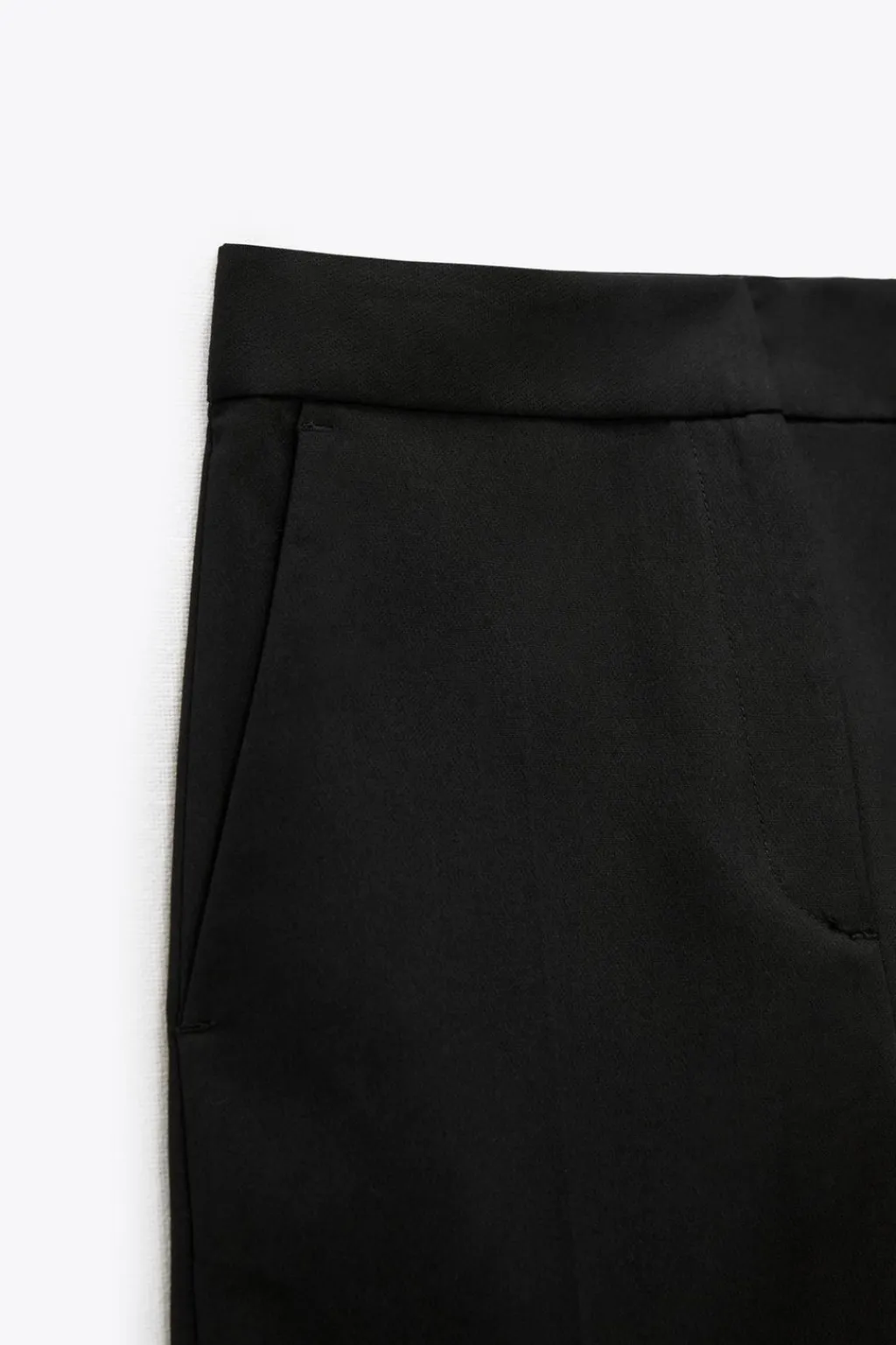 Pantalón pitillo de tiro medio con cintura elástica en espalda. Bolsillos frontales y falsos bolsillos de vivo en espalda. Bajo con aberturas laterales. Cierre frontal con cremallera, botón interior y gancho metálico.