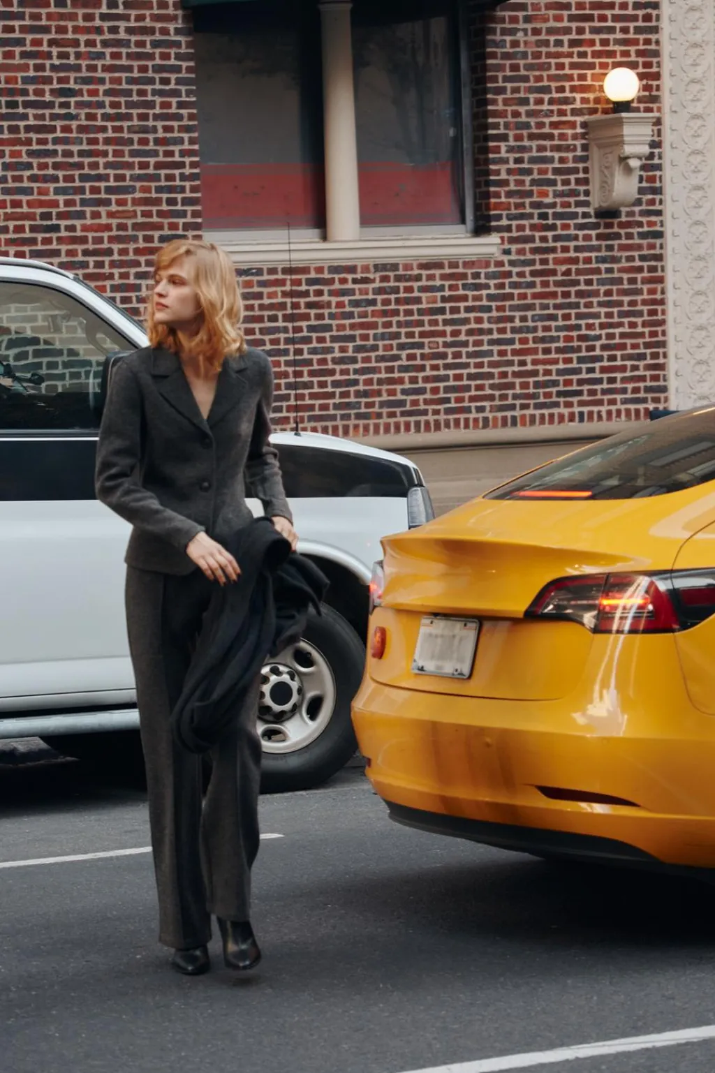 Pantalón de tiro medio y cintura con elástico interior. Detalle de nervio delantero. Bajo acabado en línea evasé.