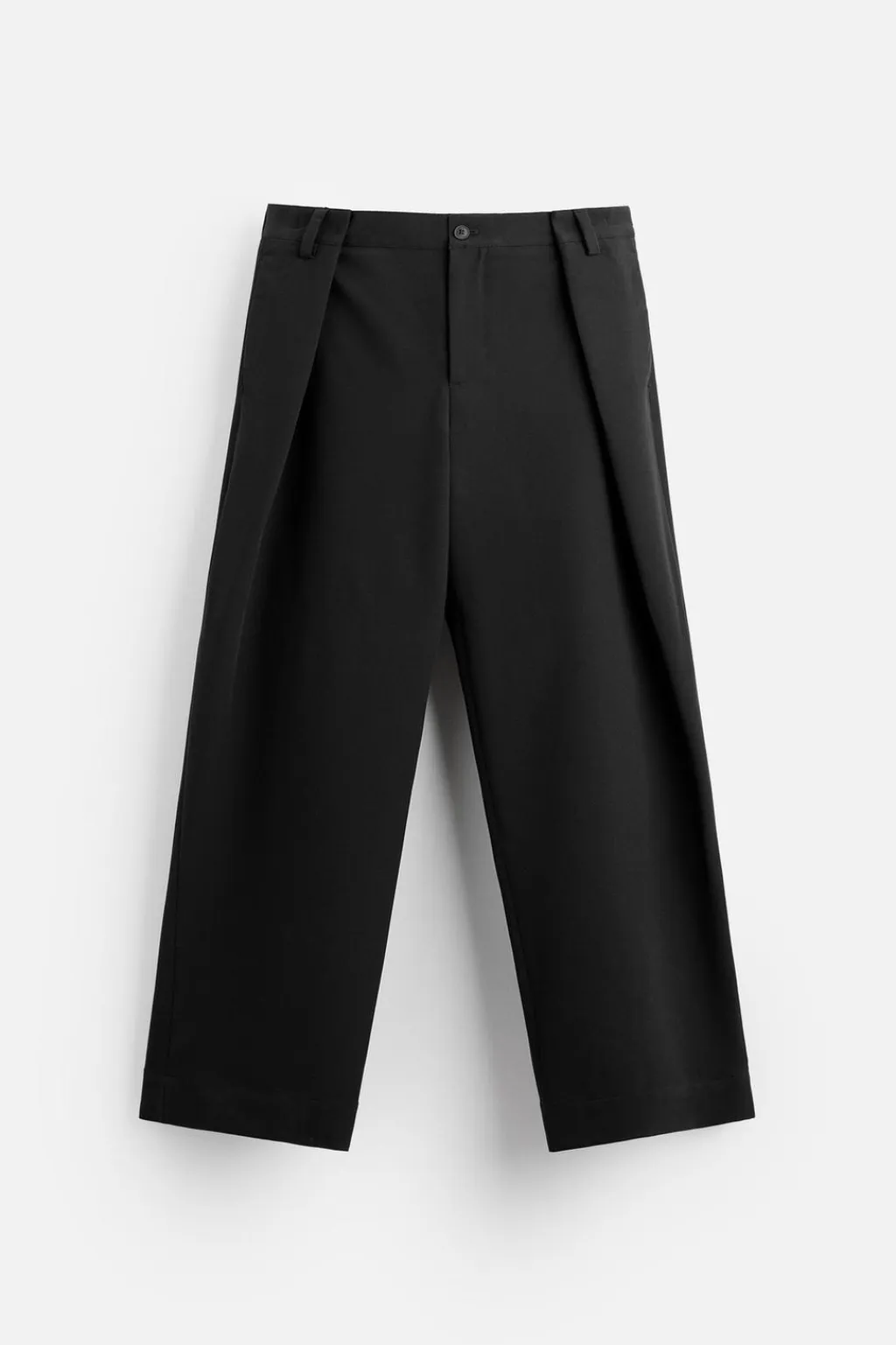 Pantalón oversize fit. Cintura con detalle de pliegues en delantero. Bolsillos frontales y detalle de bolsillos traseros de doble vivo. Cierre frontal con cremallera y botón.