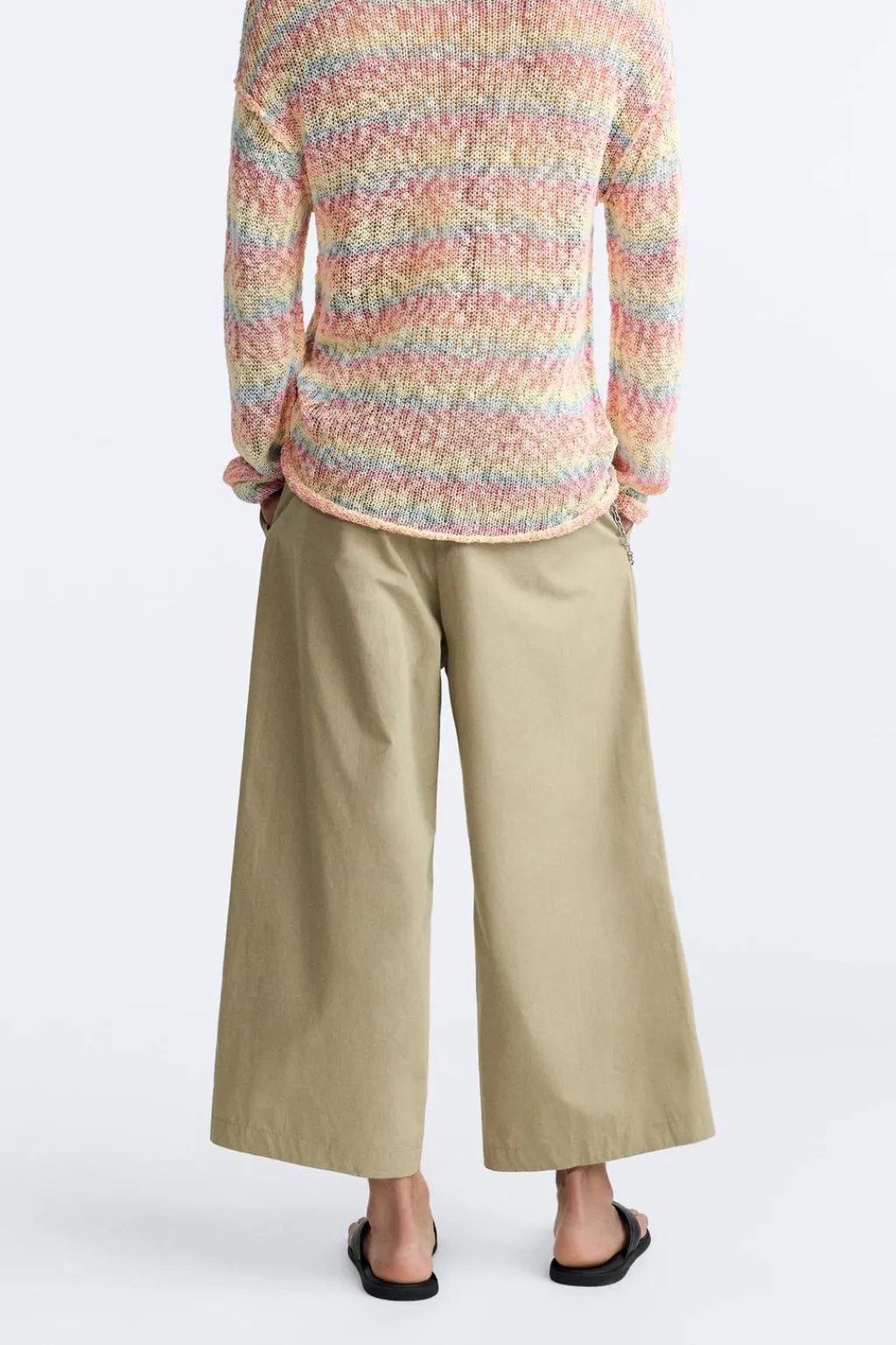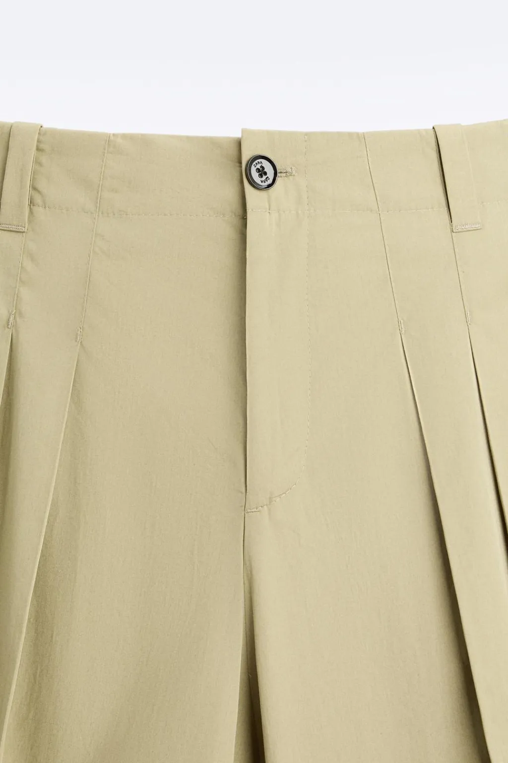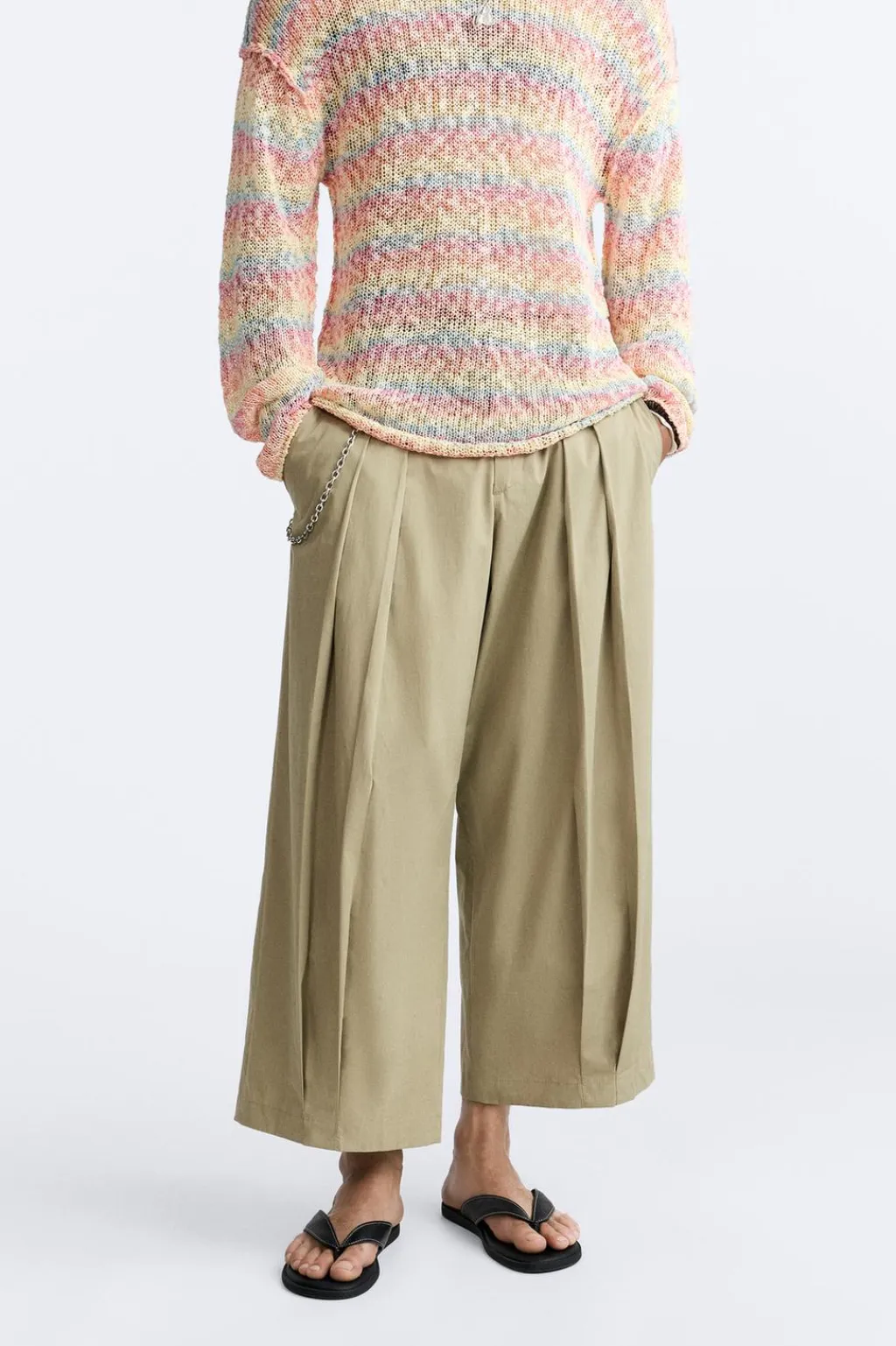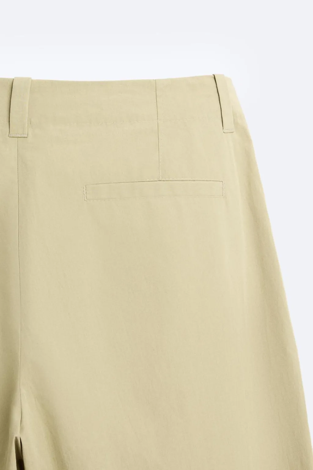 Pantalón cropped fit confeccionado en tejido de algodón. Cintura con detalle de pliegues dobles frontales. Bolsillos en delantero y detalle de bolsillos traseros de vivo. Cierre frontal con cremallera y botón.