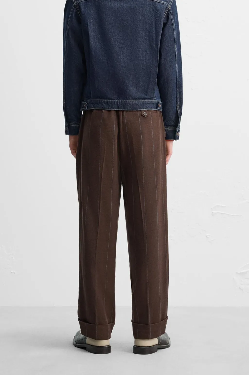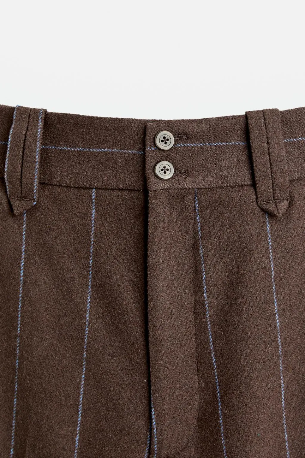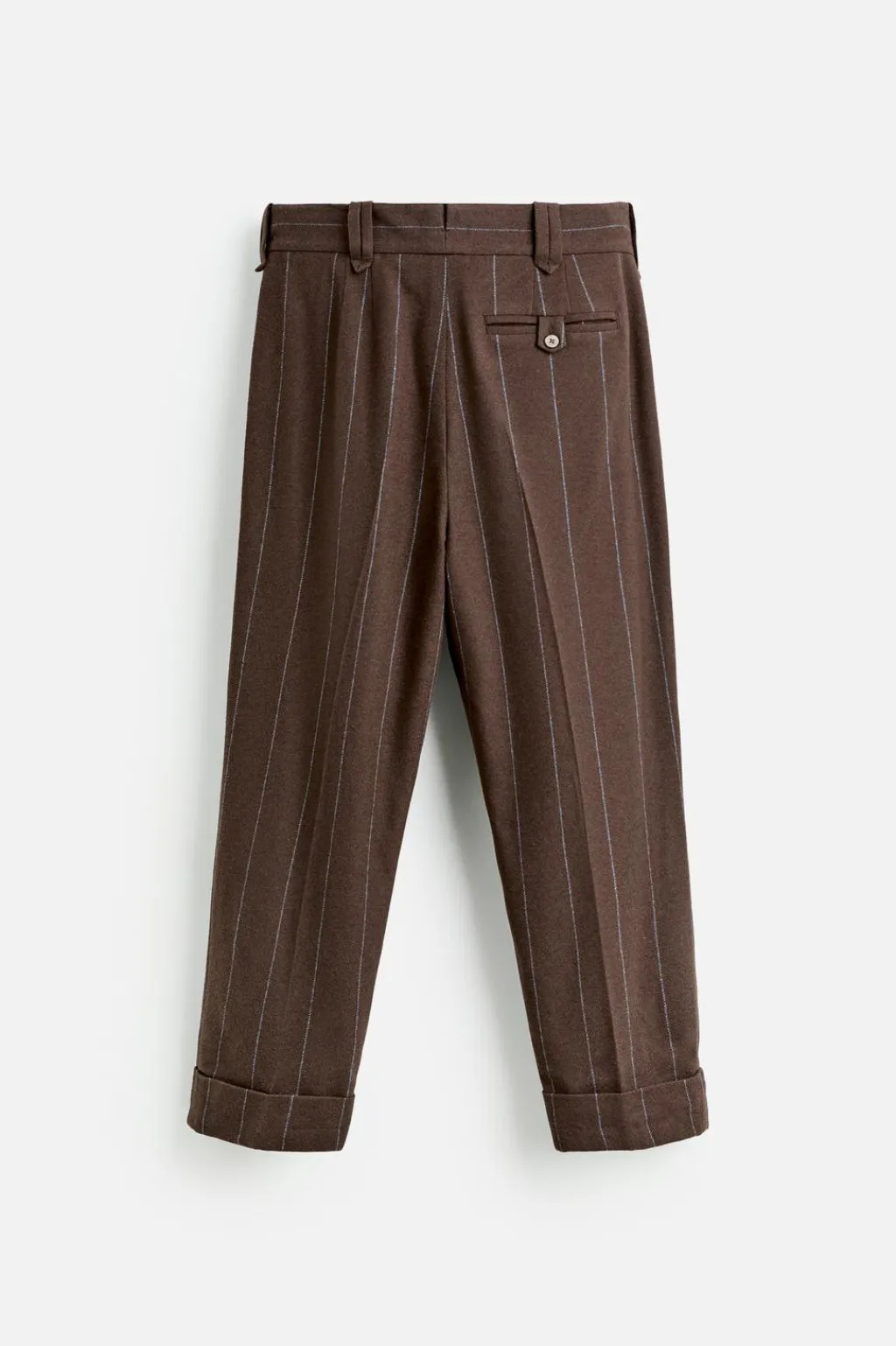 Pantalón de tiro alto. Bolsillos frontales y detalle de bolsillo trasero con botón. Bajo acabado con vuelta. Cierre frontal con cremallera y botones.