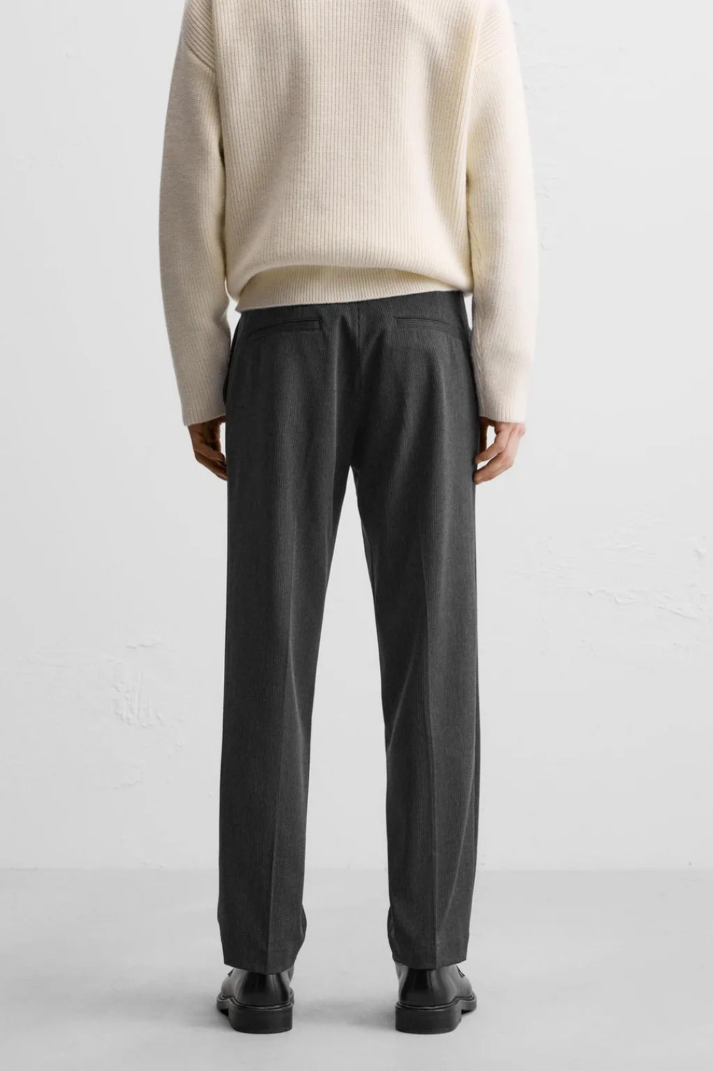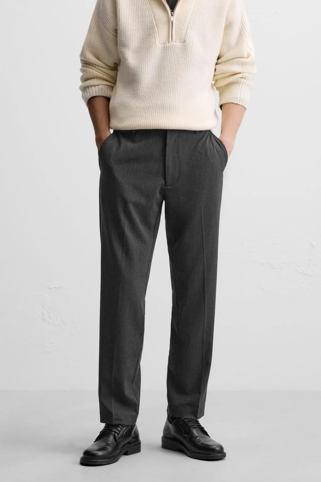 Pantalón straight fit. Bolsillos frontales y detalle de bolsillos traseros de vivo. Cierre frontal con cremallera y gancho metálico oculto.
