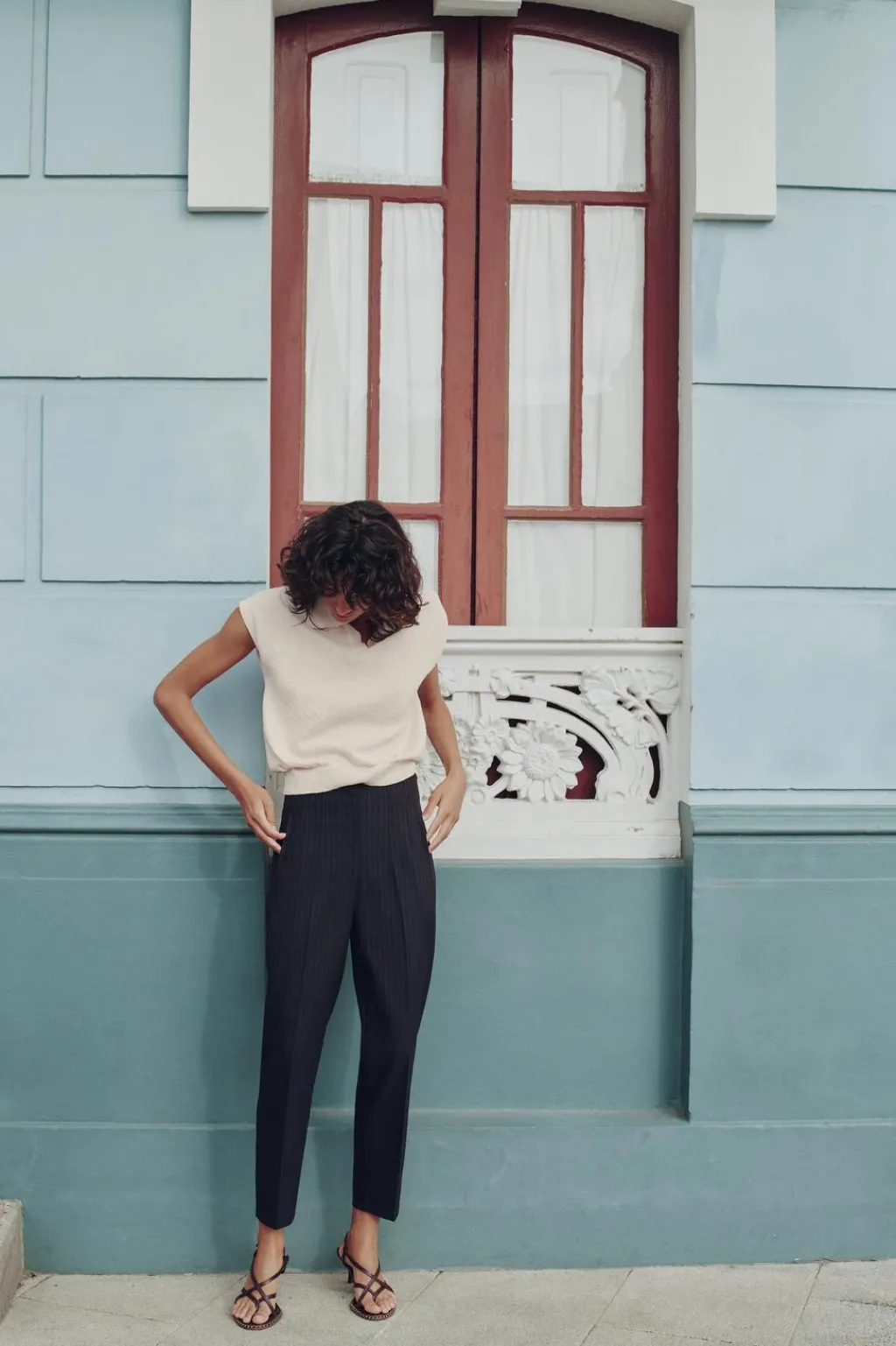 Pantalón tobillero de tiro alto. Bolsillos delanteros de vivo. Cierre frontal con cremallera, botón interior y gancho metálico.