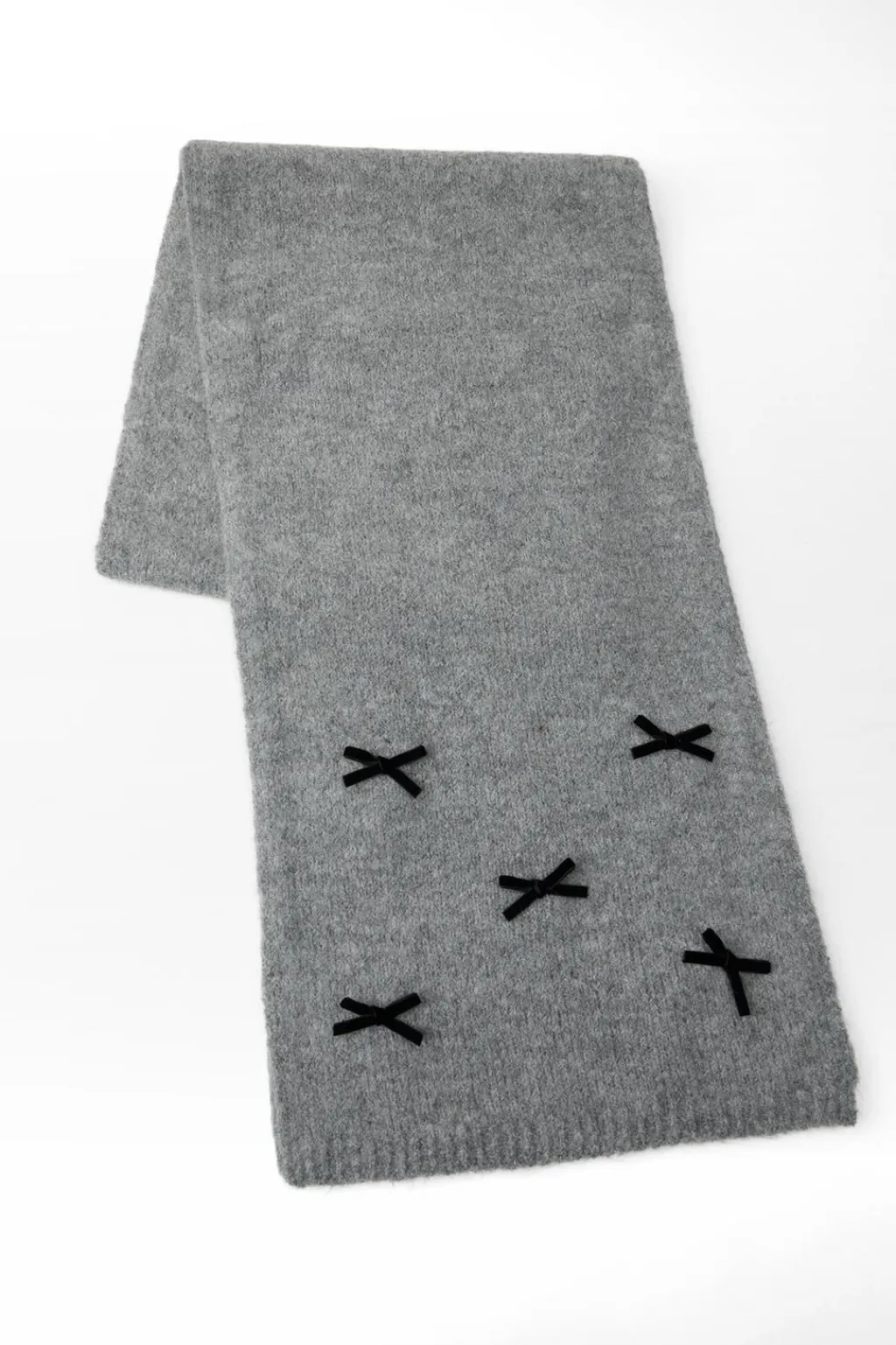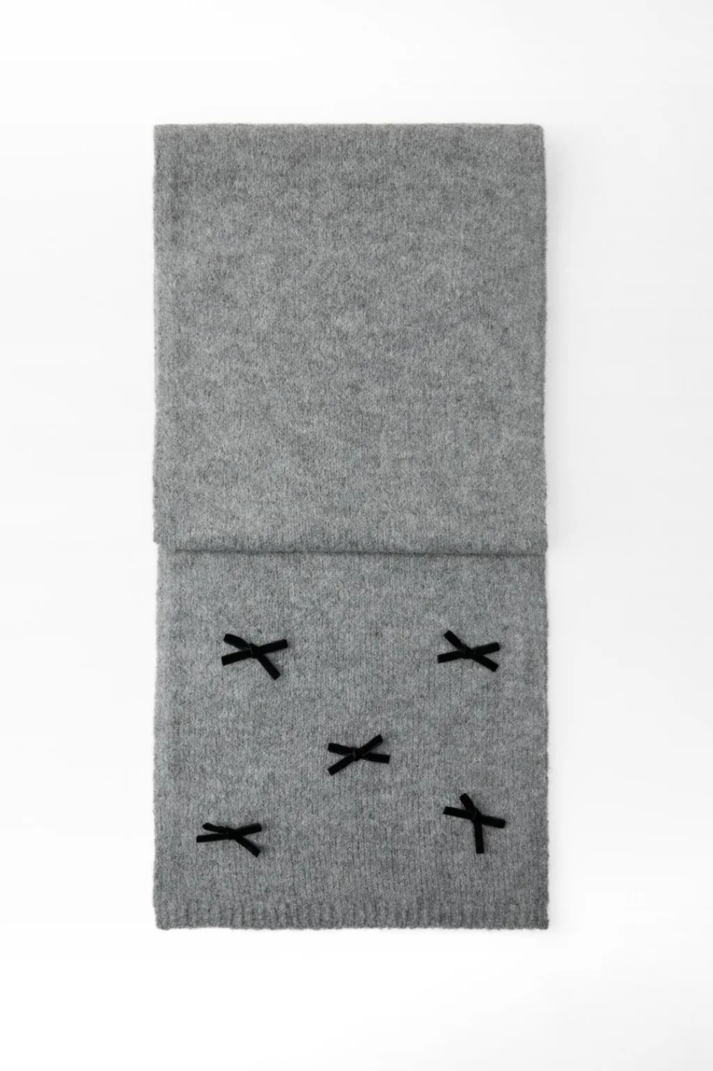 Pañuelo confeccionado con lana 8%y alpaca 8%. Detalle aplicación de lazos en terciopelo combinados a contraste.