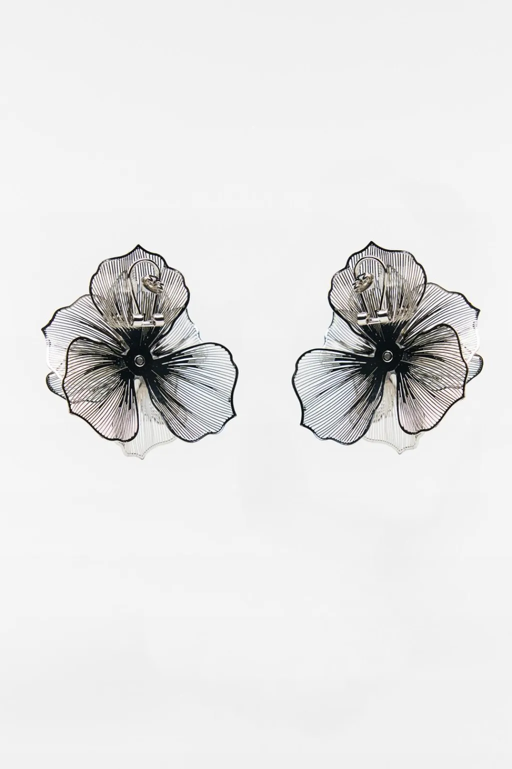 Pendientes metálicos con forma de flor en relieve. Acabados con línea esmaltada a contraste. Detalle aplicación de brillos. Cierre con tuerca y clip.