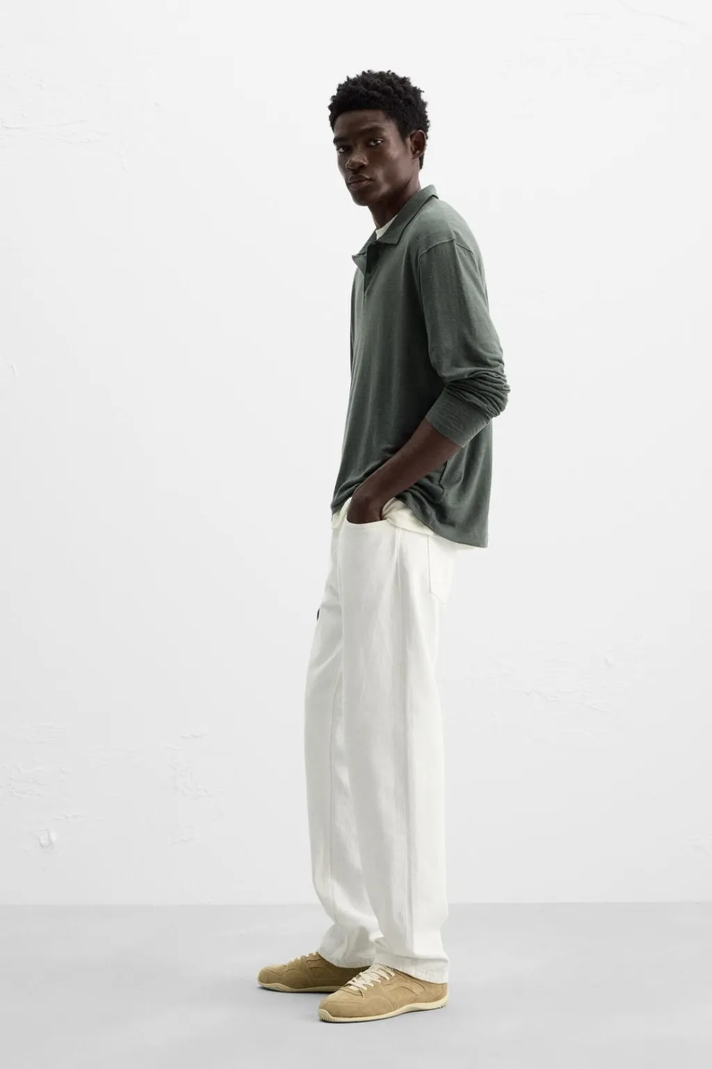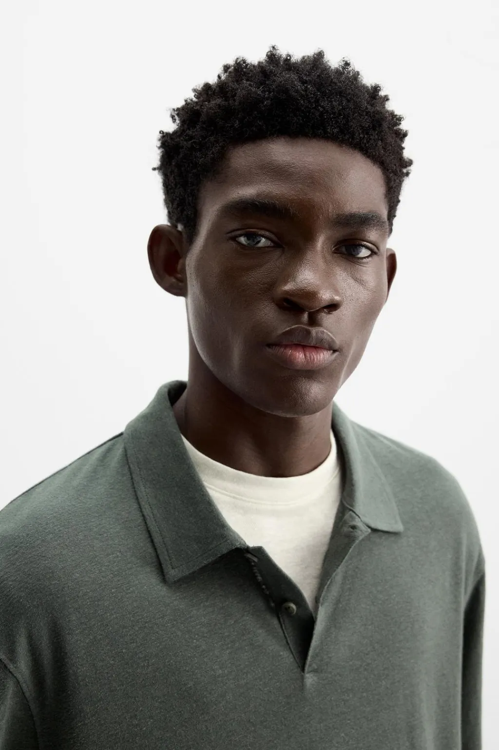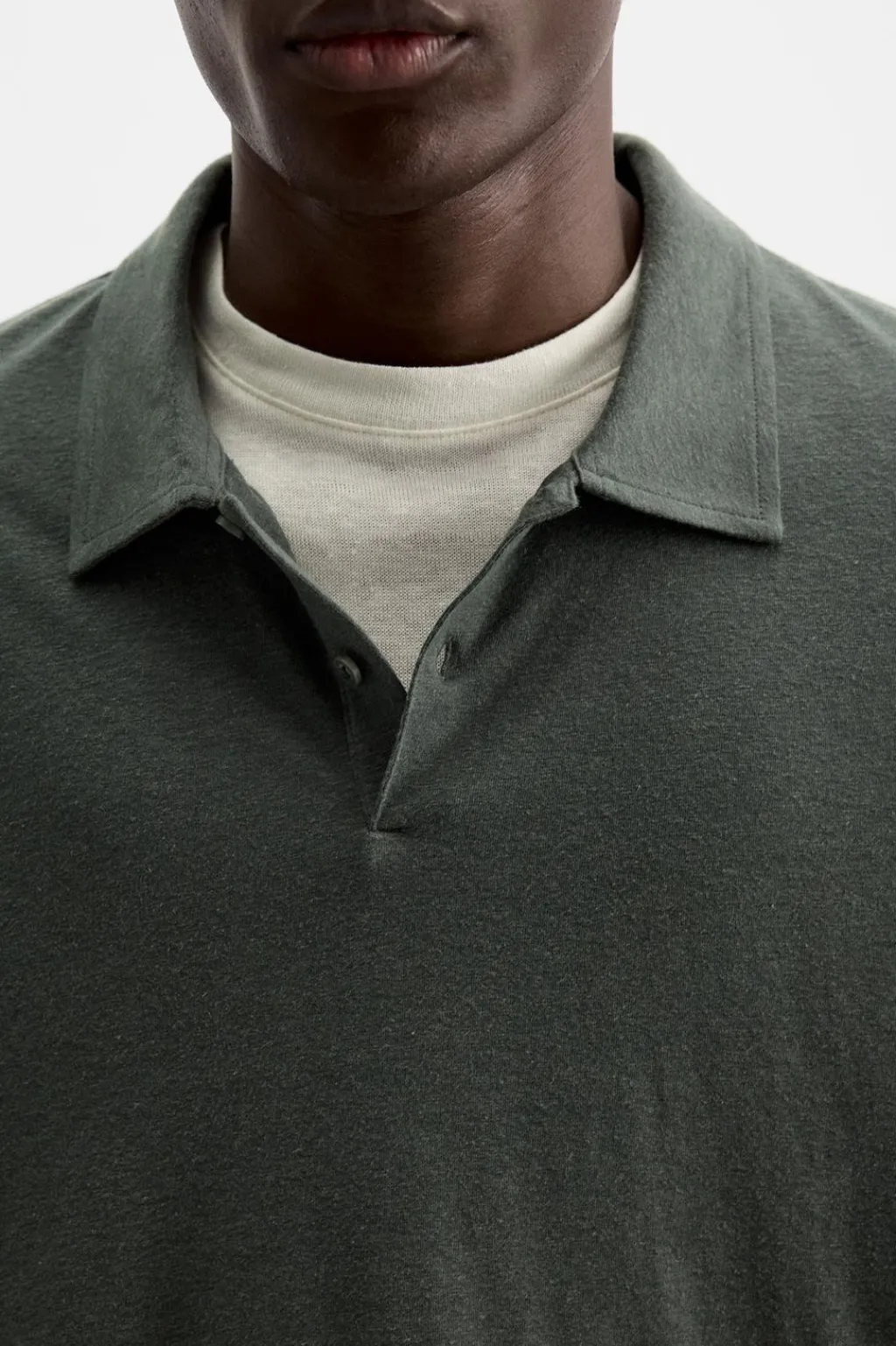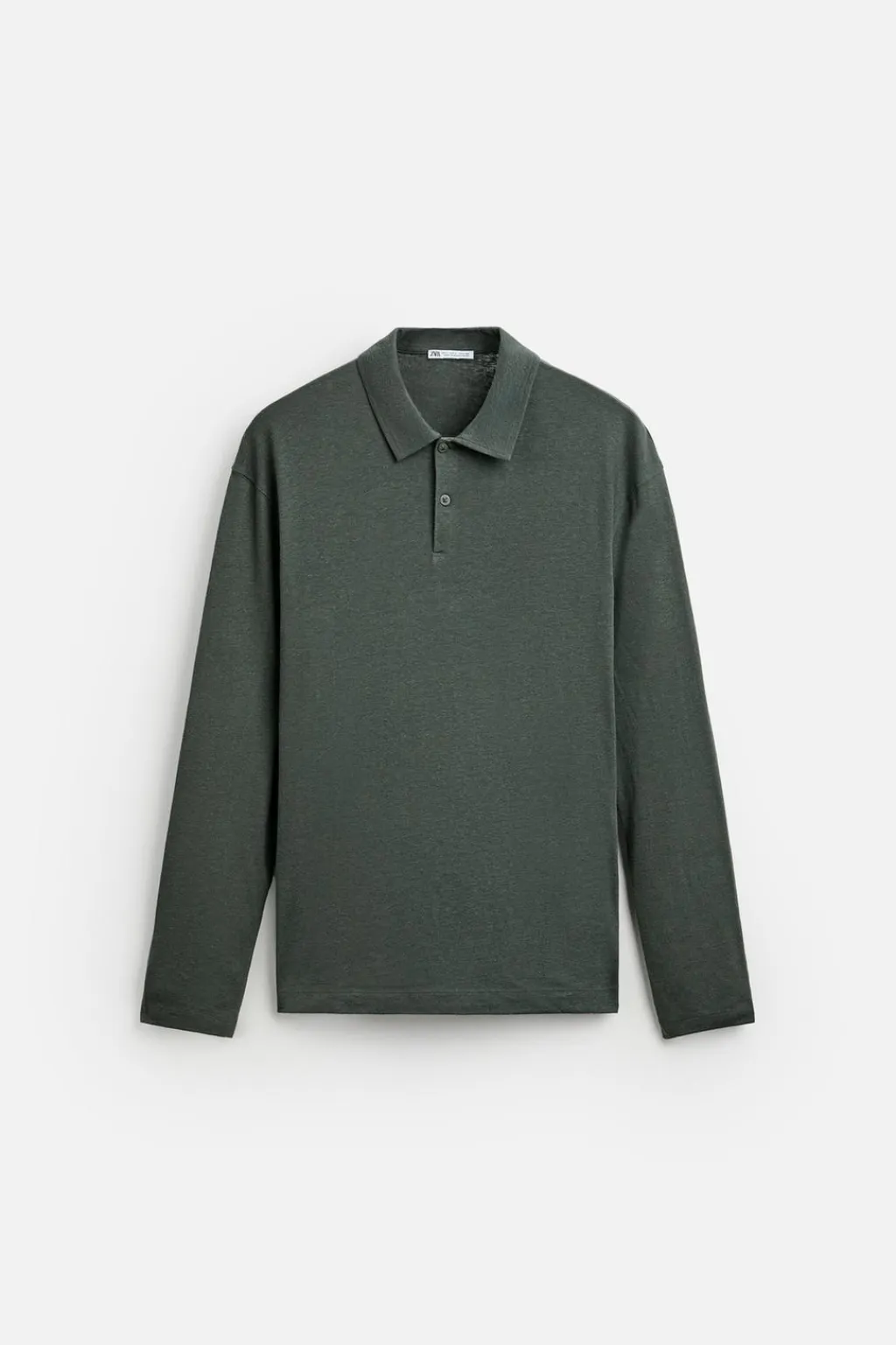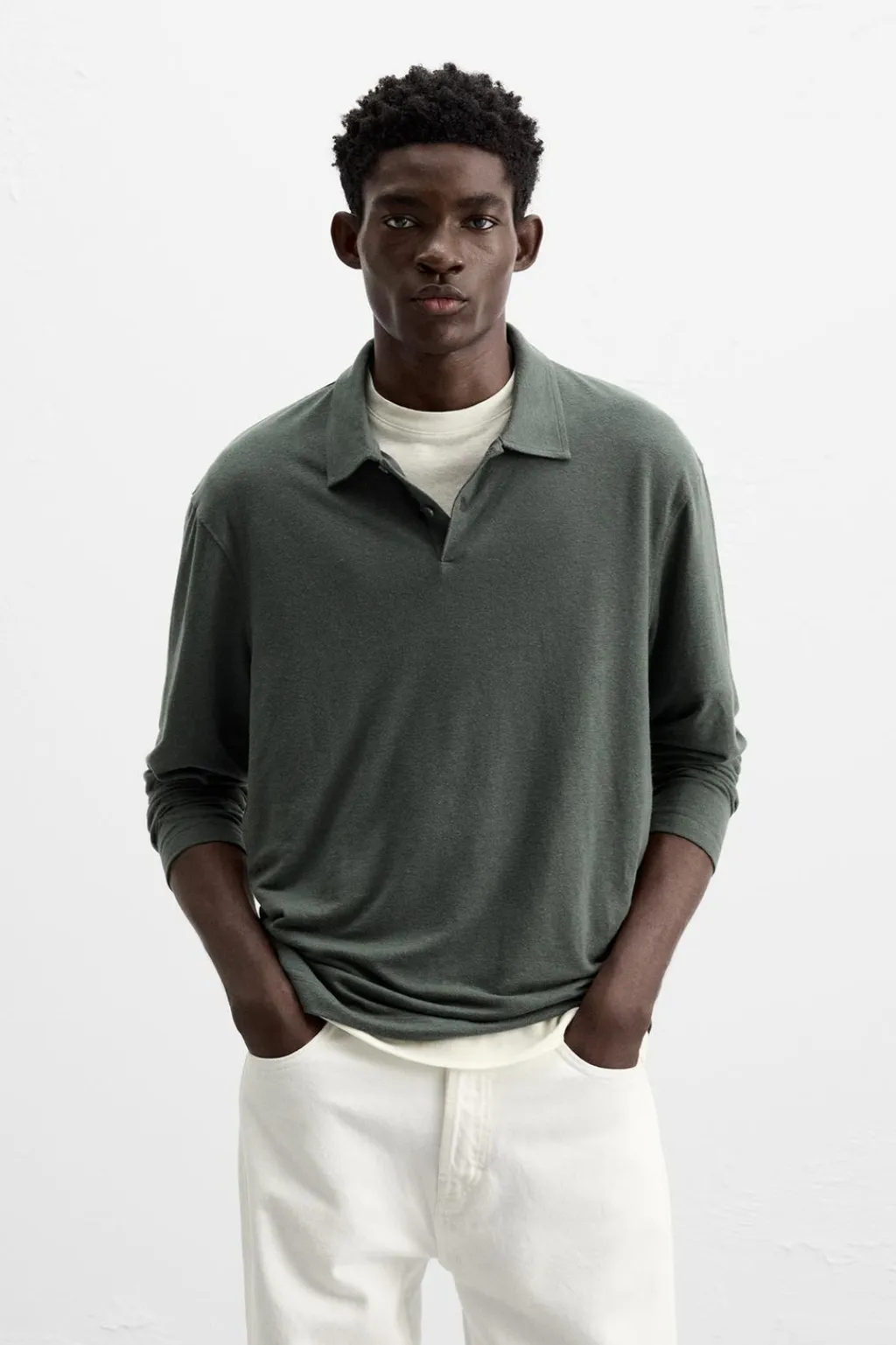 Polo regular fit confeccionado en tejido con lino. Cuello solapa con cierre frontal de botonadura. Manga larga.