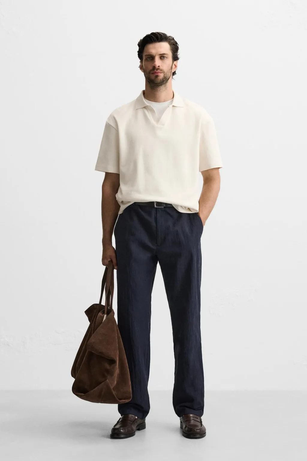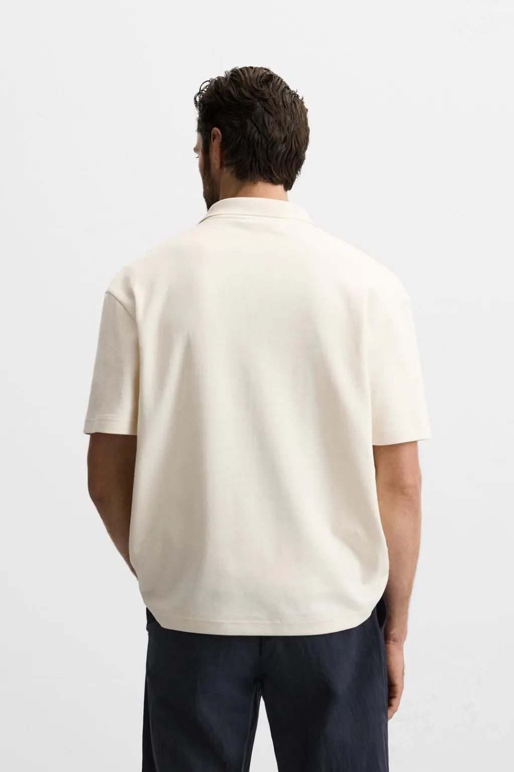 Polo relaxed fit confeccionado en tejido con mezcla de algodón. Cuello bowling y manga corta.