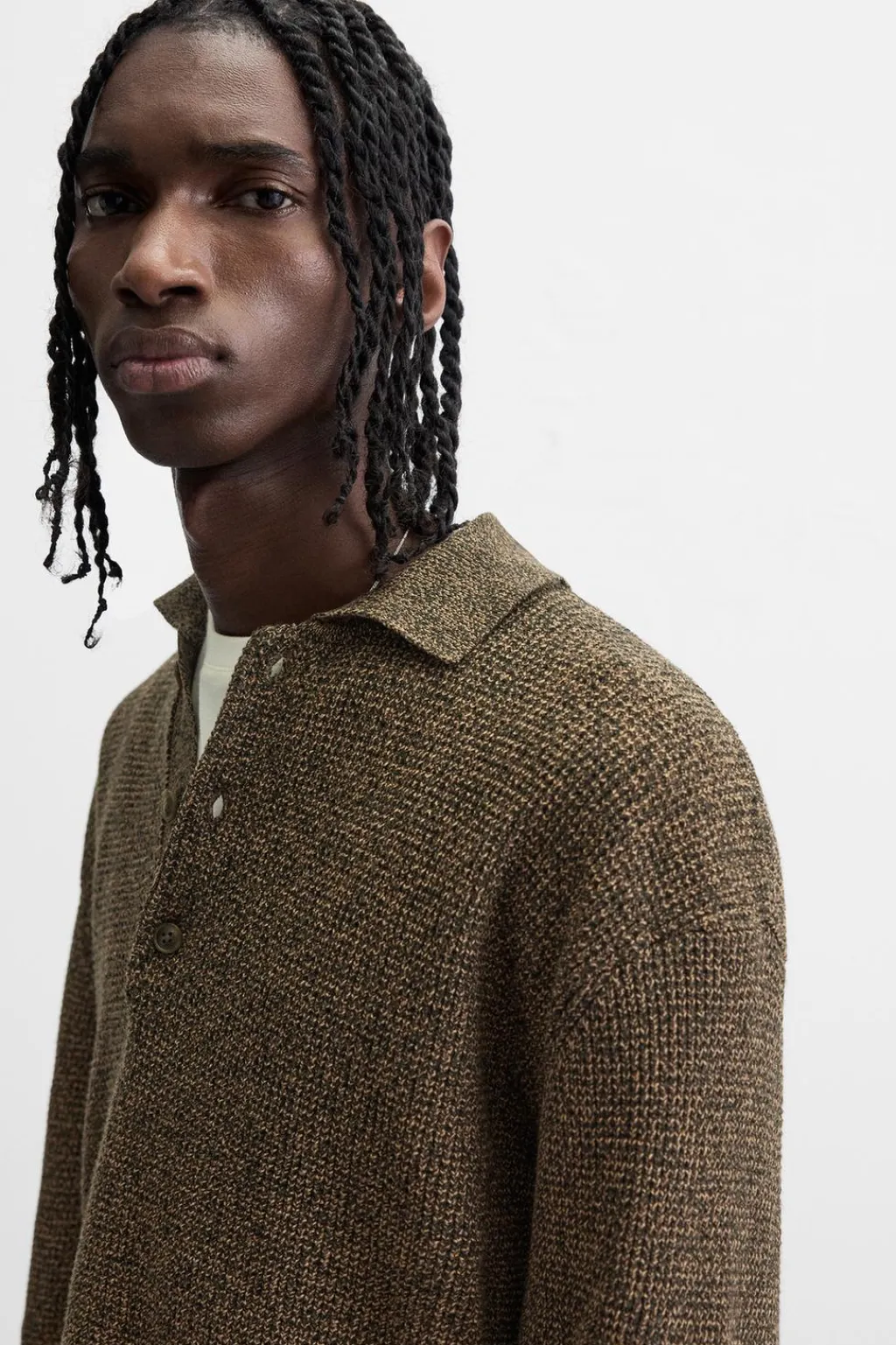 Polo de punto con cuello solapa y cierre frontal de botonadura. Manga larga. Acabados en rib.