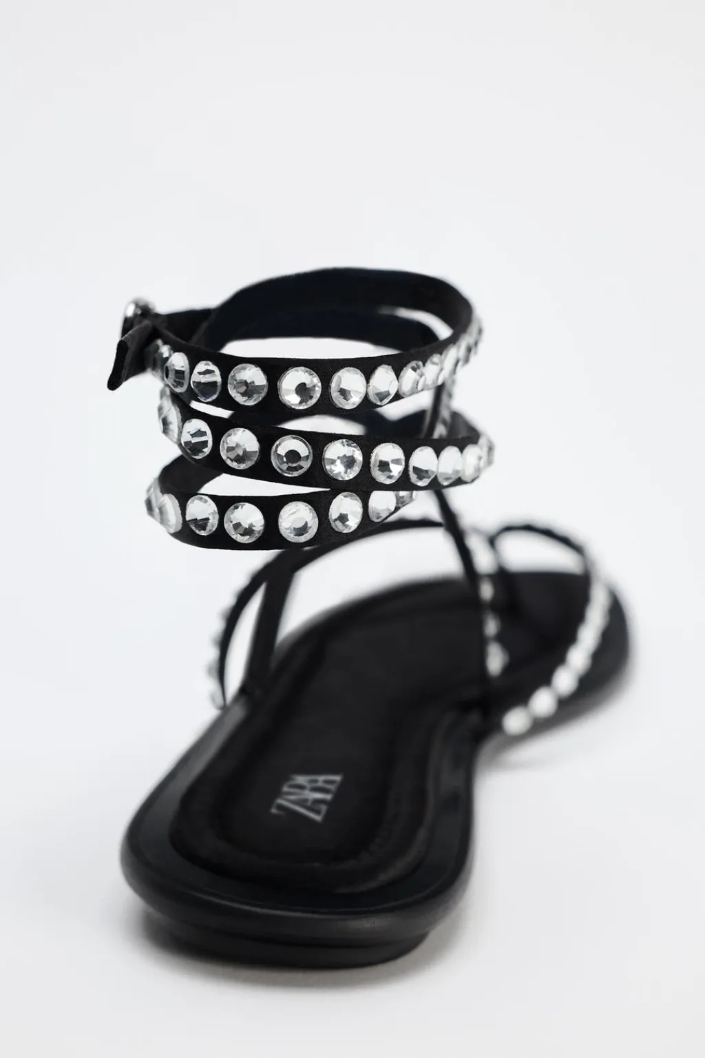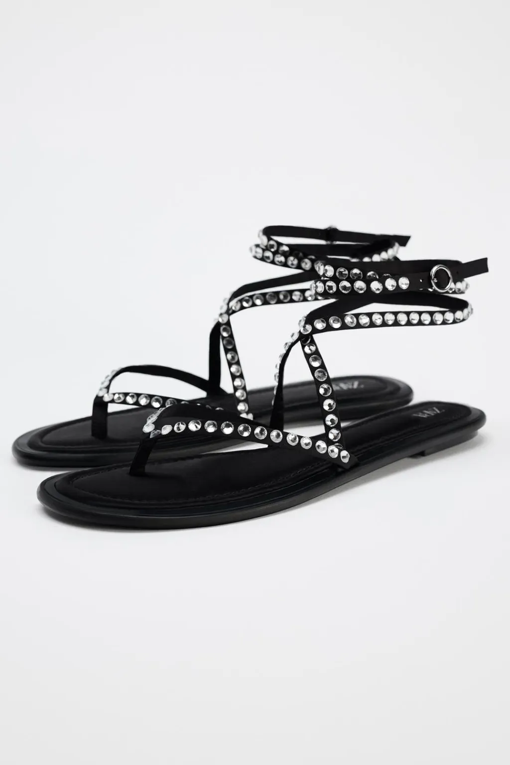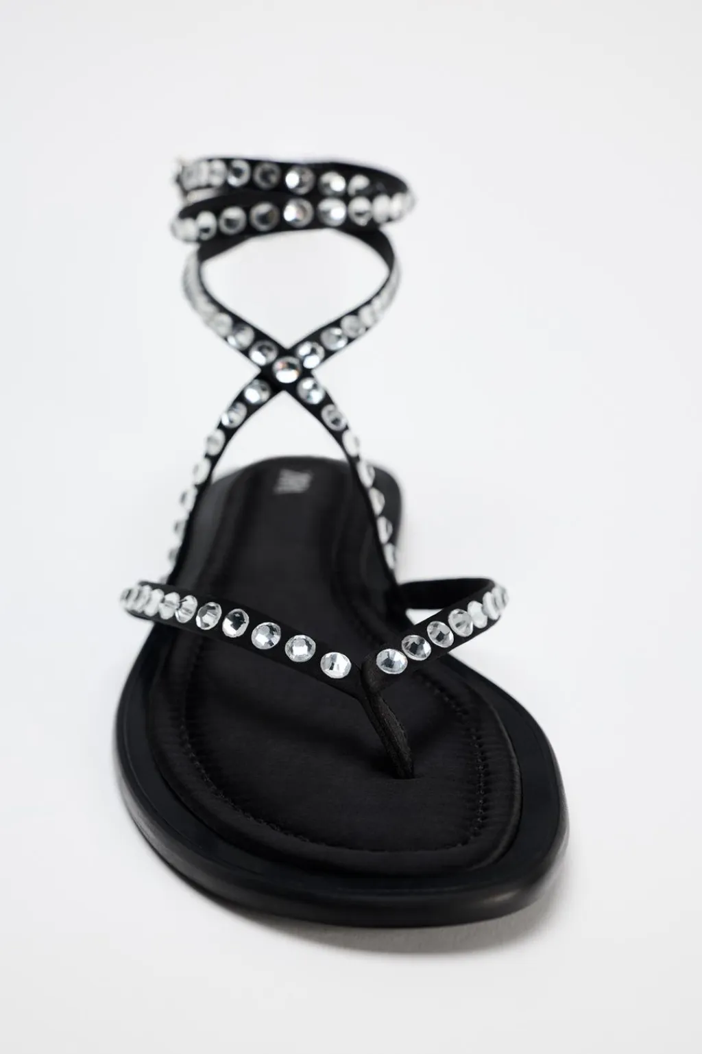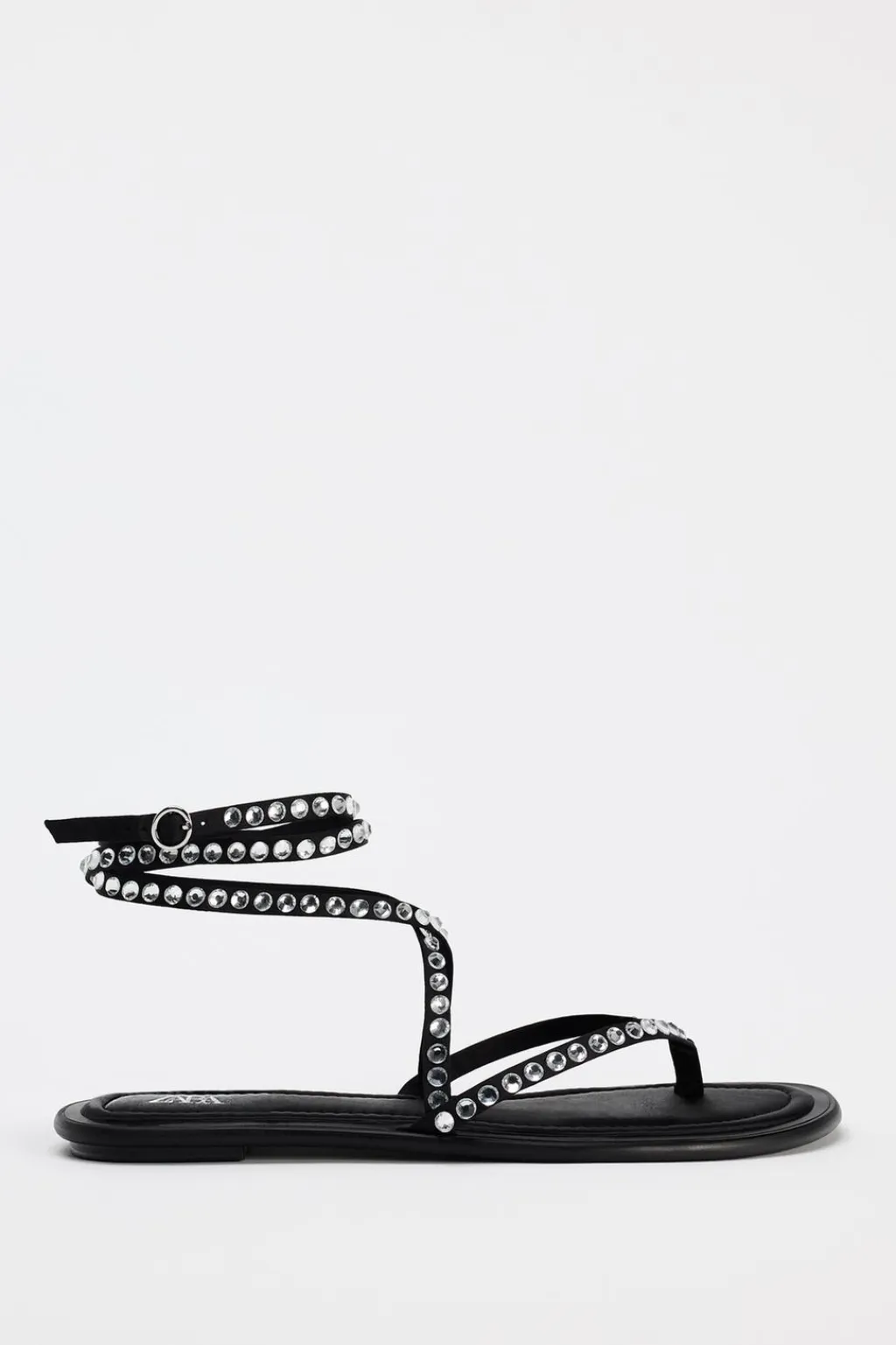 Zapato tipo sandalia plana. Detalle de brillos en el corte. Tiras en la parte delantera con posición para el dedo. Cierre mediante tiras atadas al tobillo.