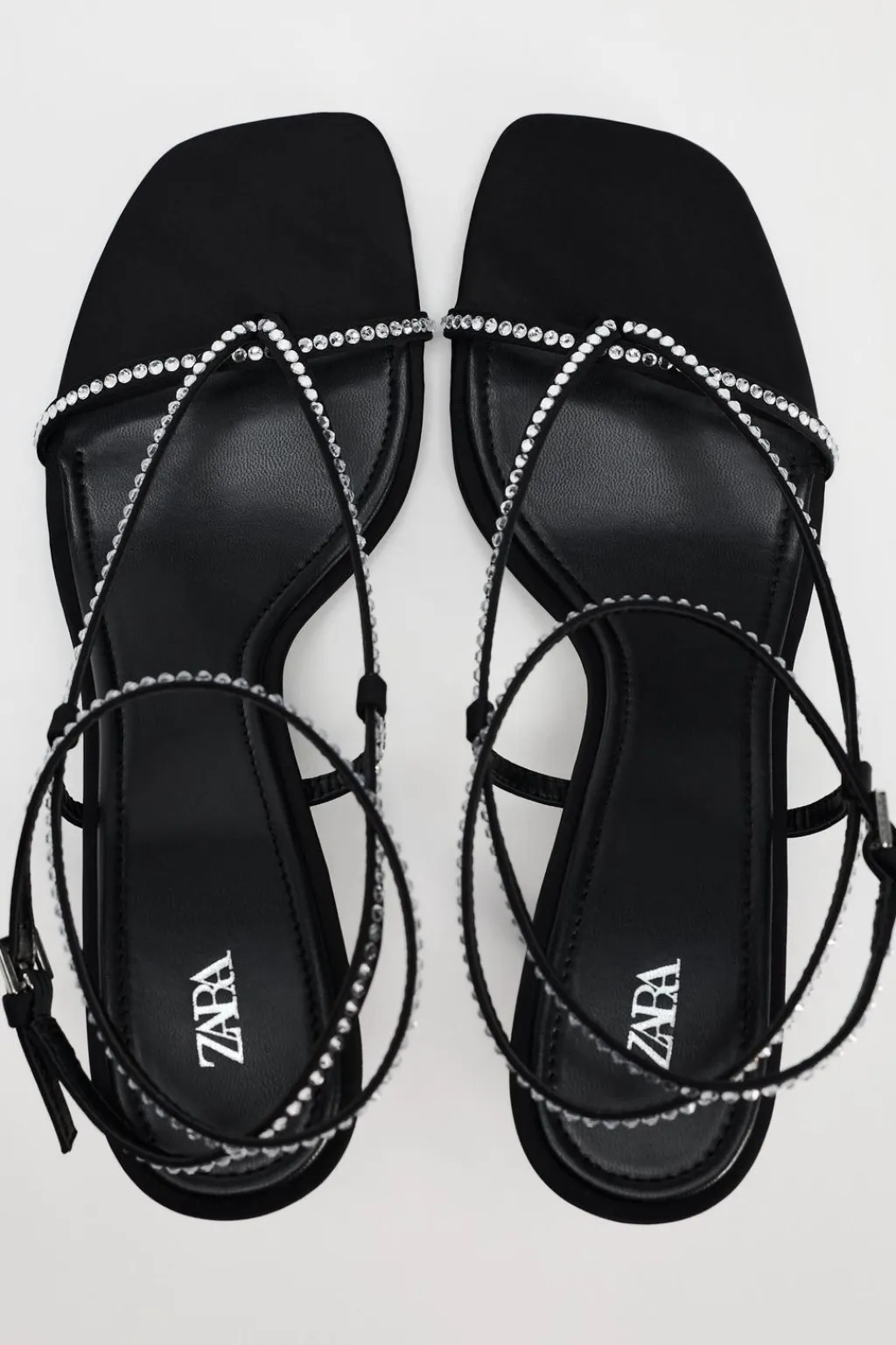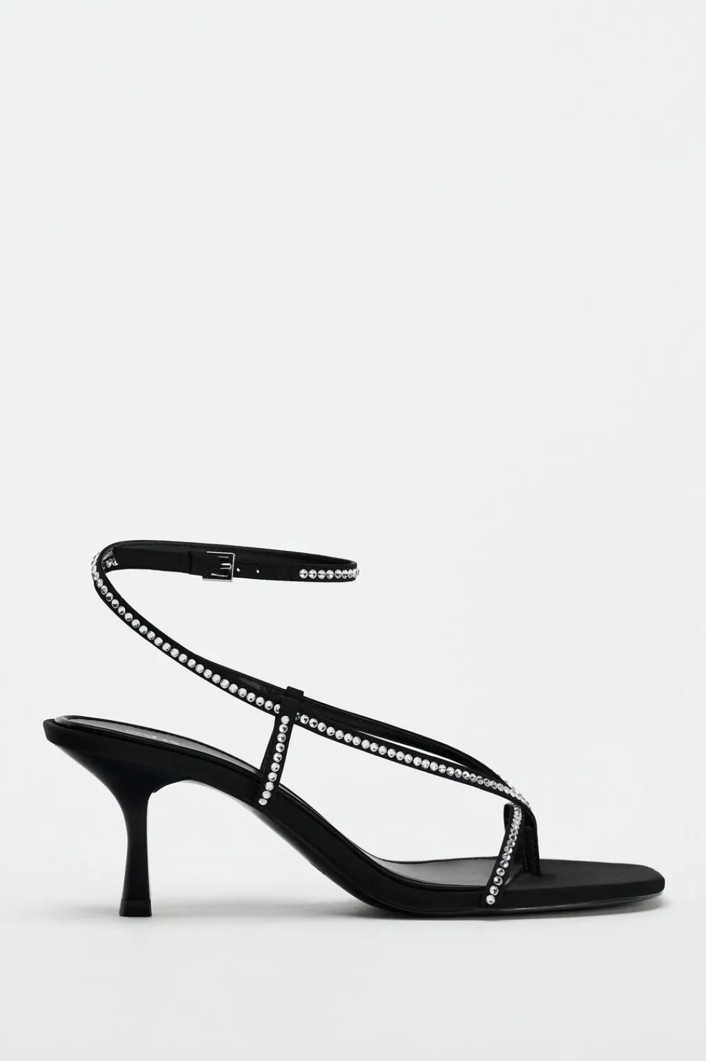 Zapato tipo sandalia tacón. Tiras finas en la parte delantera con posición para el dedo con detalle de brillos. Cierre mediante pulsera al tobillo. Acabado en punta cuadrada.