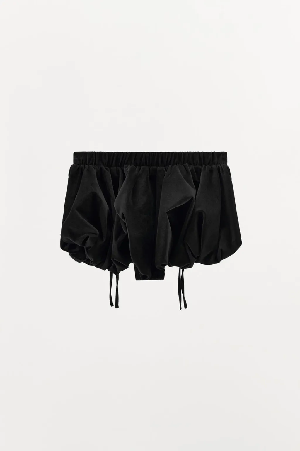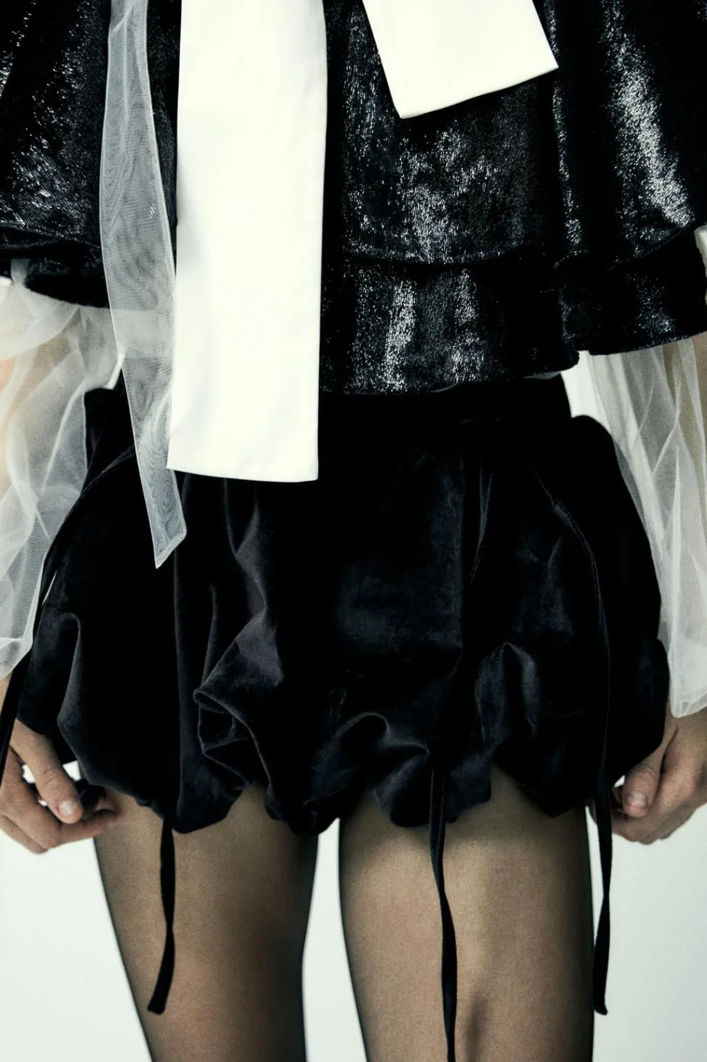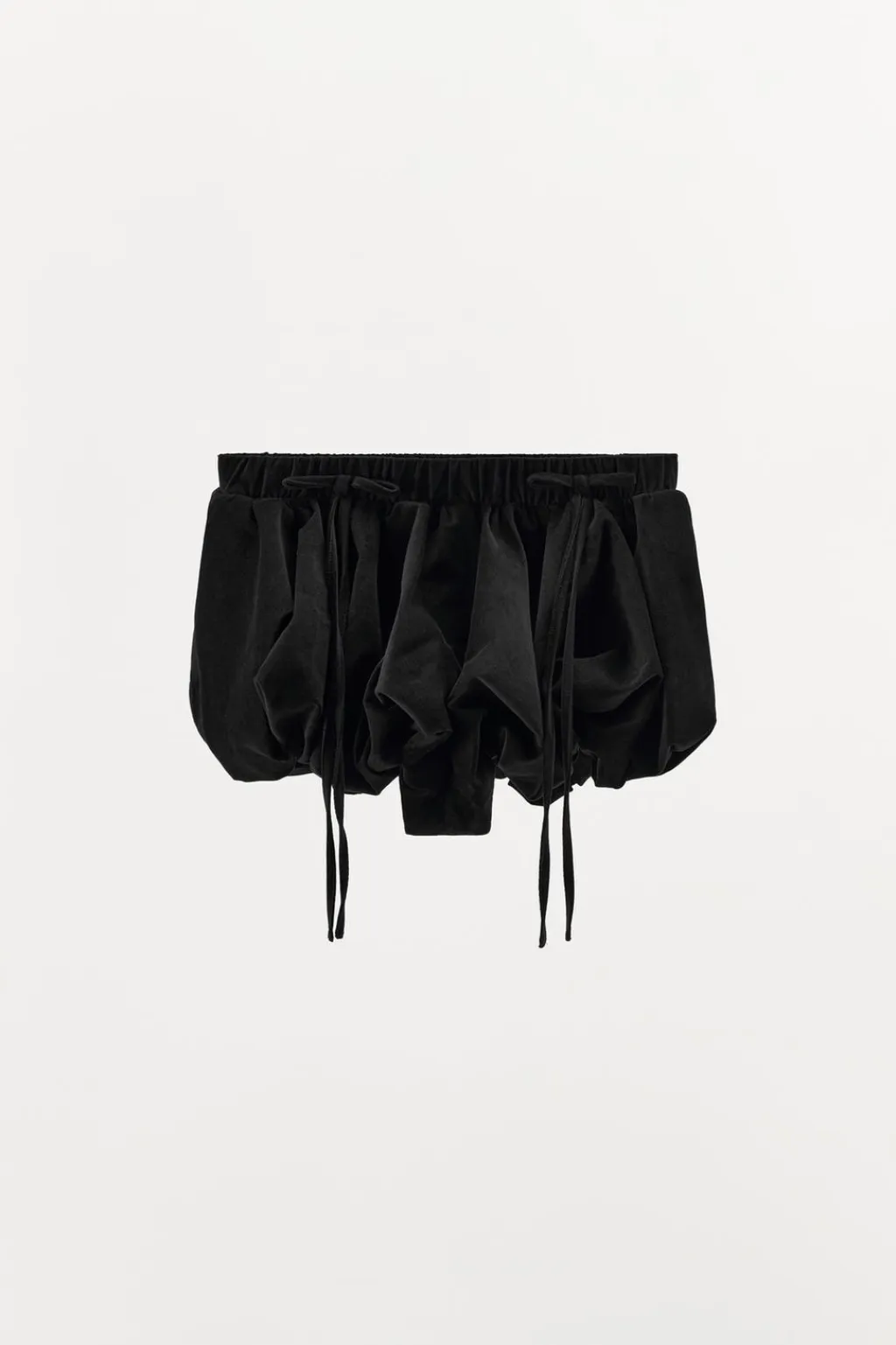 Shorts mini de tiro bajo con cintura elástica. Detalle de lazos en mismo tejido. Forro interior combinado. Bajo acabado globo.