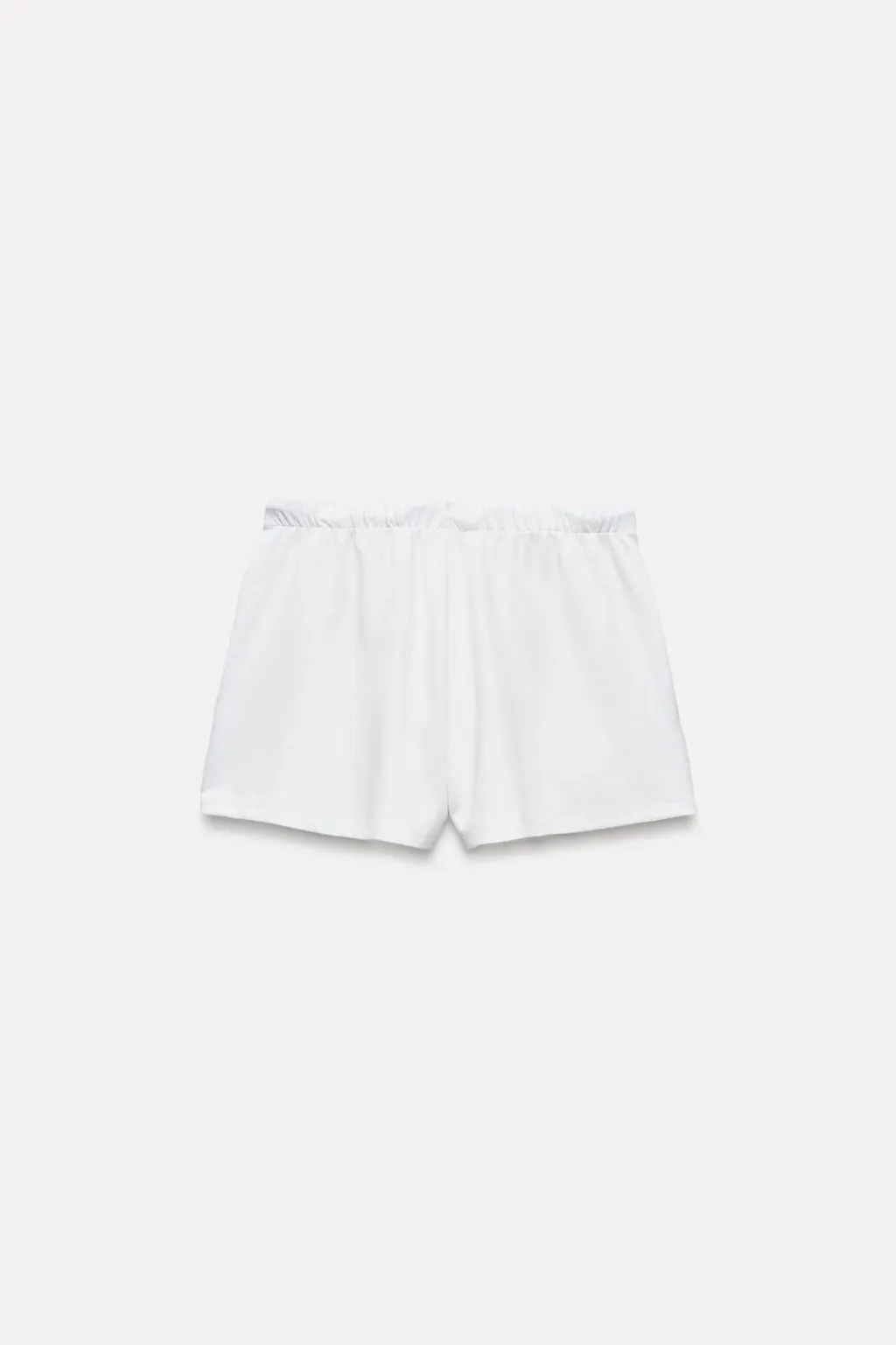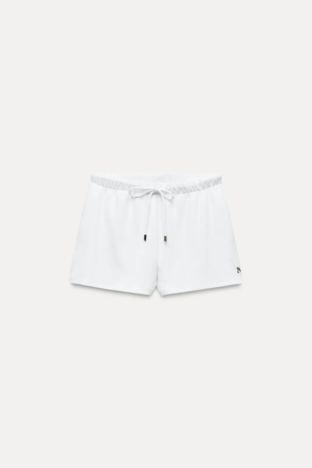 Shorts confeccionados en tejido de punto elástico y flexible con trama compacta, mullida y opaca. Tiro medio y cintura elástica ajustable con cordones. Bolsillos laterales. Detalle de aplicación metálica ZA en delantero.