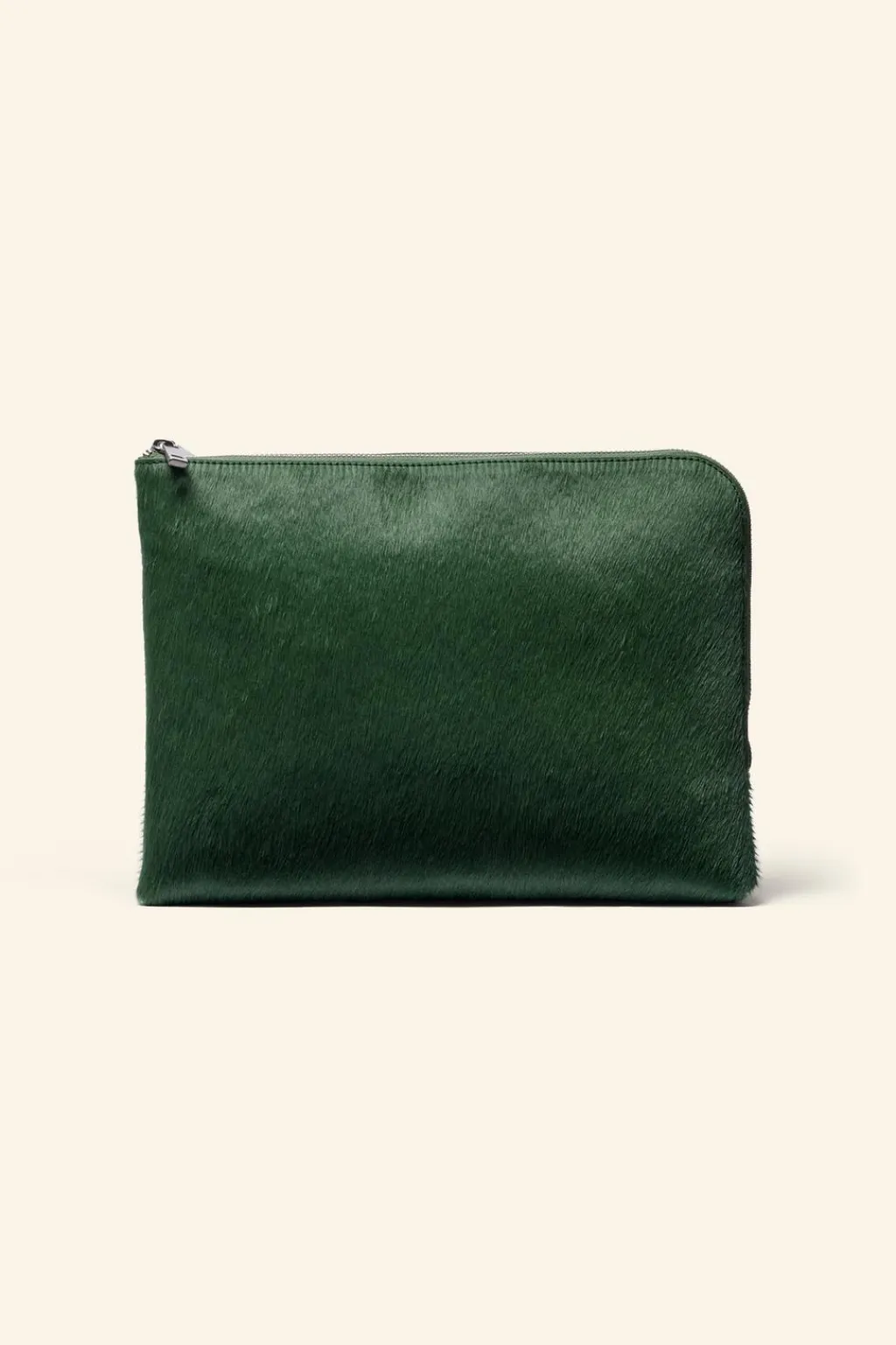 Bolso tipo sobre. Fabricado en piel con acabado pelo. Cuenta con dos compartimentos con cierre mediante cremallera. Bolsillo interior sin cierre.