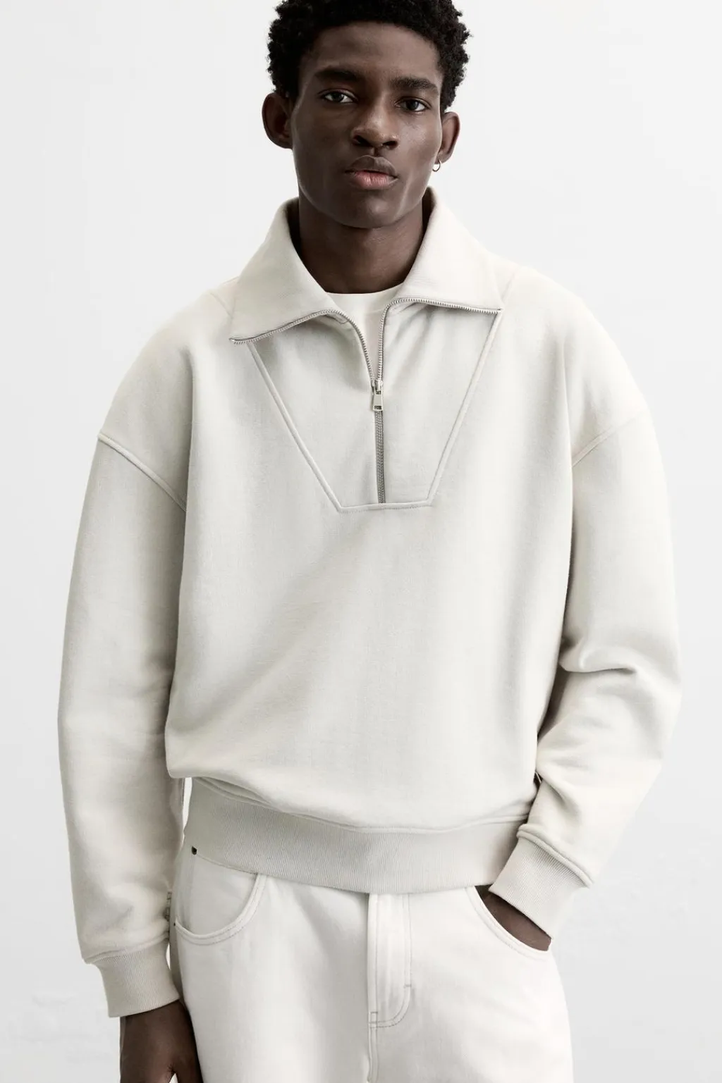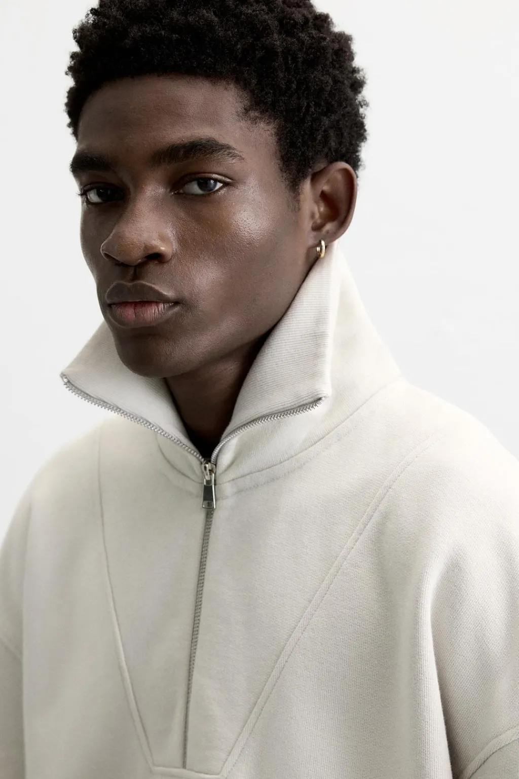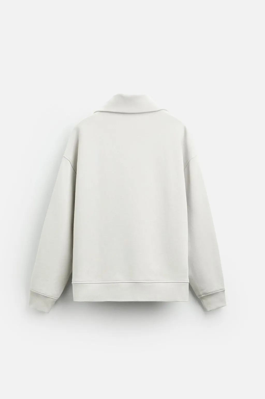 Sudaderaboxy fit confeccionada en tejido de algodón compacto con el interior acabado rizo. Cuello subido con cierre frontal de cremallera. Manga larga. Acabados en rib.