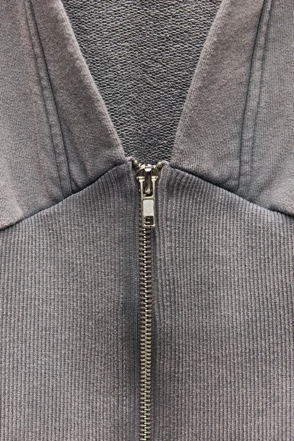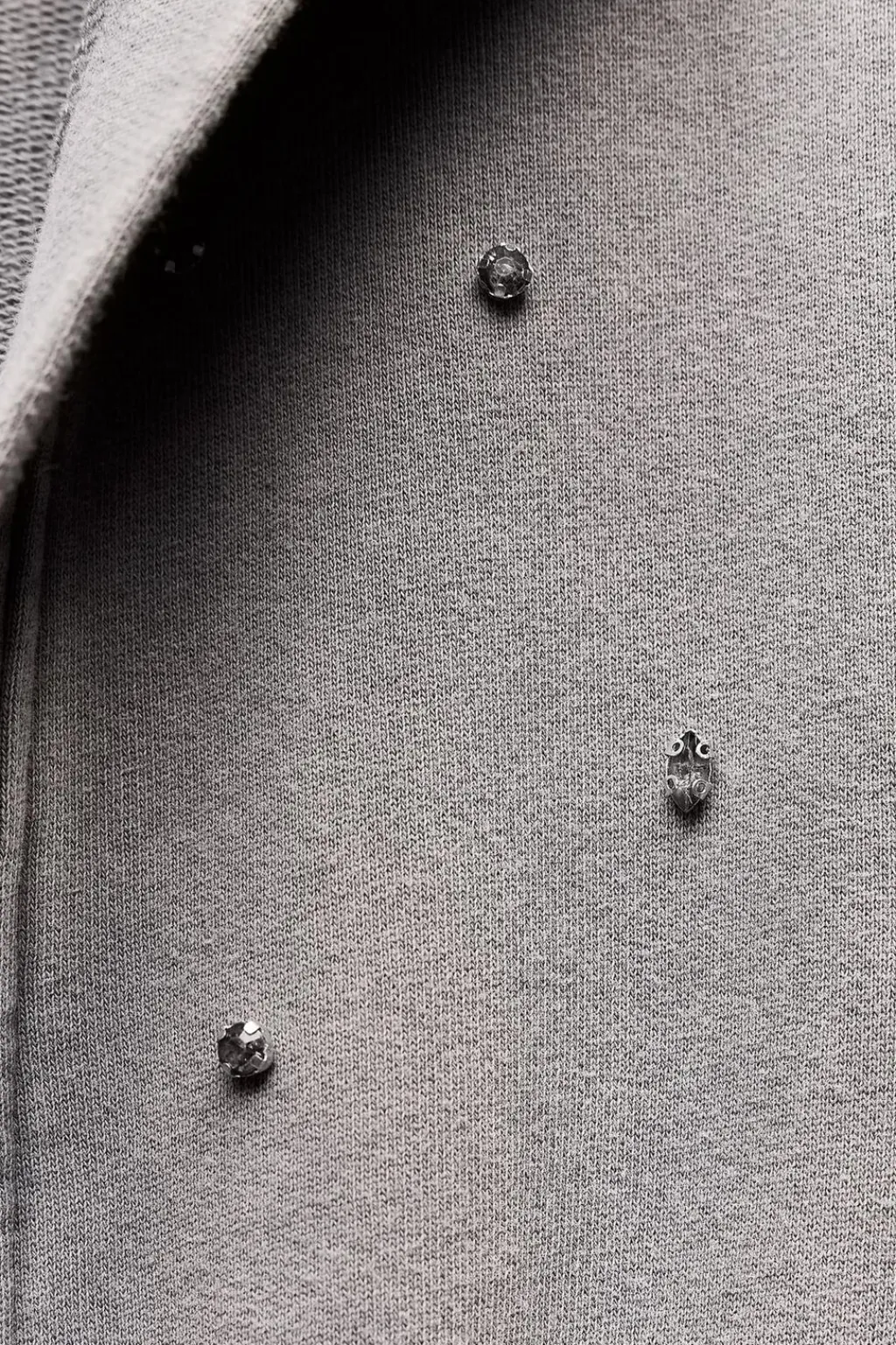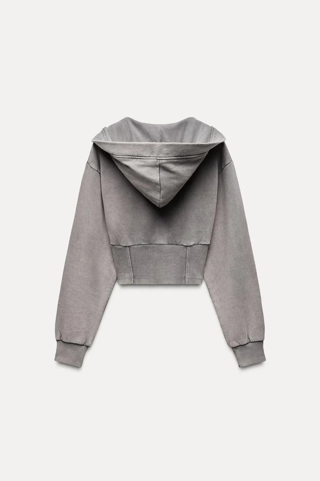 Sudadera confeccionada en algodón efecto lavado. Escote pico y capucha. Manga larga acabada en rib. Detalle aplicación joyas. Cierre frontal con cremallera.