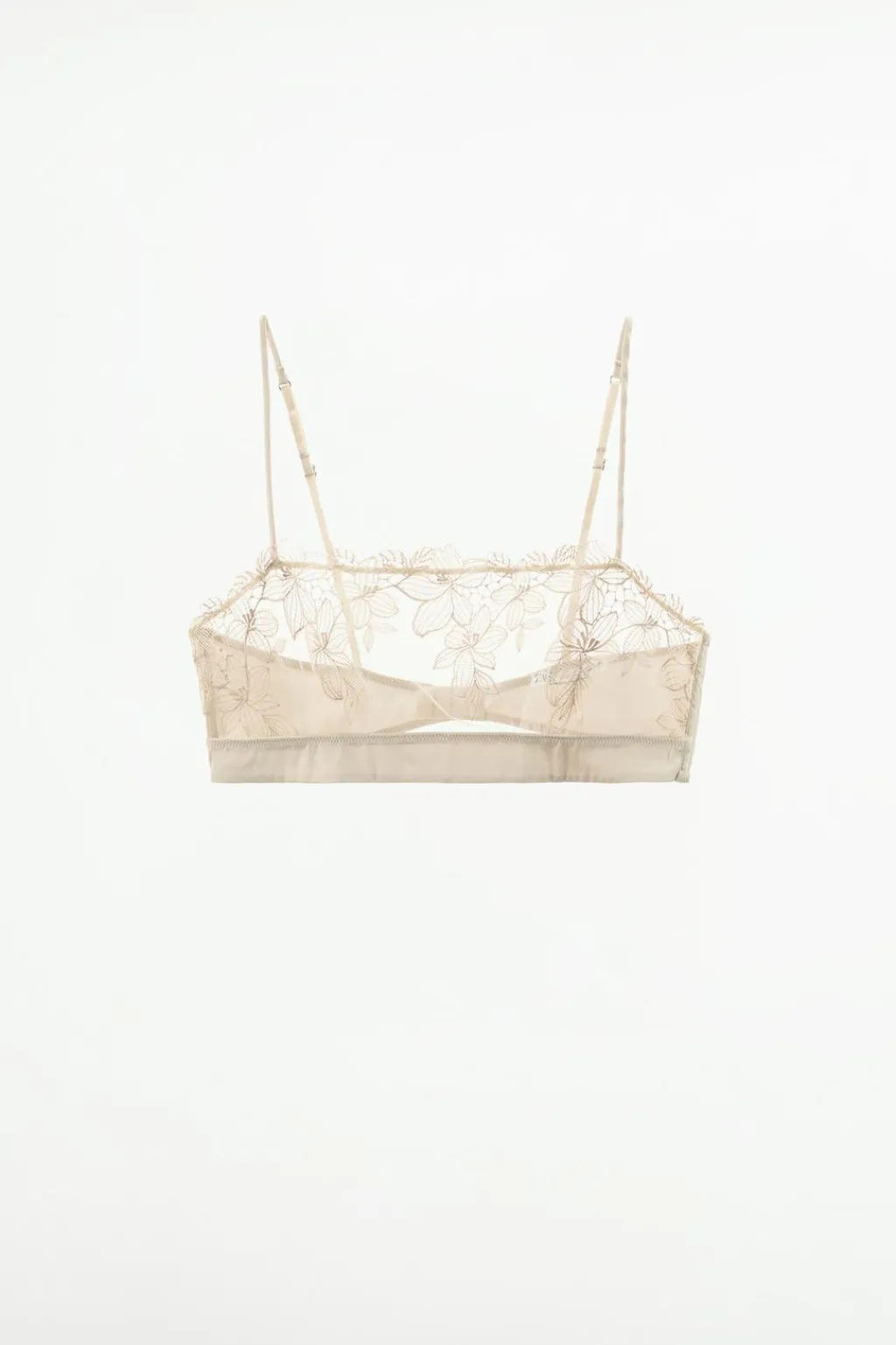 Sujetador tipo bandeau confeccionado en encaje suave. Tirantes finos ajustables. Detalle aplicación de bordados florales combinados a tono. Cierre en espalda con ganchos metálicos.