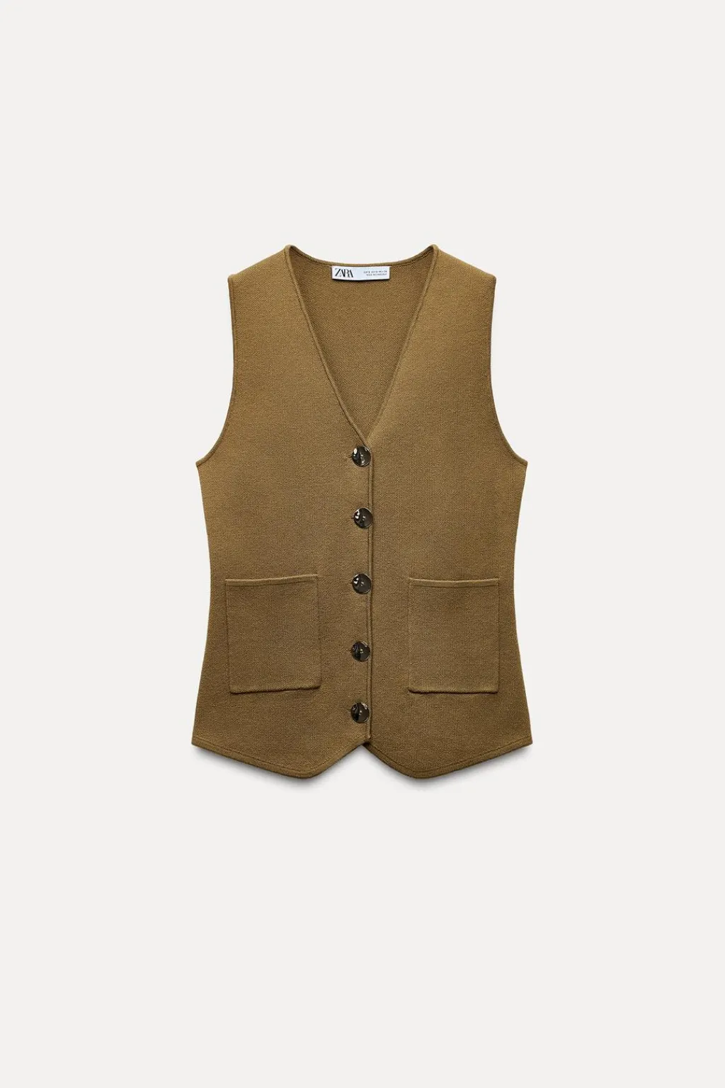 Top chaleco de escote pico y manga sisa. Bolsillos delanteros de plastrón. Cierre frontal con botones dorados.