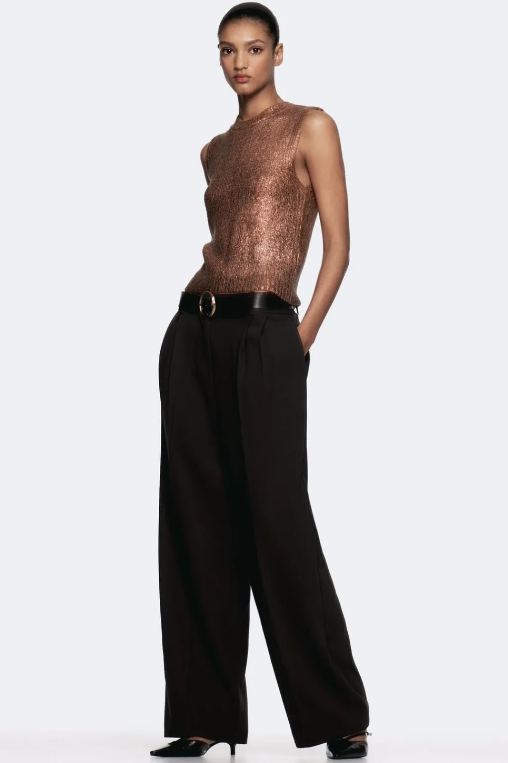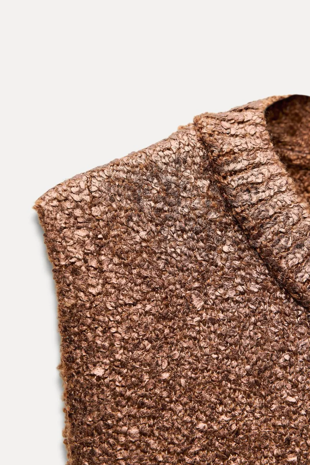 Top chaleco de cuello redondo y manga sisa. Detalle de tejido efecto metalizado.