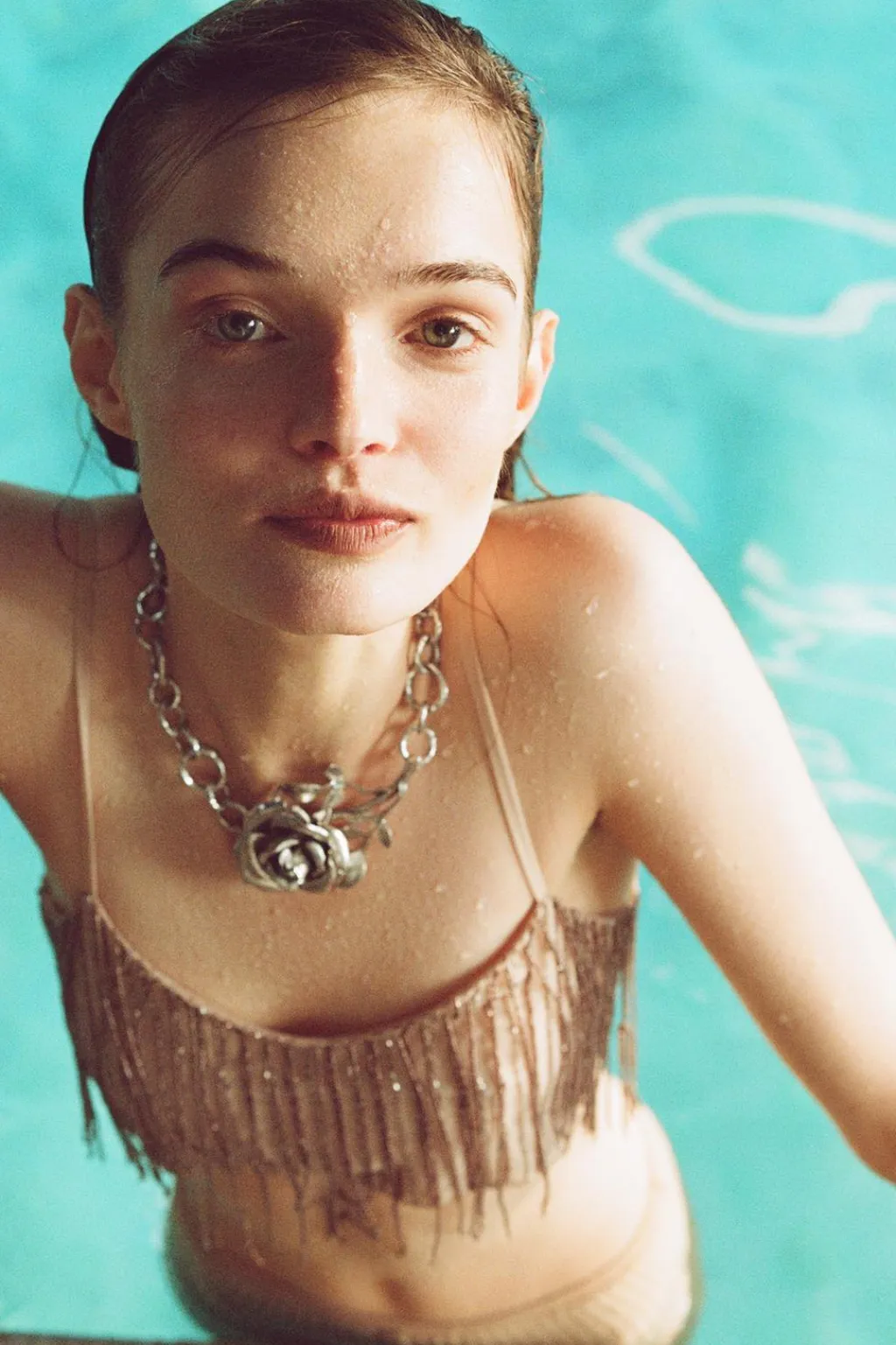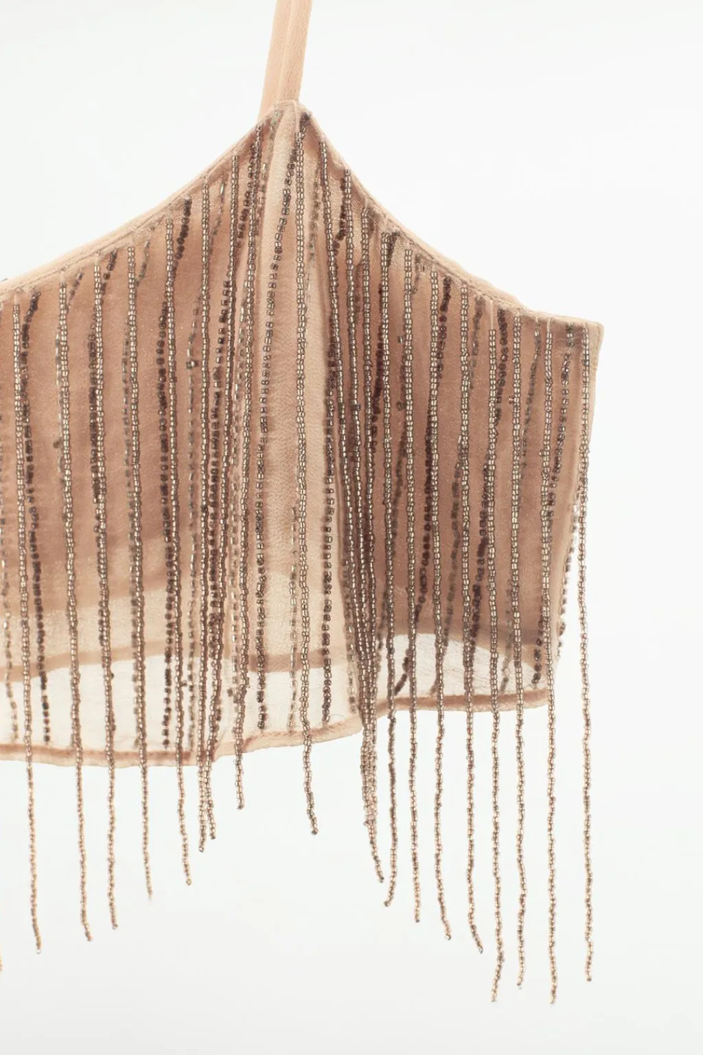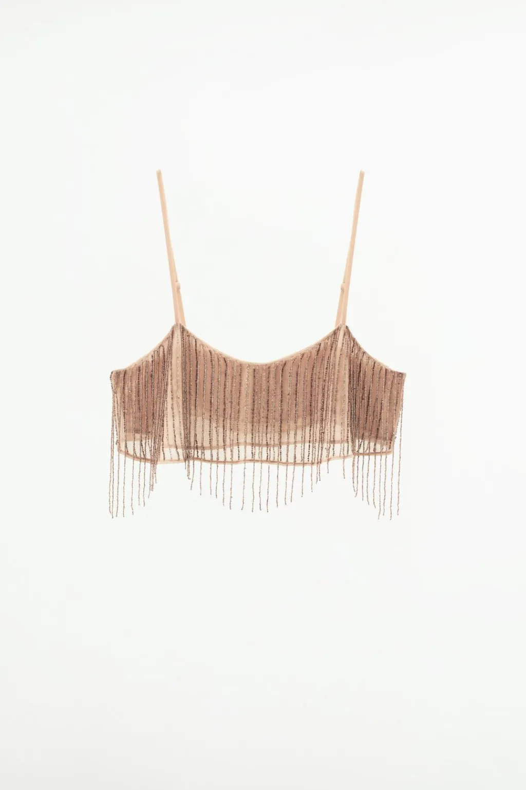 Top corto de escote recto y tirantes finos. Detalle de flecos con aplicación de abalorios.