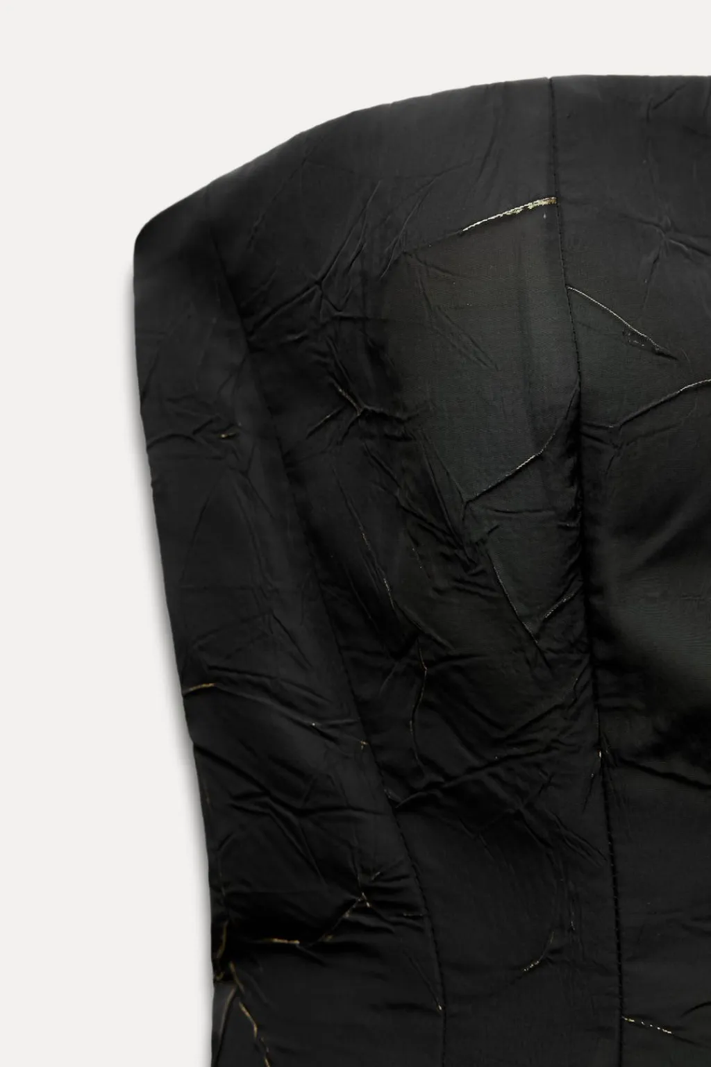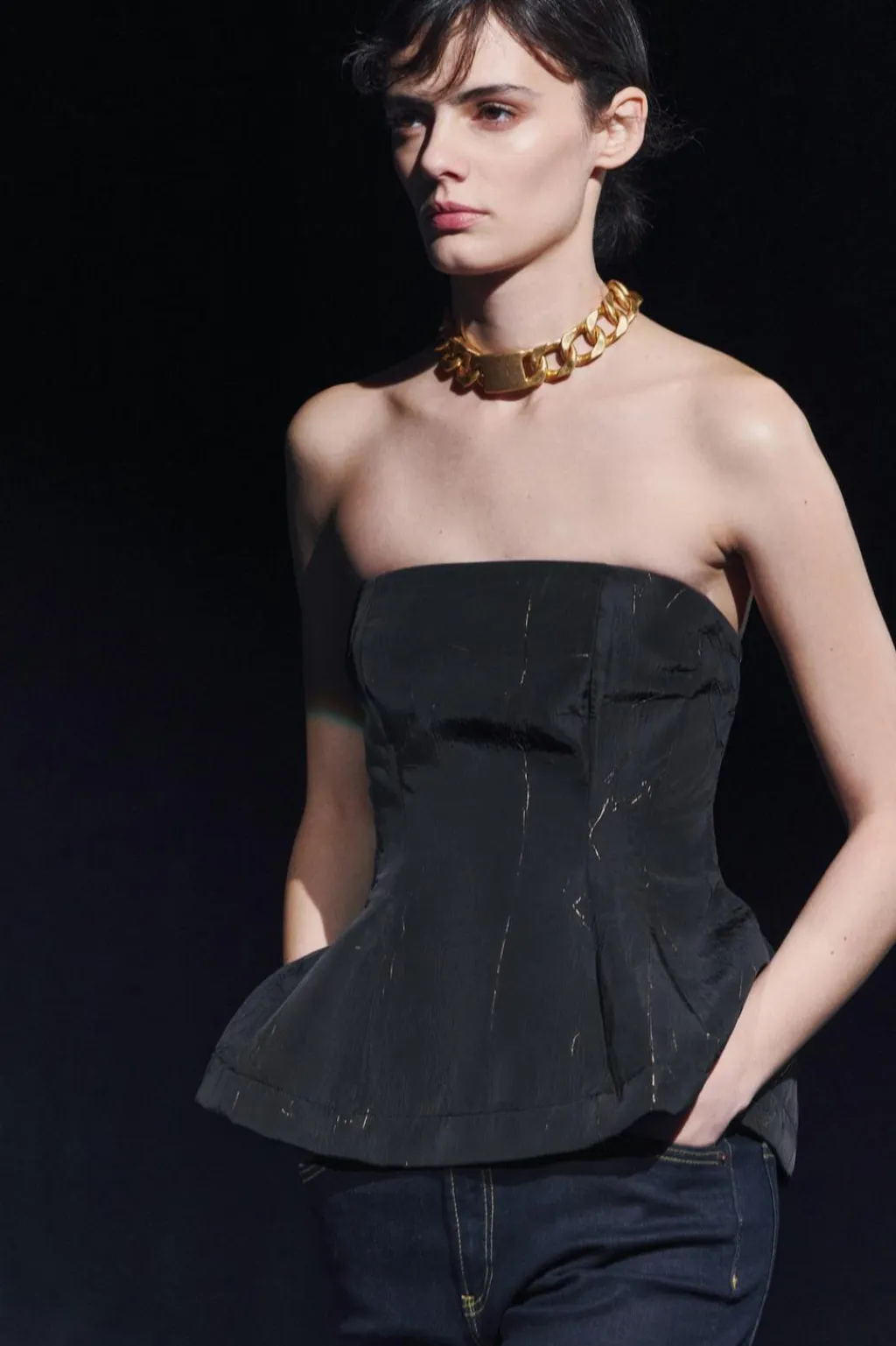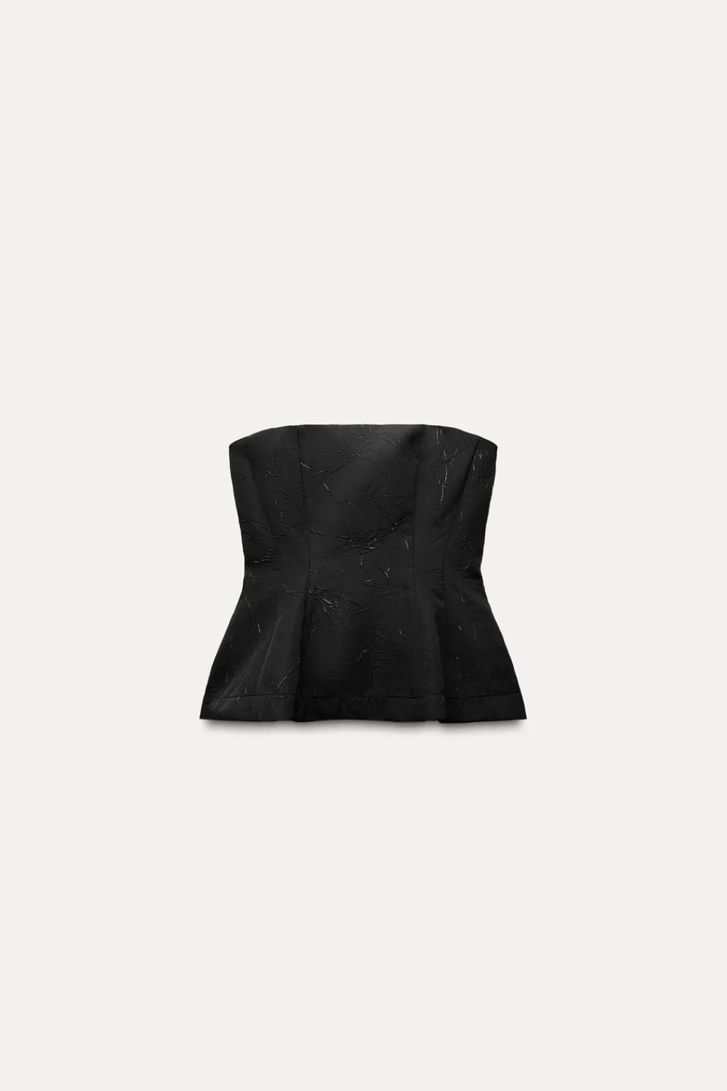 Top palabra de honor con aplicación de hilo metalizado. Bajo acabado en peplum. Cierre con cremallera oculta en costura.