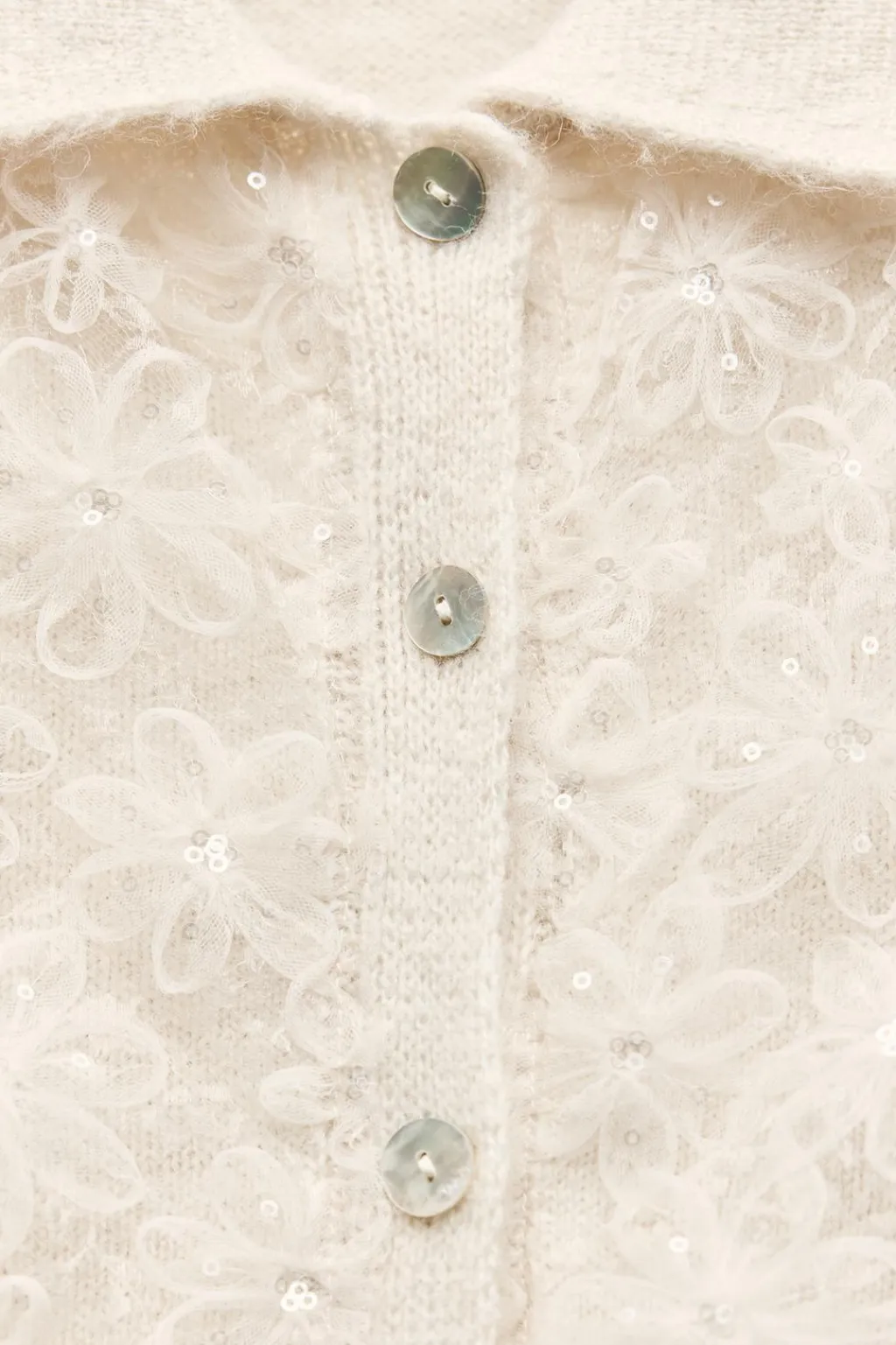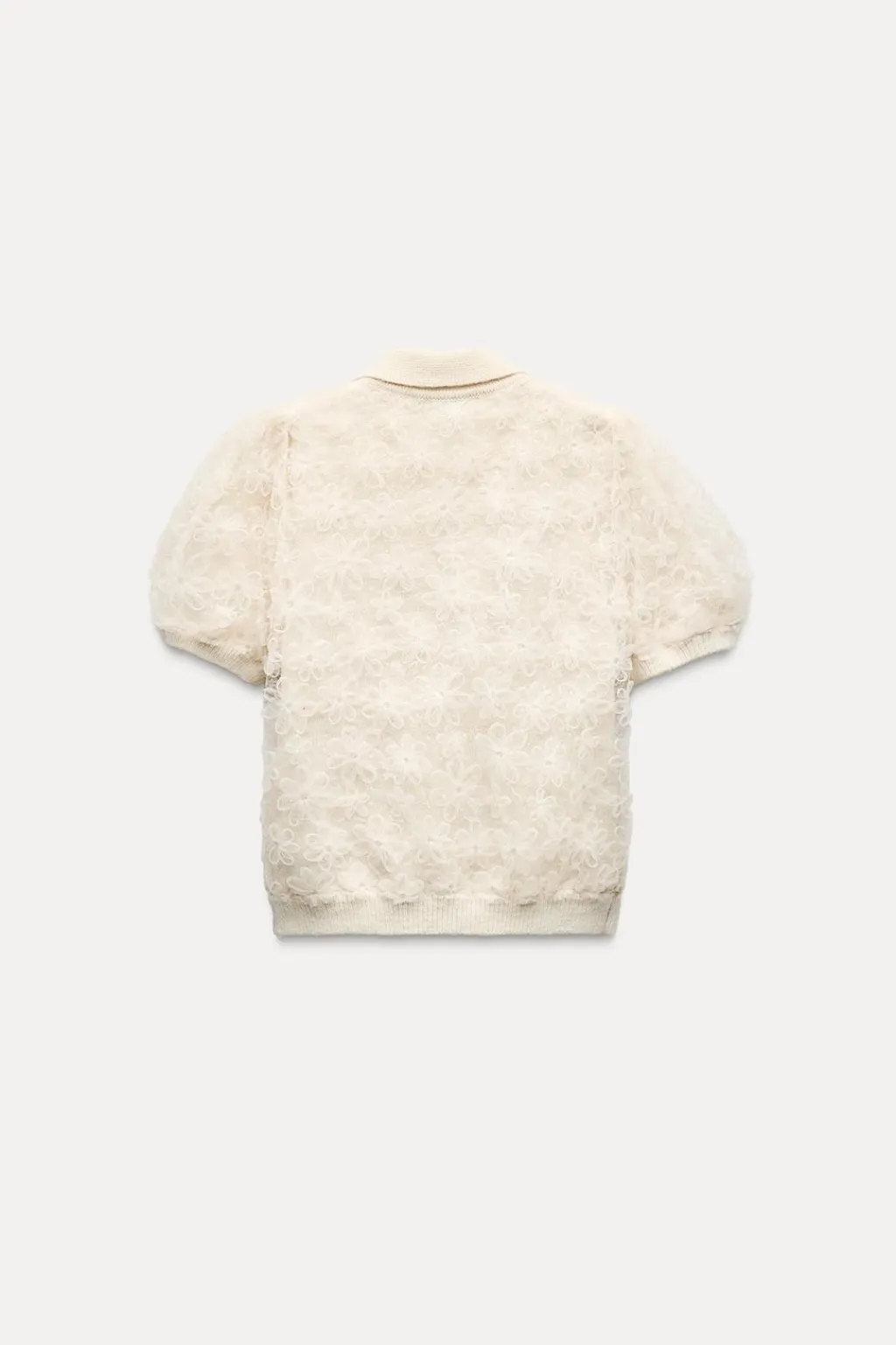 Top de cuello solapa y manga corta abullonada. Detalle de tejido combinado con encaje y aplicación de lentejuelas. Cierre frontal con botones.