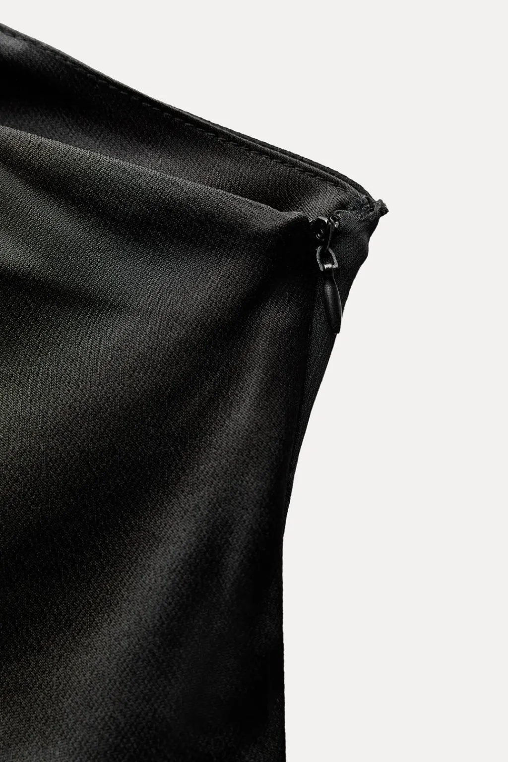 Top satinado de escote asimétrico y manga sisa. Detalle de pliegues. Bajo redondeado. Cierre lateral con cremallera oculta en costura.