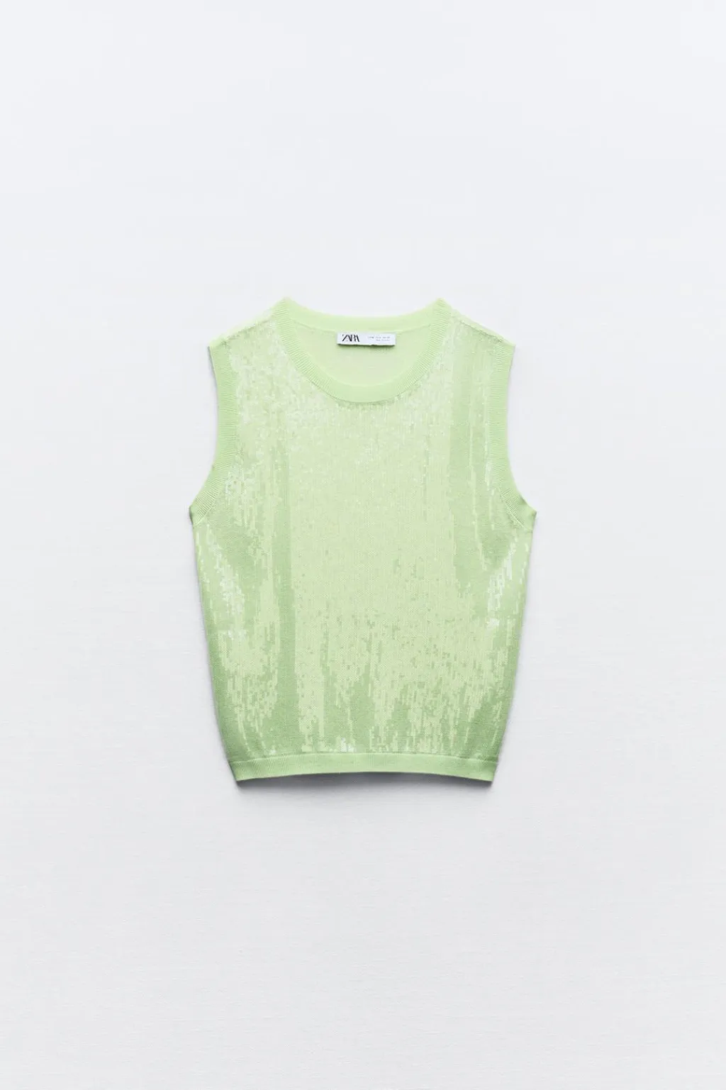 Top de cuello redondo y manga sisa. Detalle aplicación de lentejuelas.
