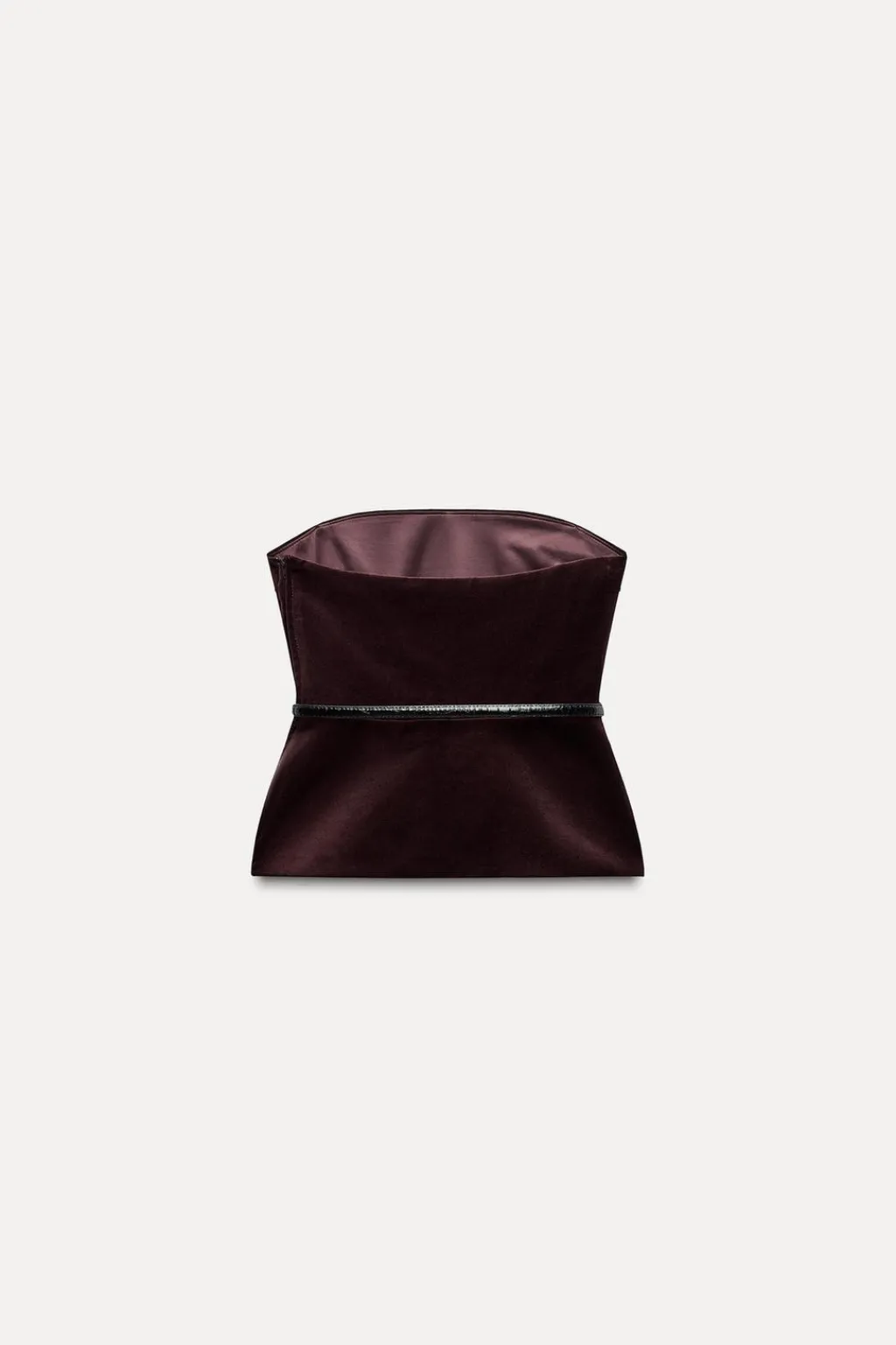 Top de escote recto y hombros descubiertos. Cinturón fino combinado con hebilla metálica. Forro interior. Cierre lateral con cremallera.