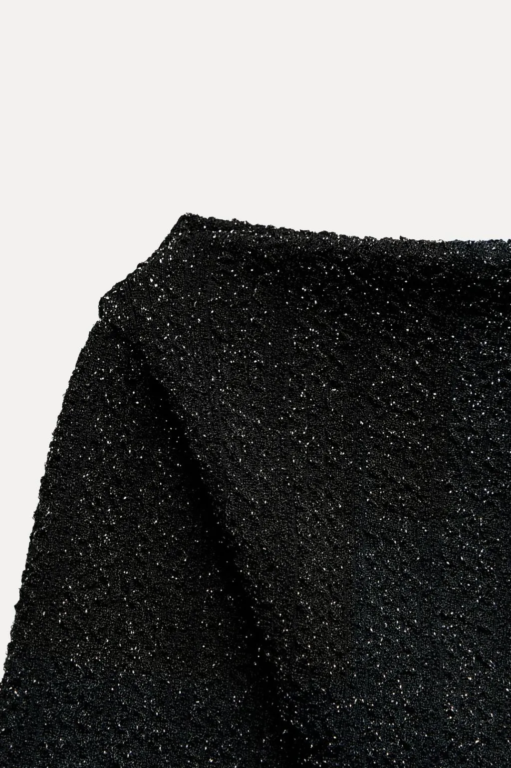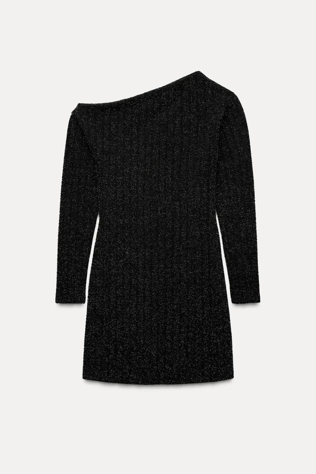 Vestido corto de escote asimétrico y manga larga. Detalle de aplicación de hilo metalizado.