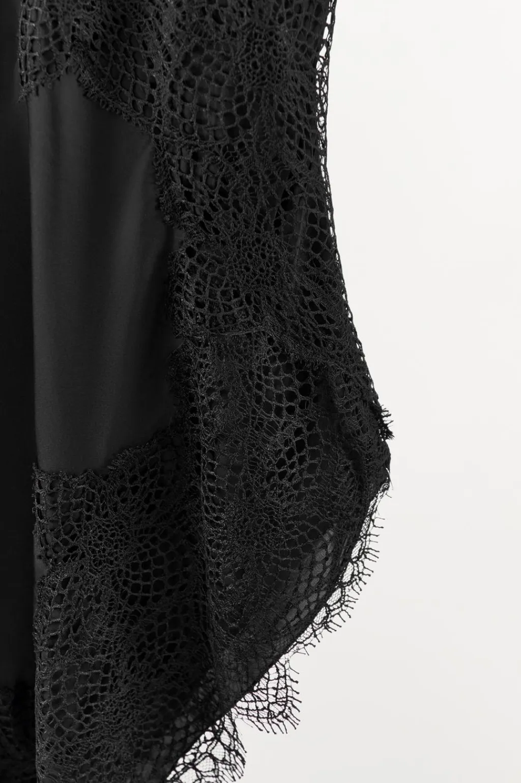 Vestido corto de escote pico y tirantes finos. Detalle aplicación de encaje combinado a tono. Bajo asimétrico. Forro interior.