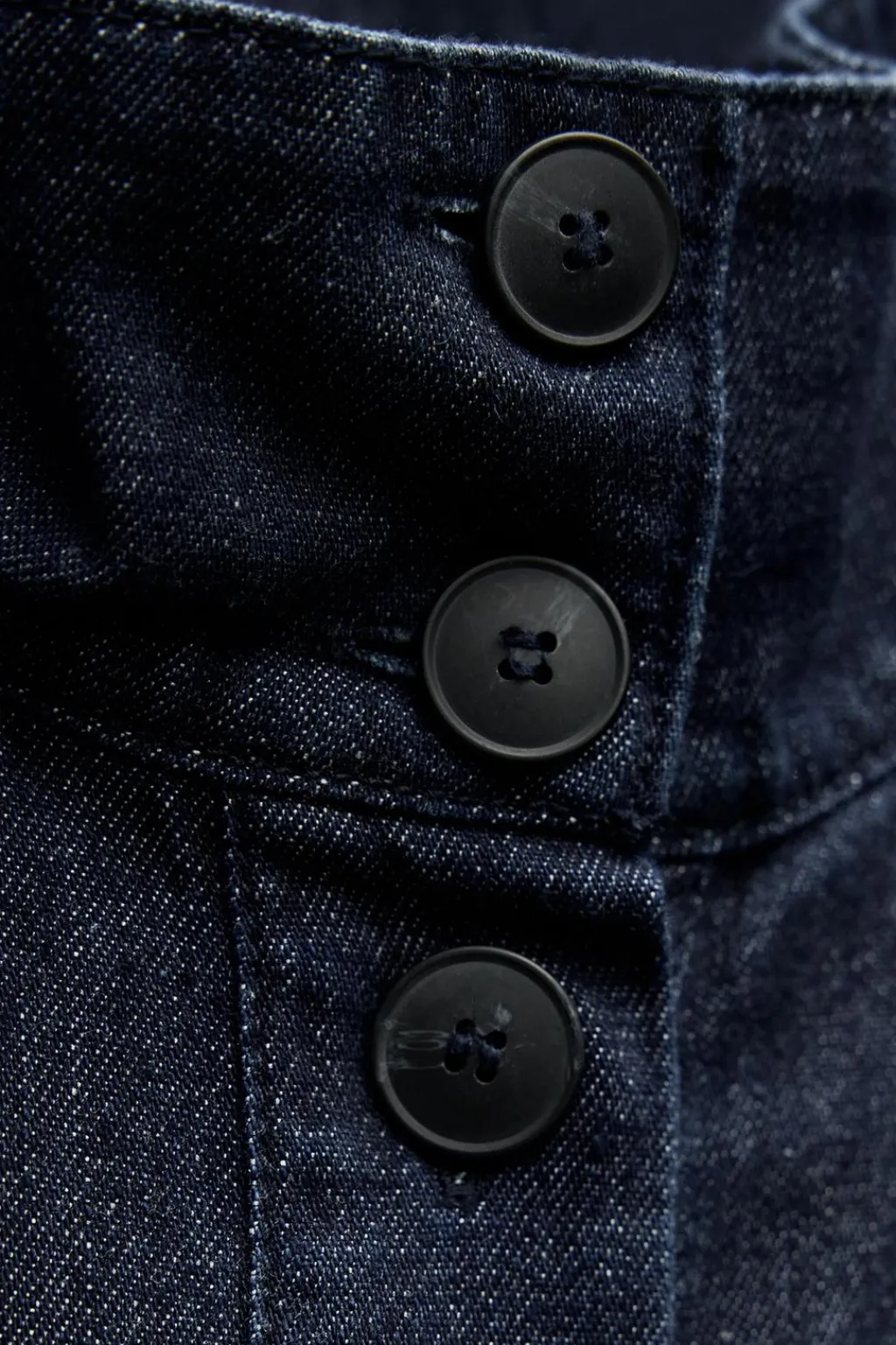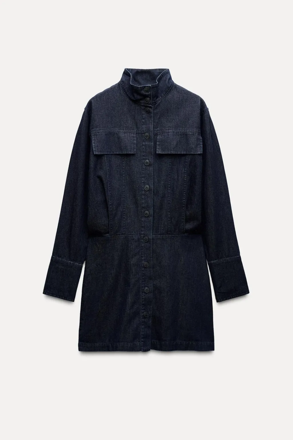 Vestido corto de cuello alto y manga larga acabada en puño. Bolsillos de plastrón con solapa en delantero. Detalle de pespuntes marcados. Cierre frontal con botones.