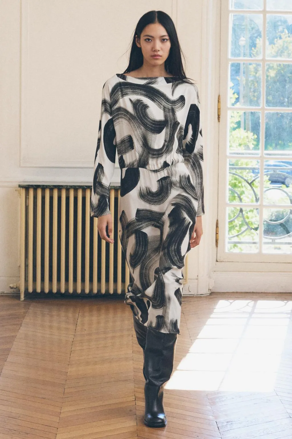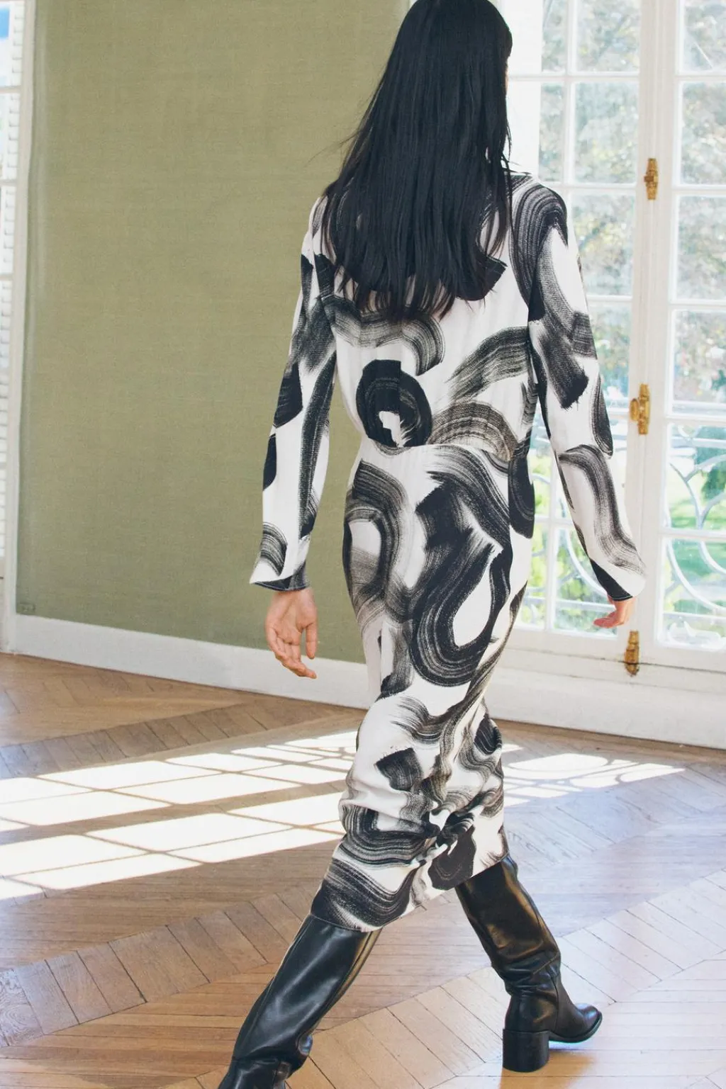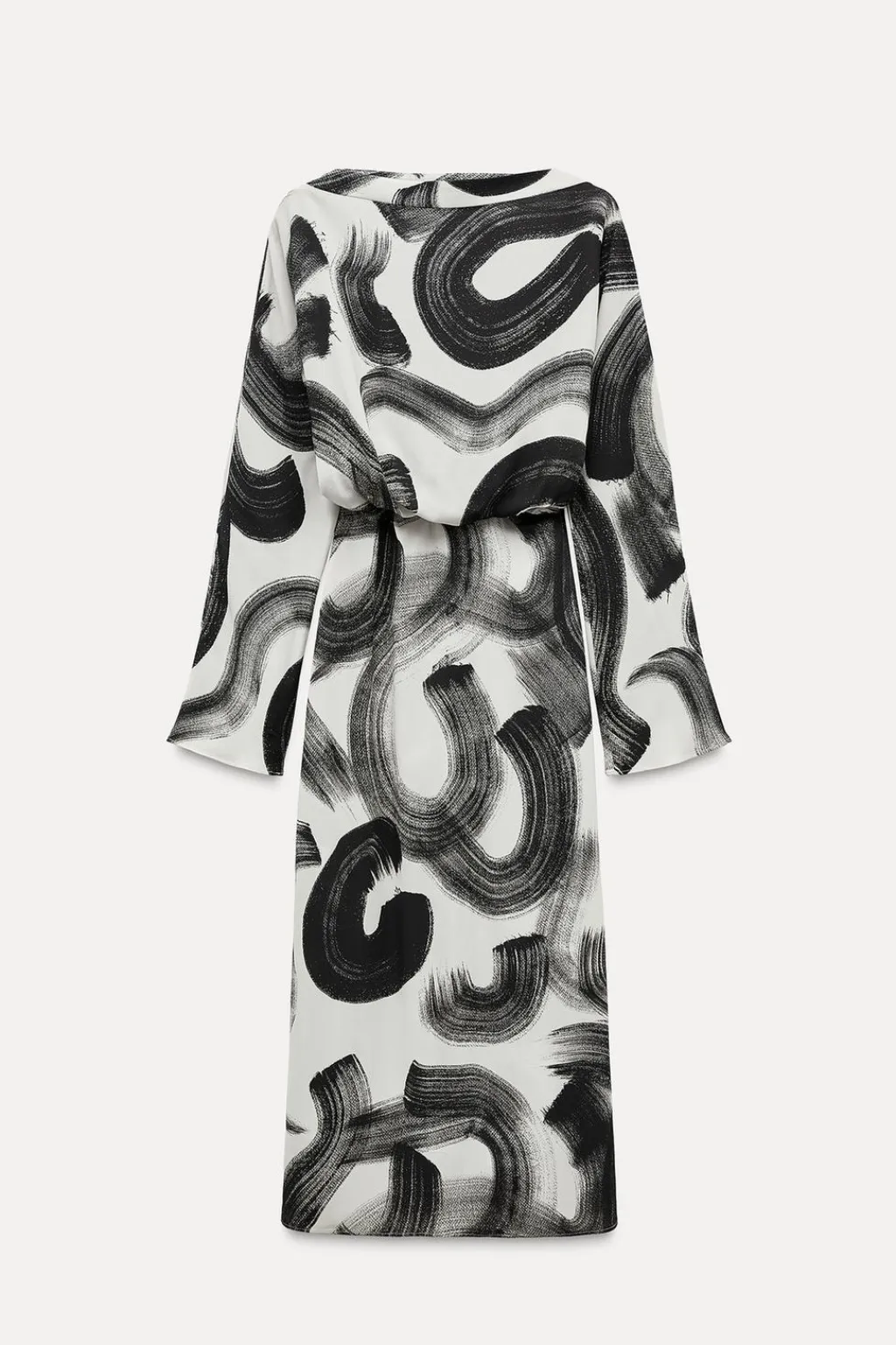 Vestido confeccionado en hilatura de viscosa 100%. Cuello amplio y manga larga. Detalle de estampación a contraste. Cierre con cremallera oculta en costura.