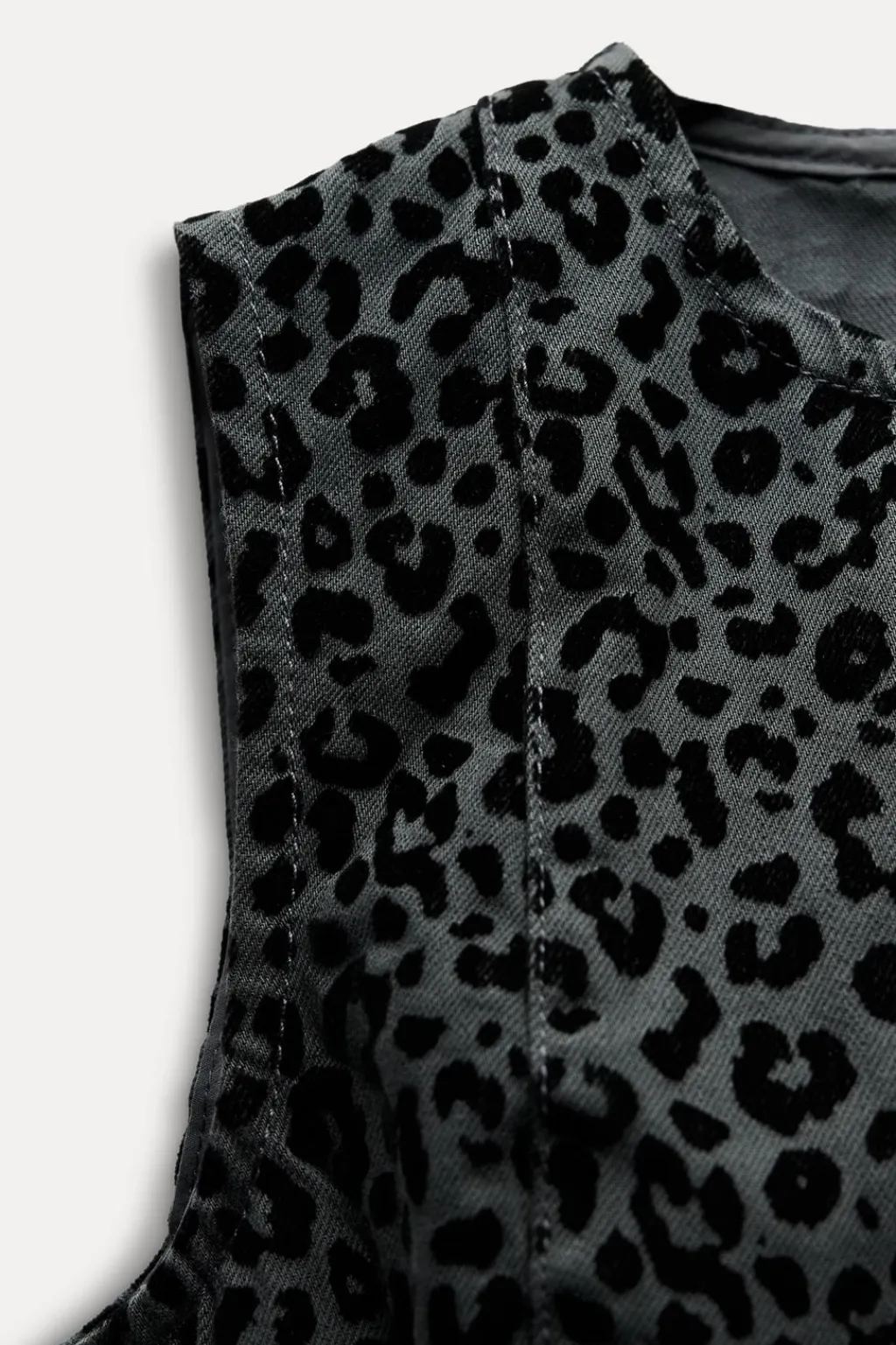Vestido corto de cuello redondo y manga sisa. Detalle de manchas efecto animal flocadas. Cierre en espalda con cremallera oculta en costura.