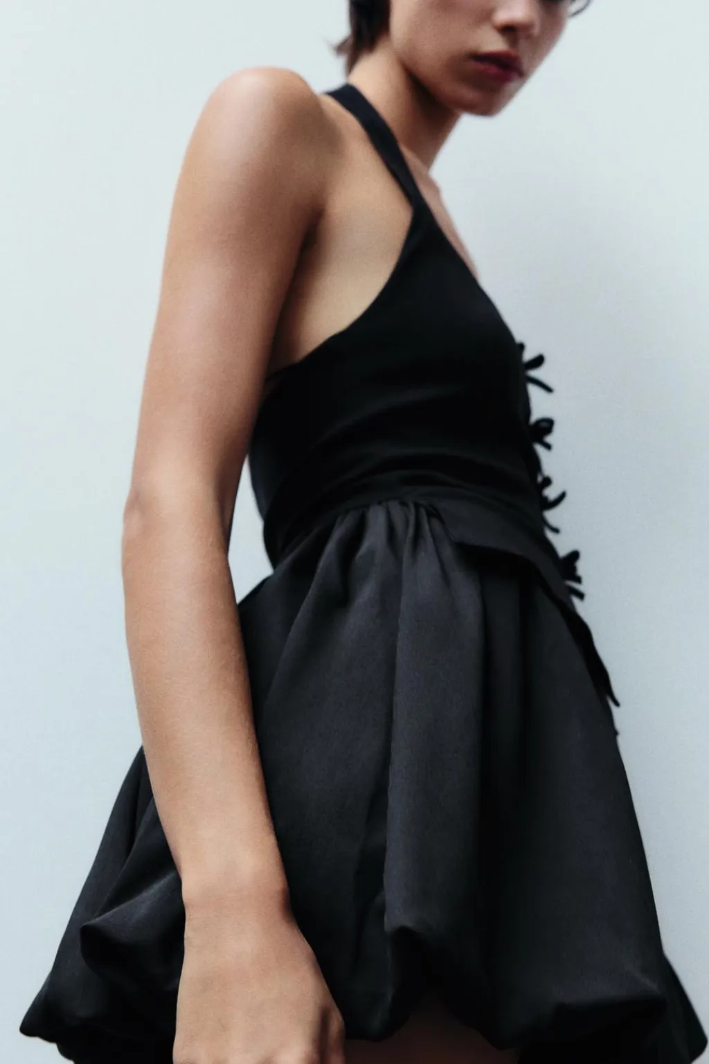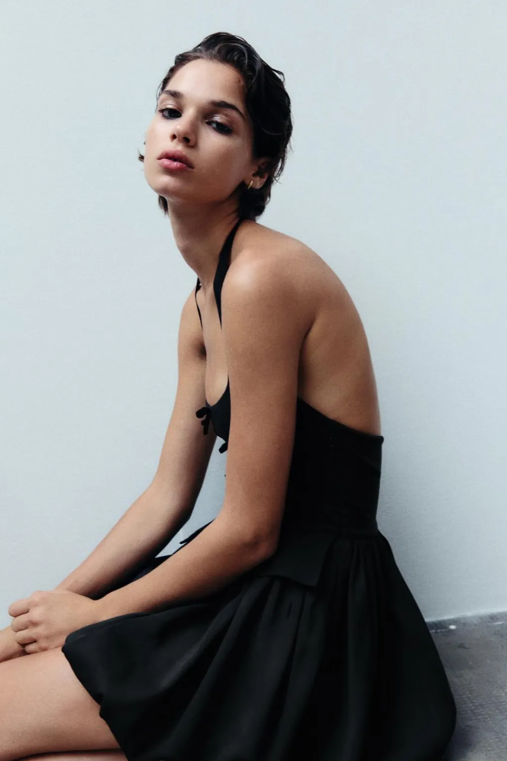 Vestido corto halter con escote redondo. Detalle de lazos en delantero. Bajo acabado en volumen con tejido a tono. Espalda descubierta.