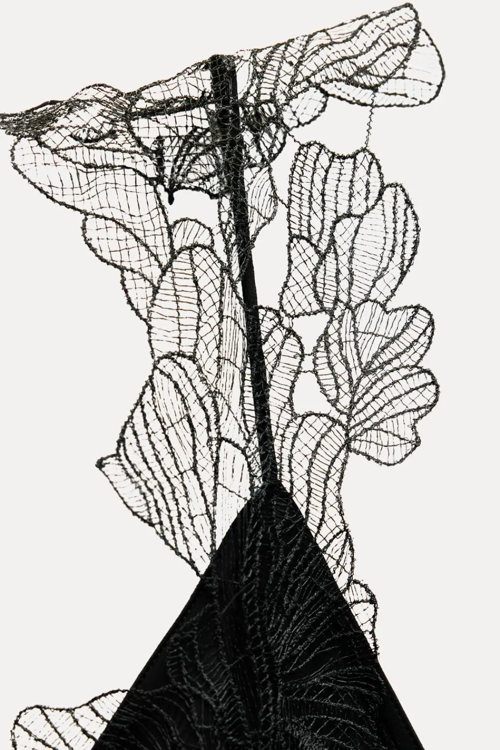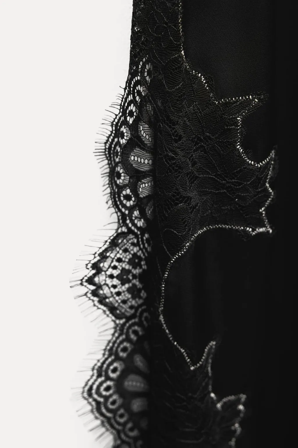 Vestido lencero confeccionado en hilatura de viscosa 100%. Escote pico y tirantes finos. Detalle de aplicación de puntilla a tono e hilo metalizado a contraste. Bajo acabado en línea evasé. Forro interior.