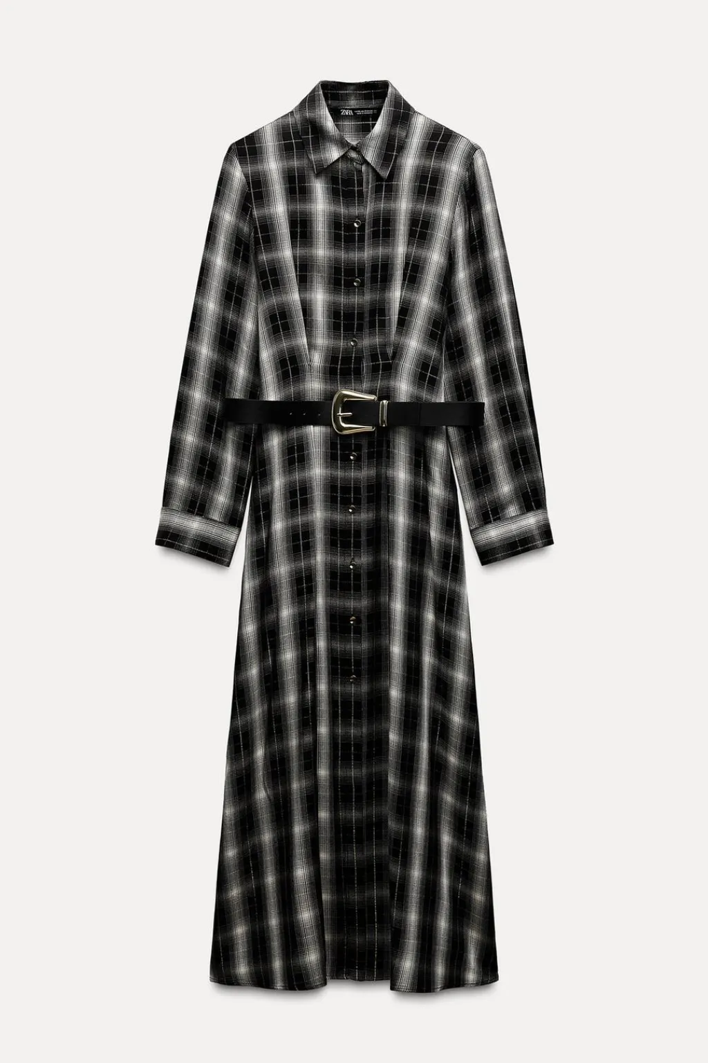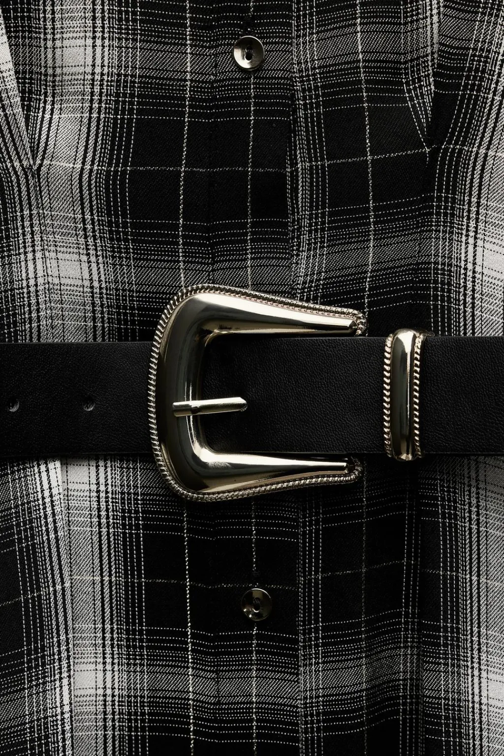Vestido de cuello solapa y manga larga. Cintura entallada con pinzas y cinturón. Detalle de tejido con hilo metalizado. Bolsillos laterales ocultos en costura. Cierre frontal con botones.