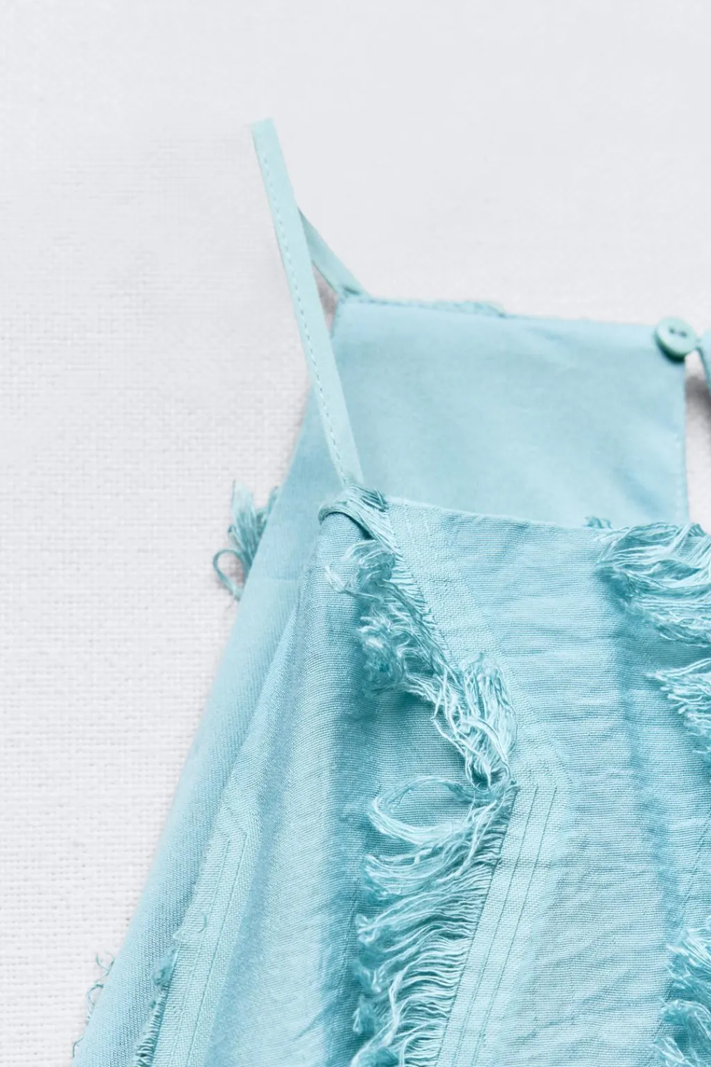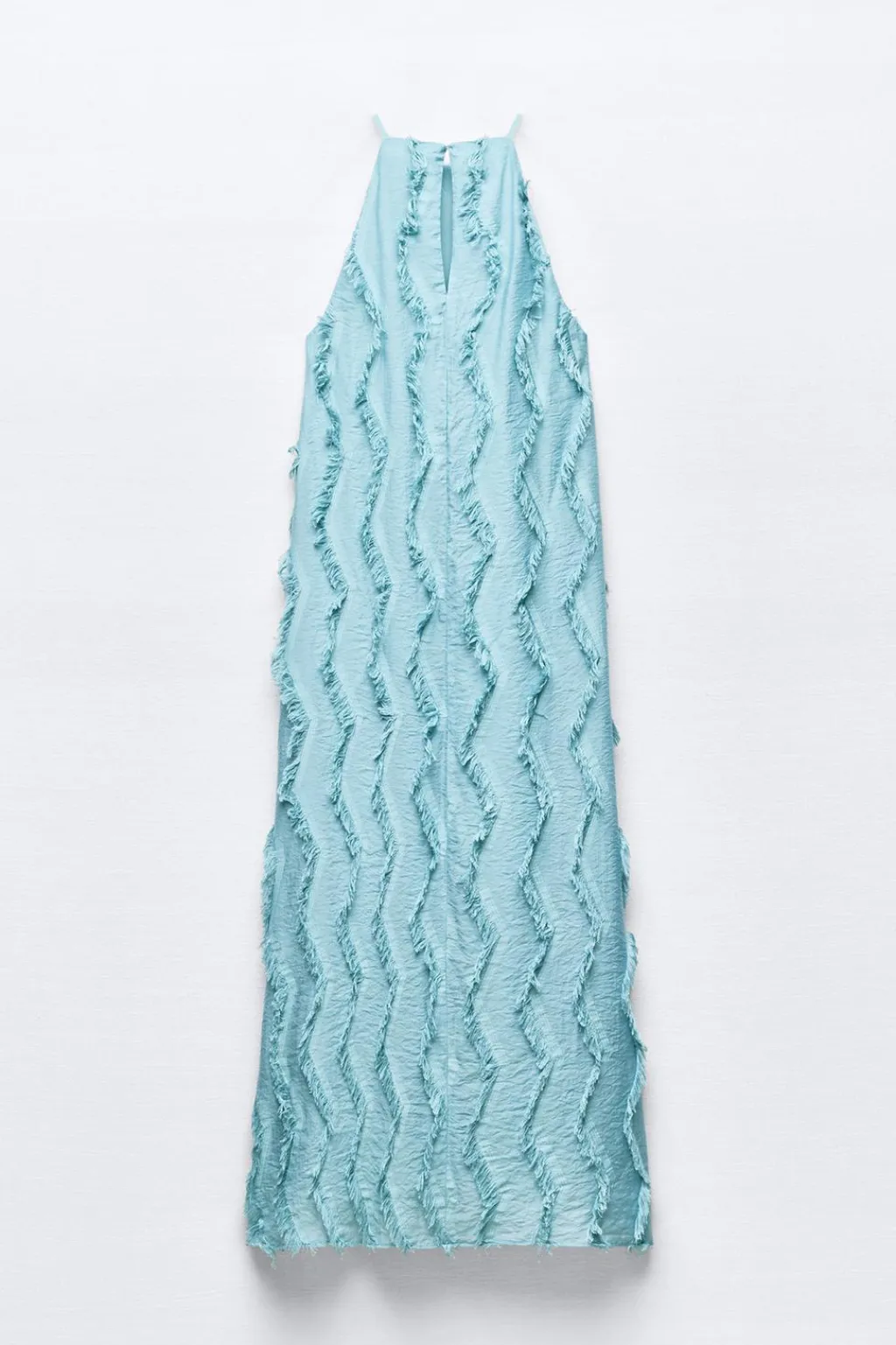 Vestido de cuello halter con forro interior y flecos. Cierre en espalda con abertura y botón.