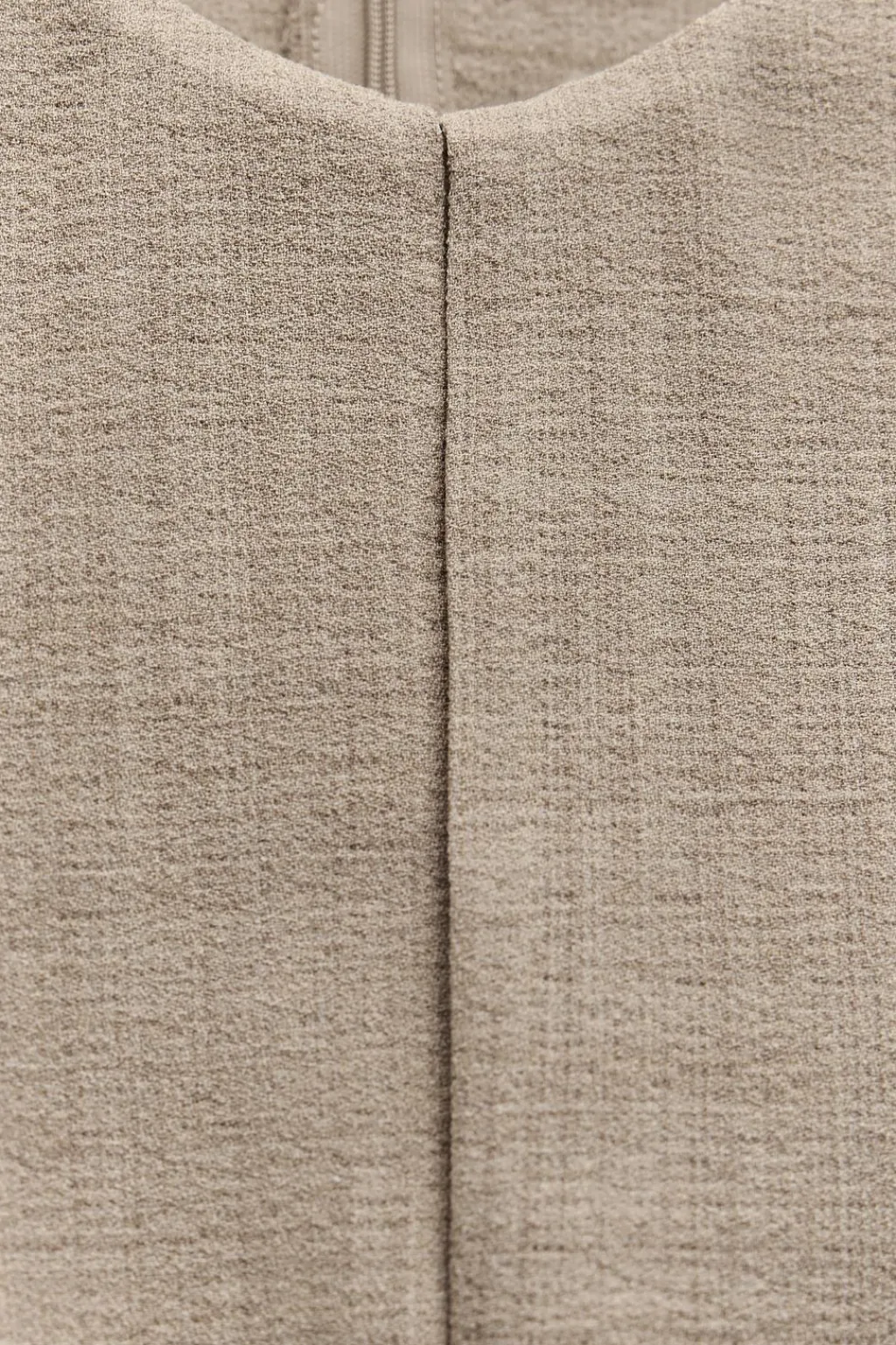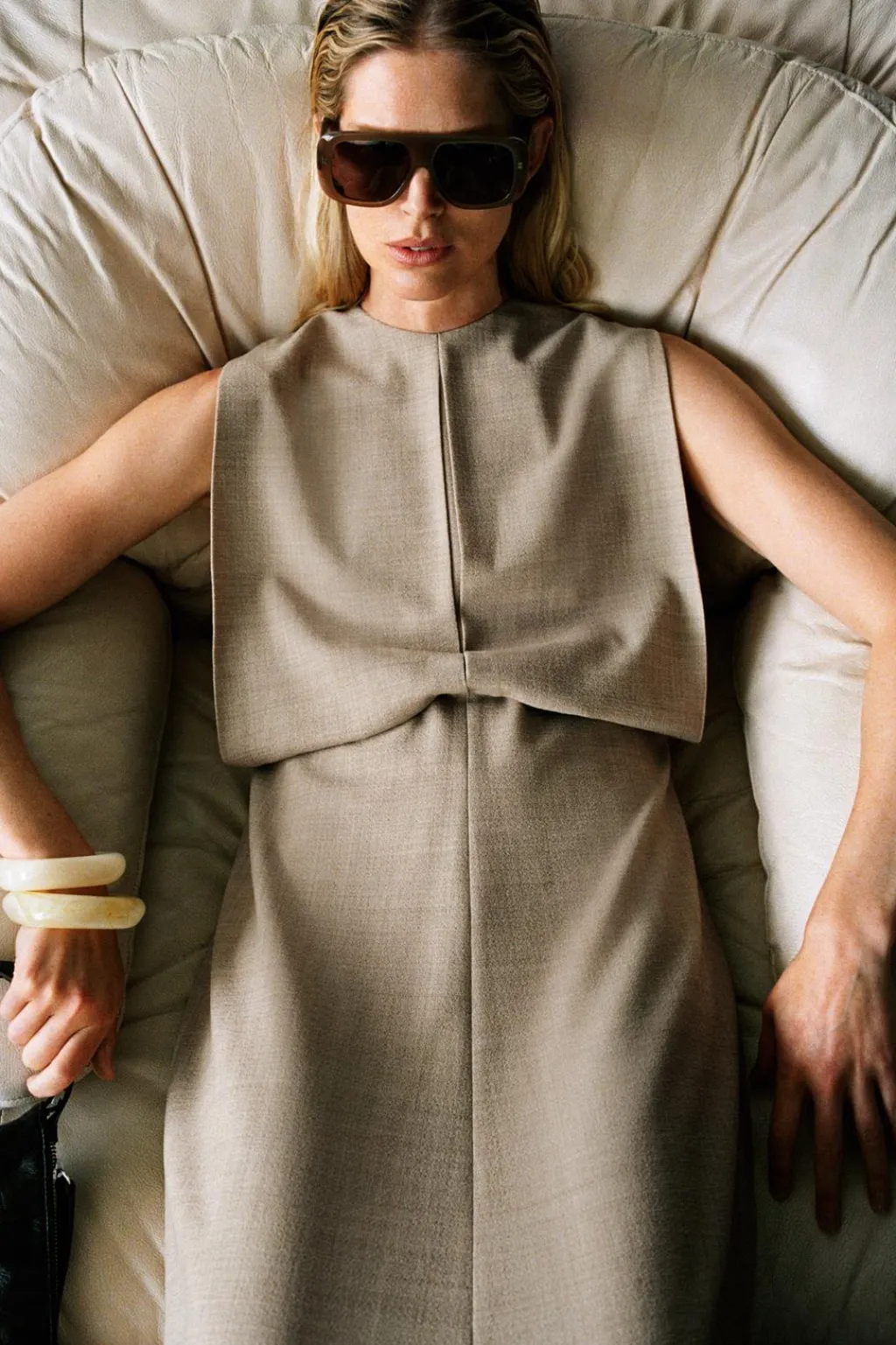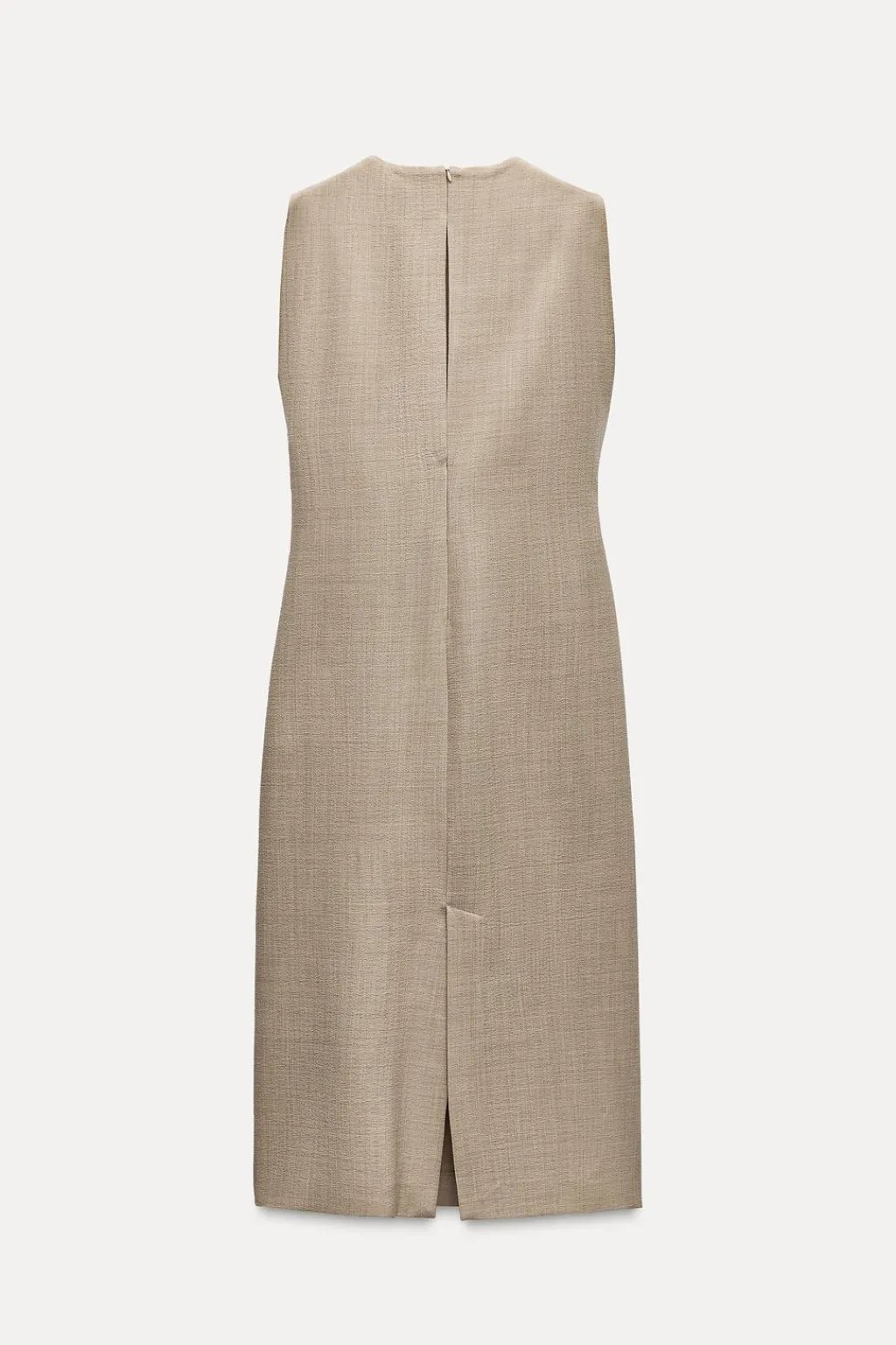 Vestido midi confeccionado en hilatura con lana. Cuello redondo y manga sisa. Detalle de pliegues laterales. Cierre en espalda con cremallera oculta en costura.