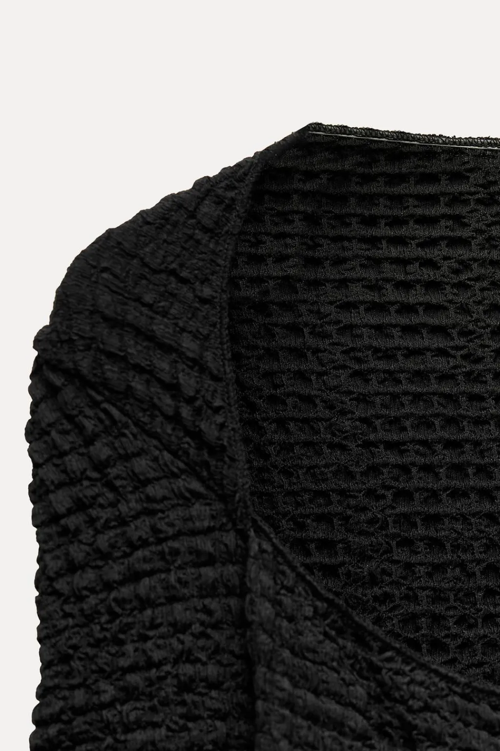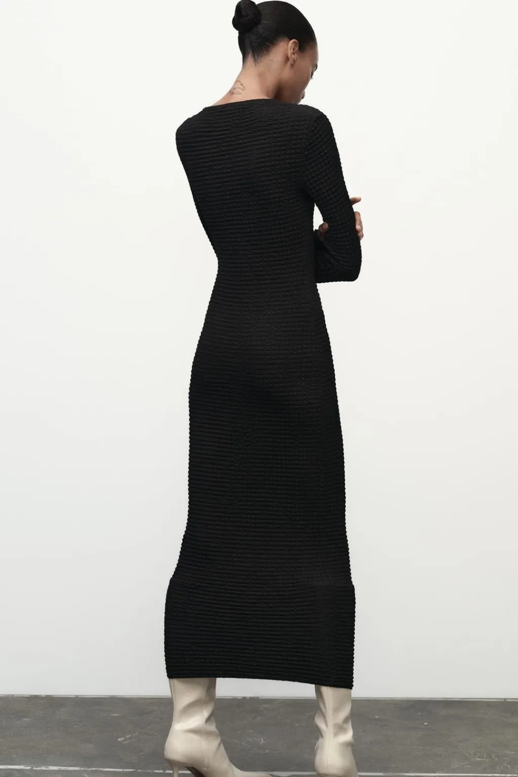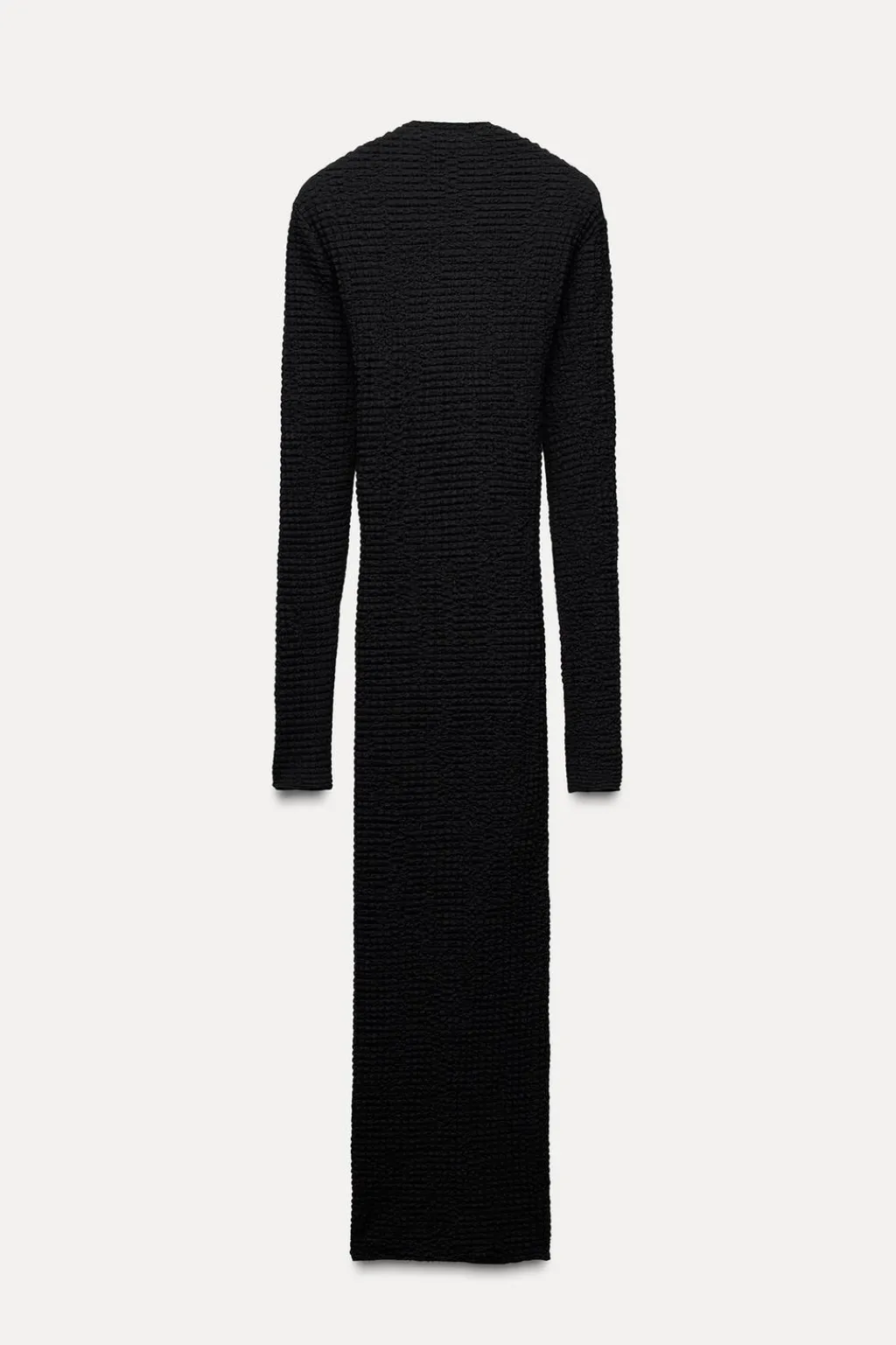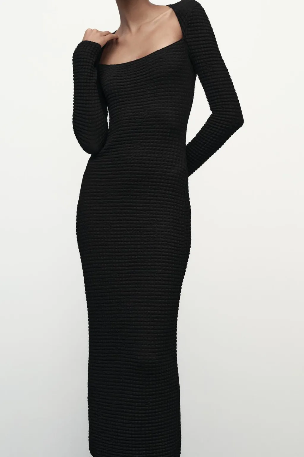 Vestido midi de escote cuadrado y manga larga. Detalle de tejido con textura.