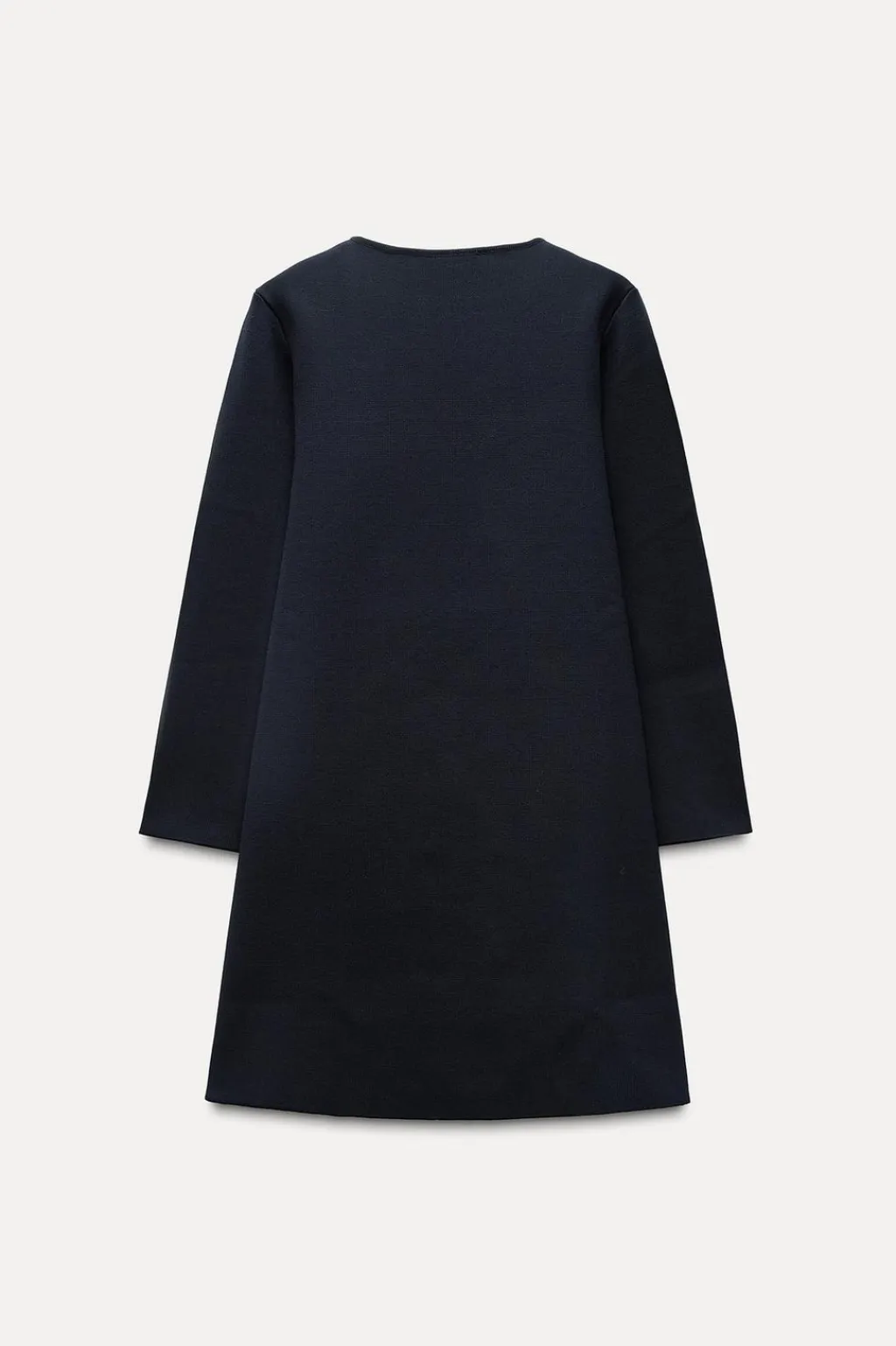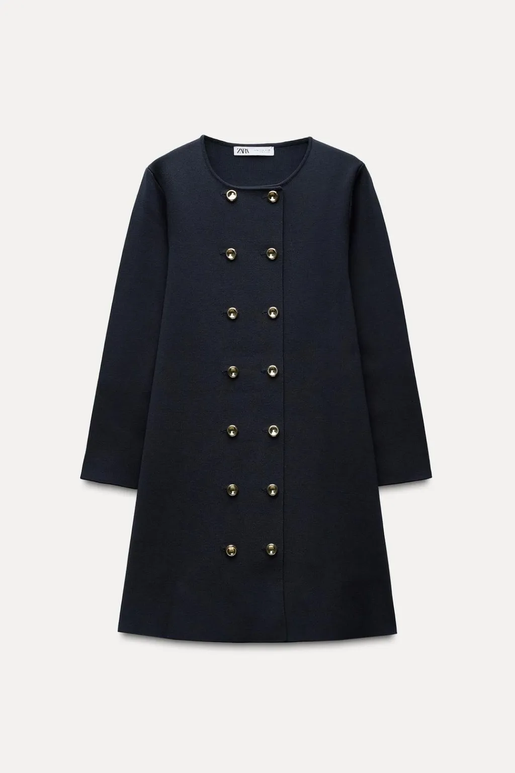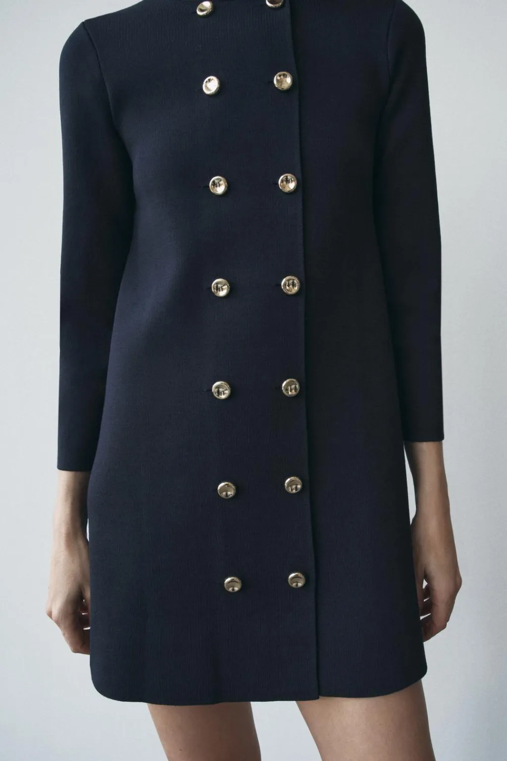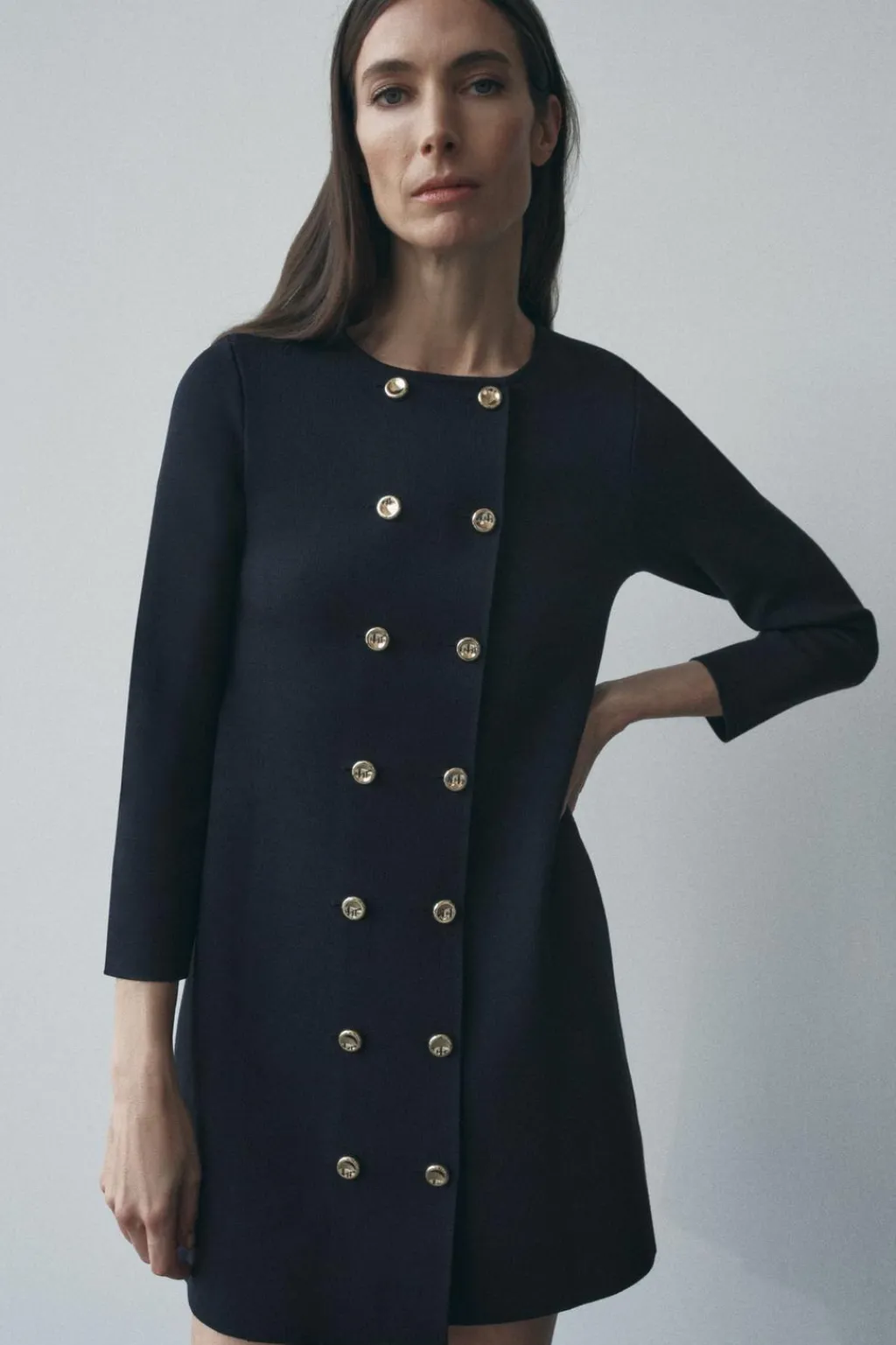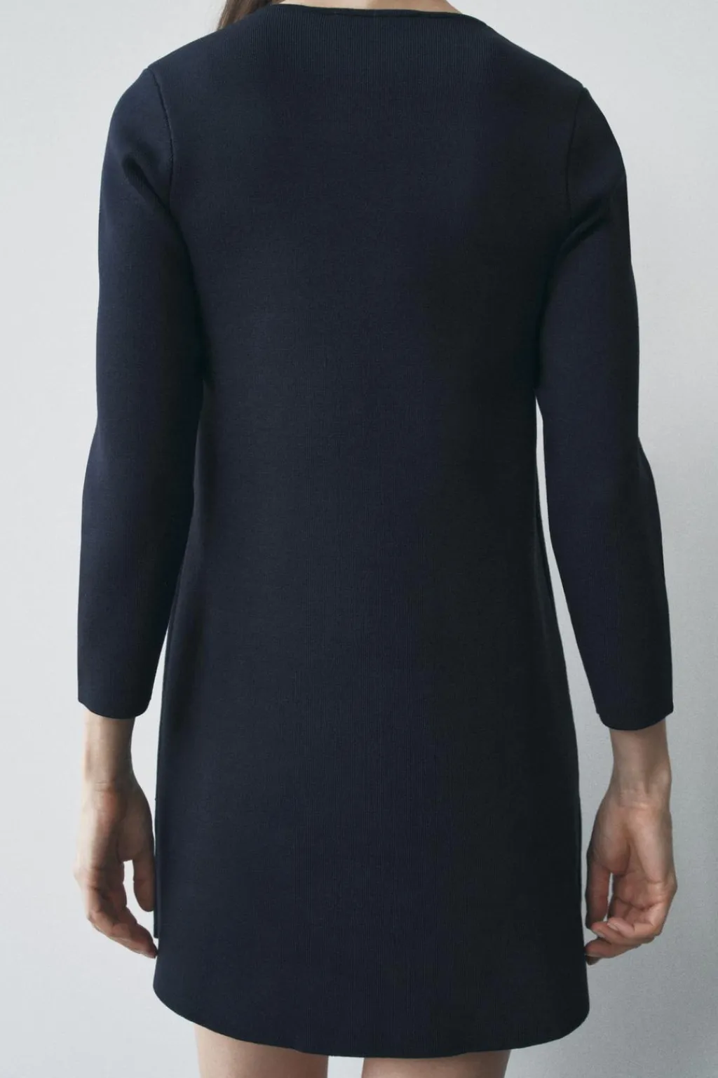 Vestido de punto liso con cuello redondo y manga larga. Cierre frontal cruzado con botones.