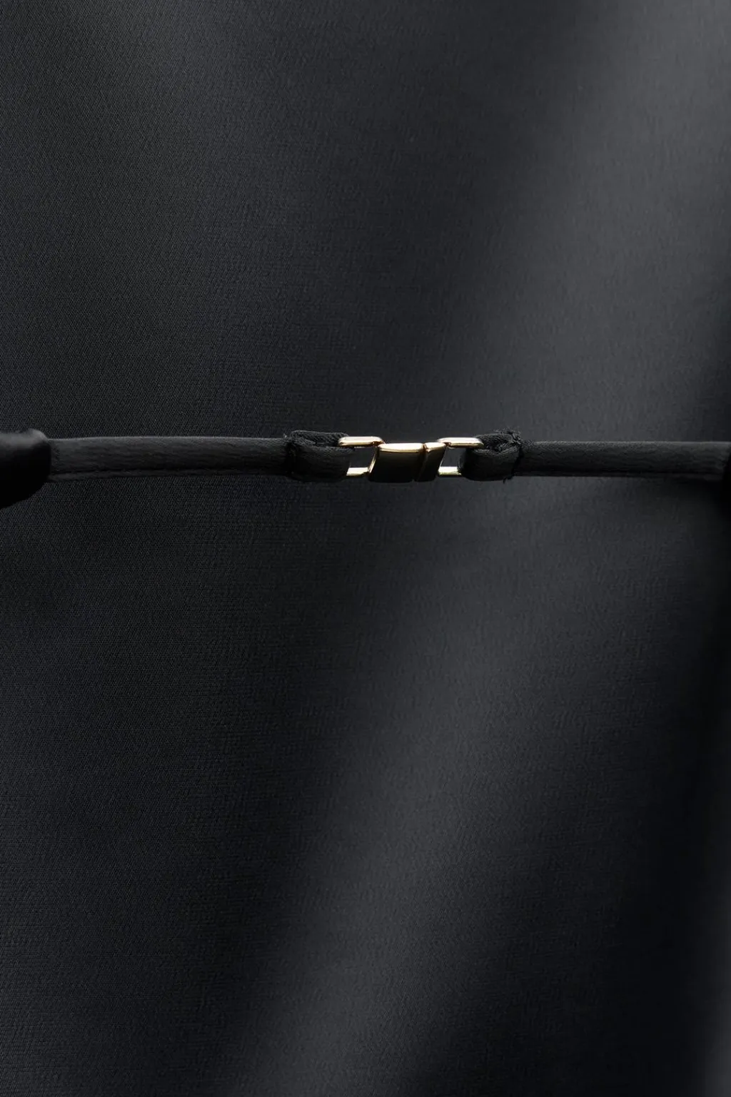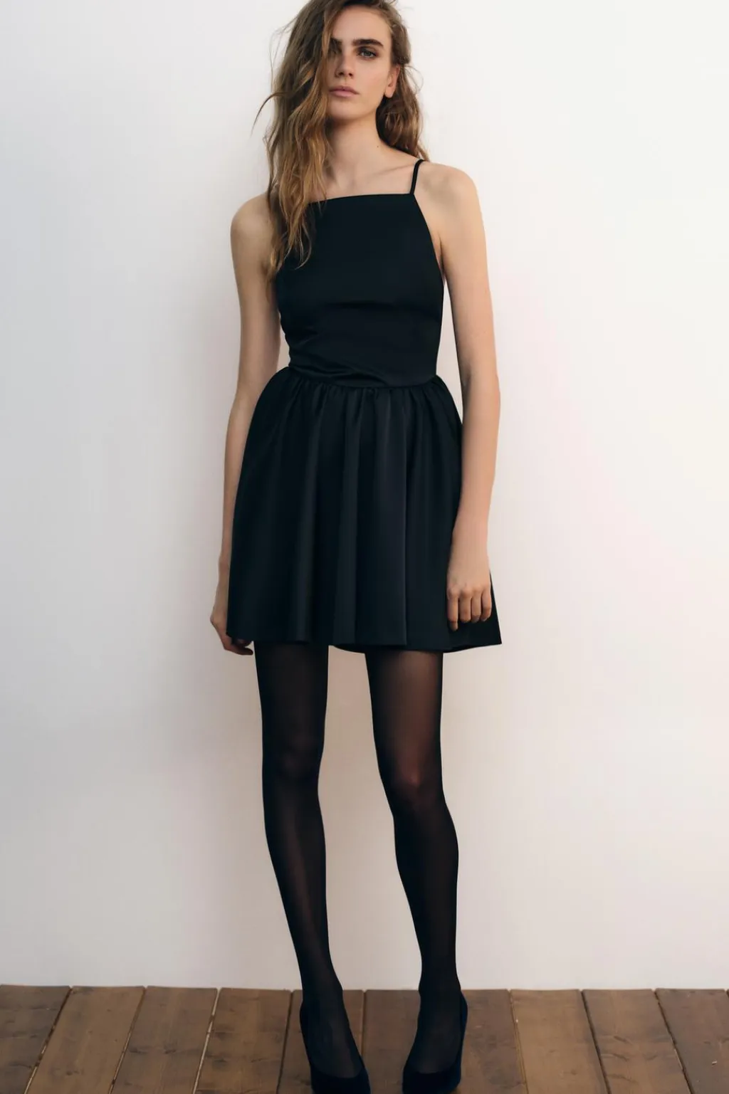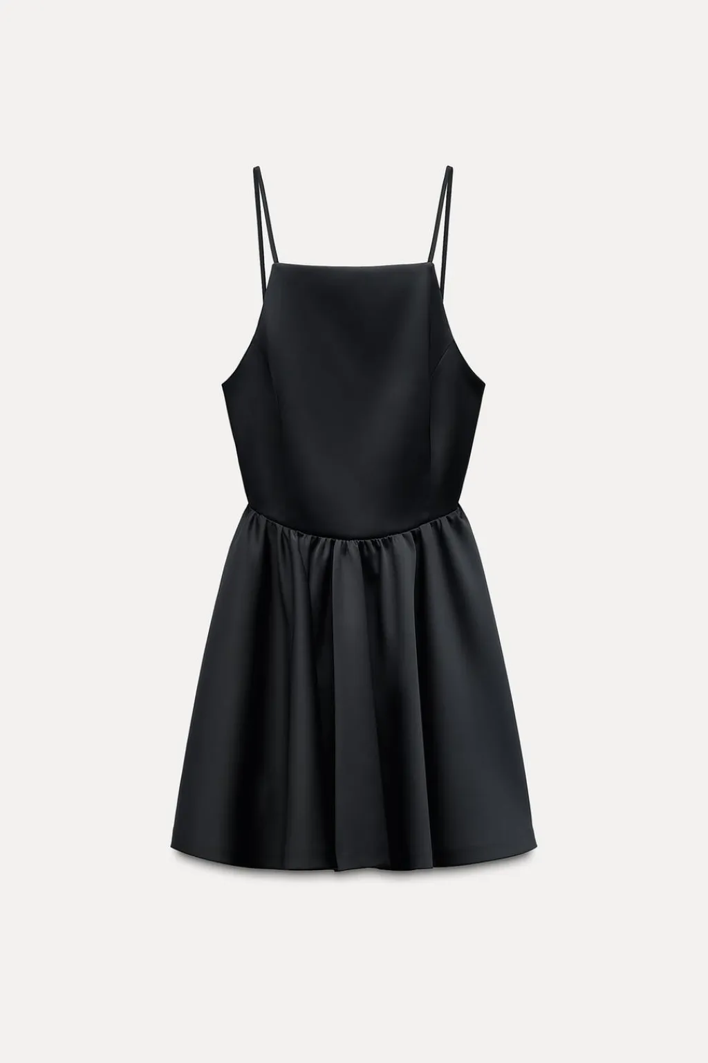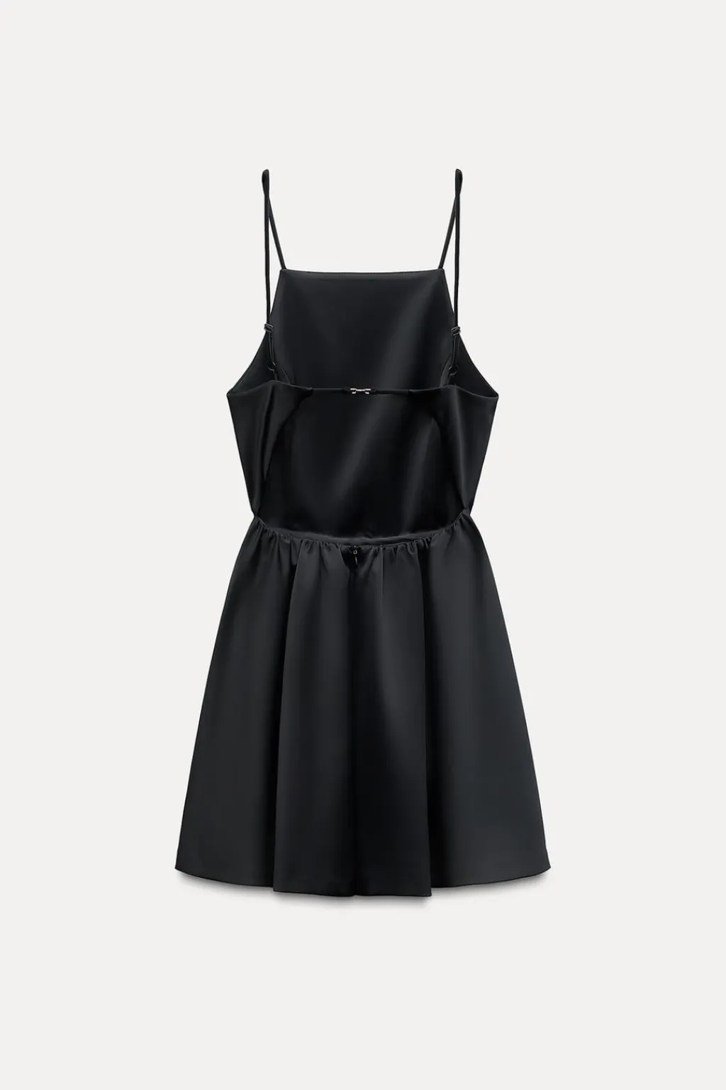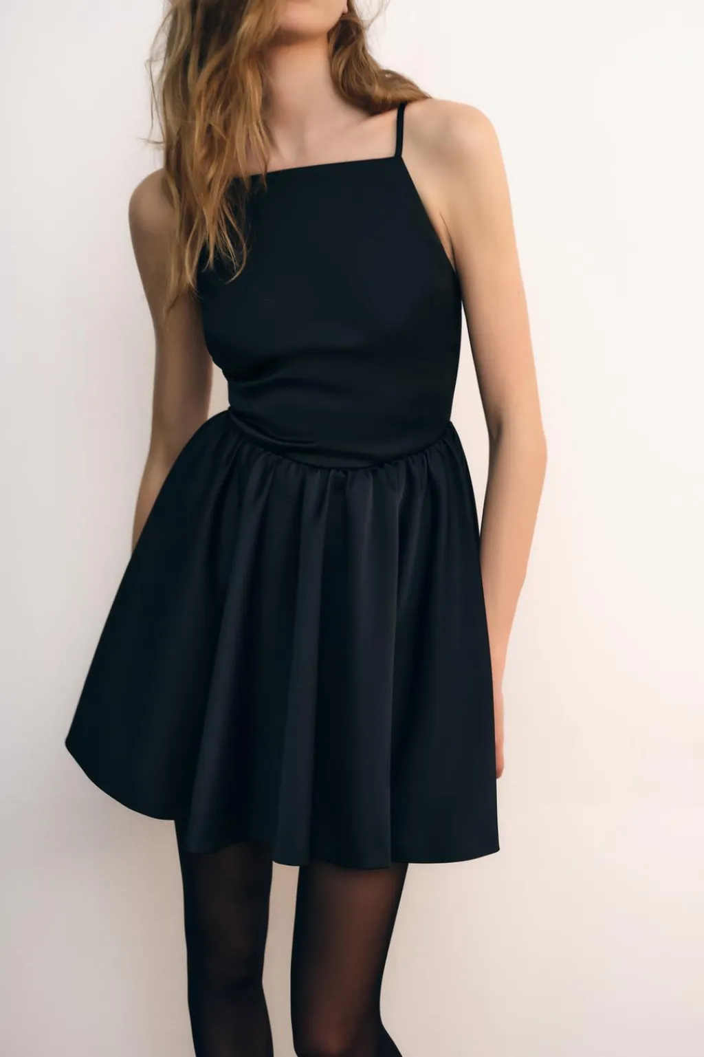Vestido de escote recto y tirantes finos ajustables. Espalda descubierta. Cintura entallada y bajo en evasé. Cierre trasero con cremallera oculta en costura y gancho.