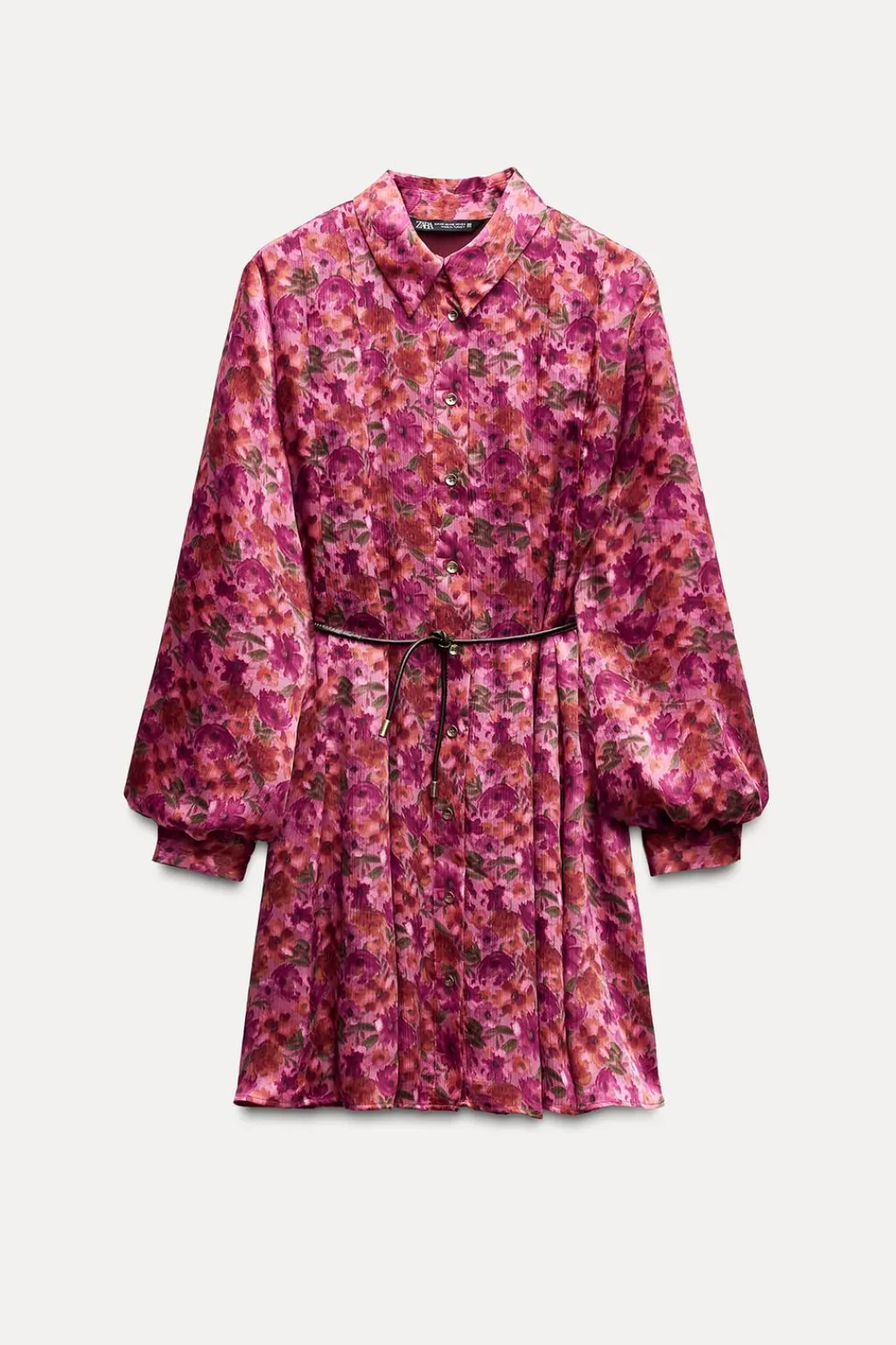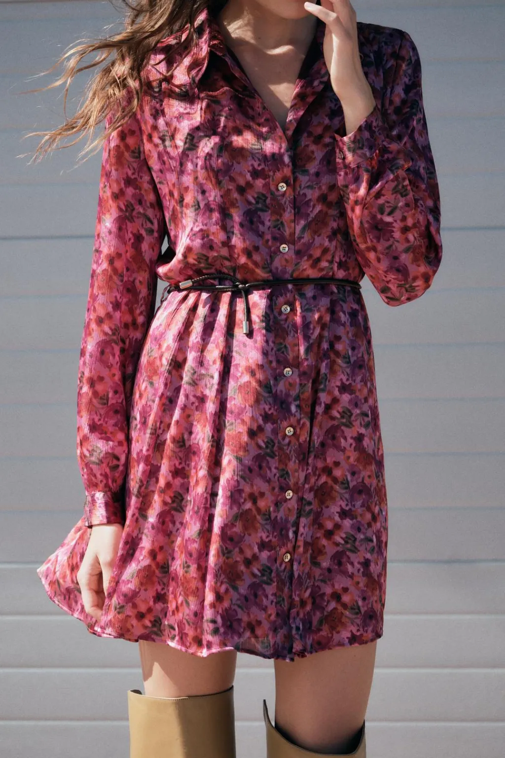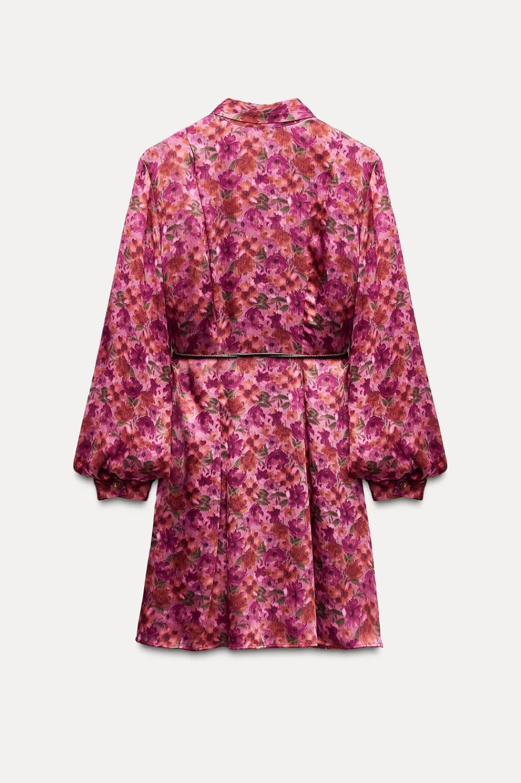 Vestido satinado de cuello solapa y manga larga. Detalle de cinturón efecto piel. Forro interior. Cierre frontal con botones.