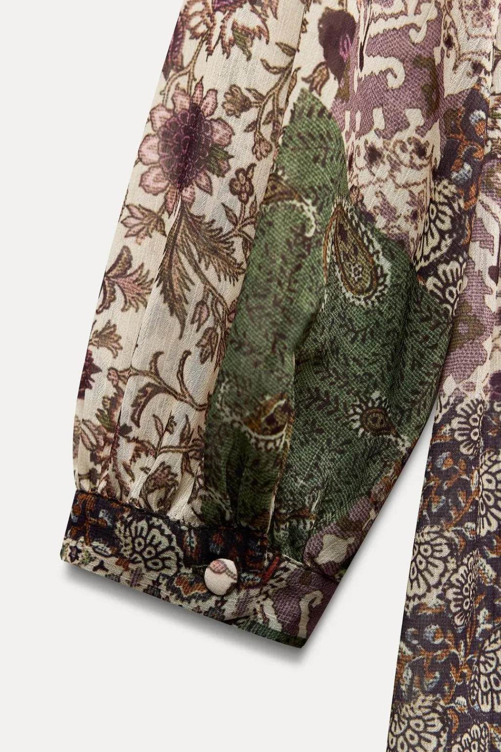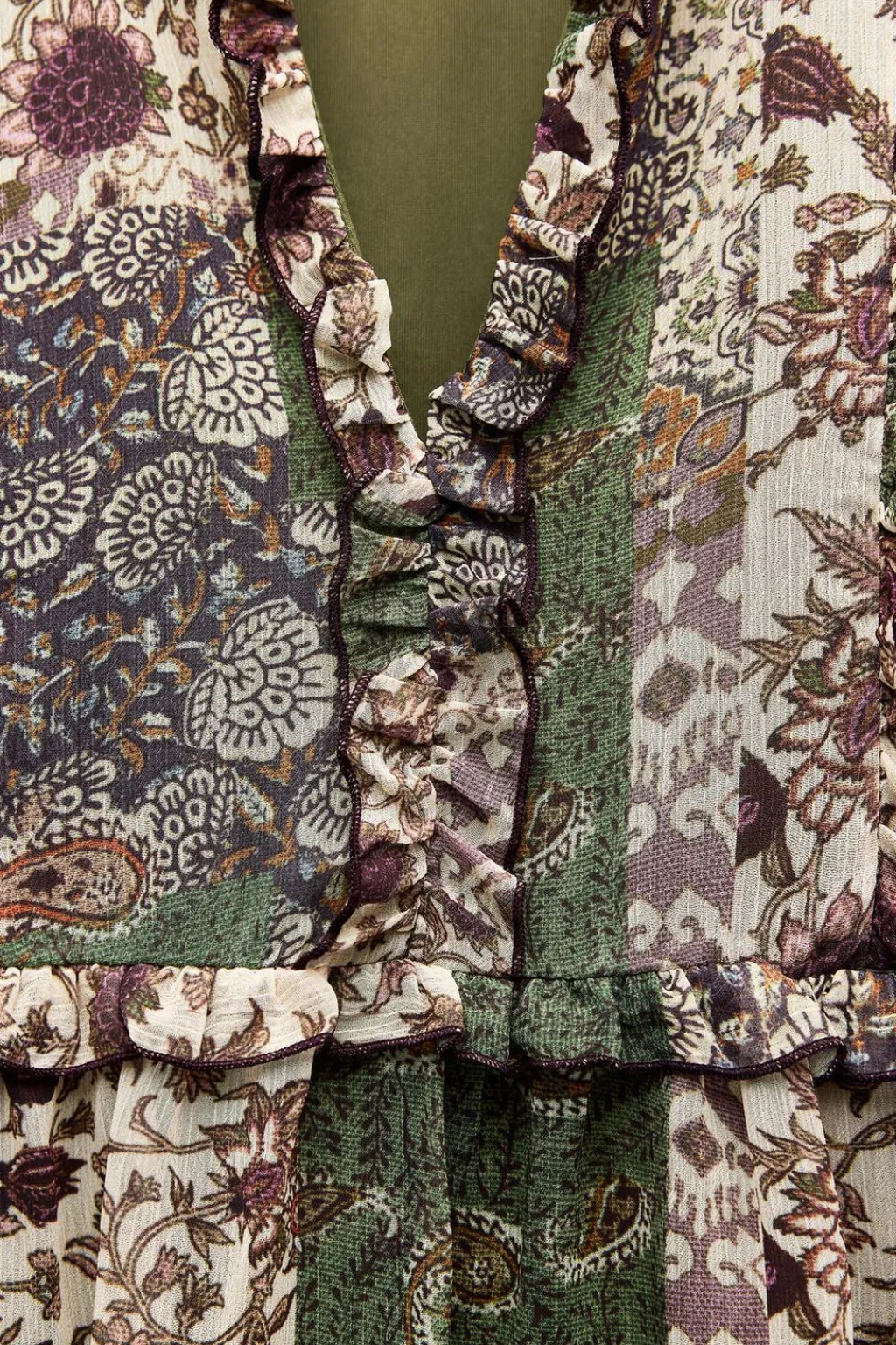 Vestido de escote pico y manga larga. Detalle de acabados con volantes. Forro interior.